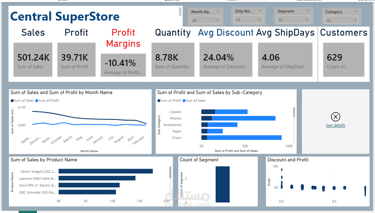 كمان بتوضح تطور المبيعات والأرباح على مدار الشهور، وبتساعد في مقارنة الأداء بين الفئات والمنتجات المختلفة، مع إمكانية تحليل تأثير الخصومات على الأرباح. تم تصميم اللوحة بحيث تكون سهلة الاستخدام وتدعم الفلترة حسب أكثر من عنصر زي الشهر أو الفئة.