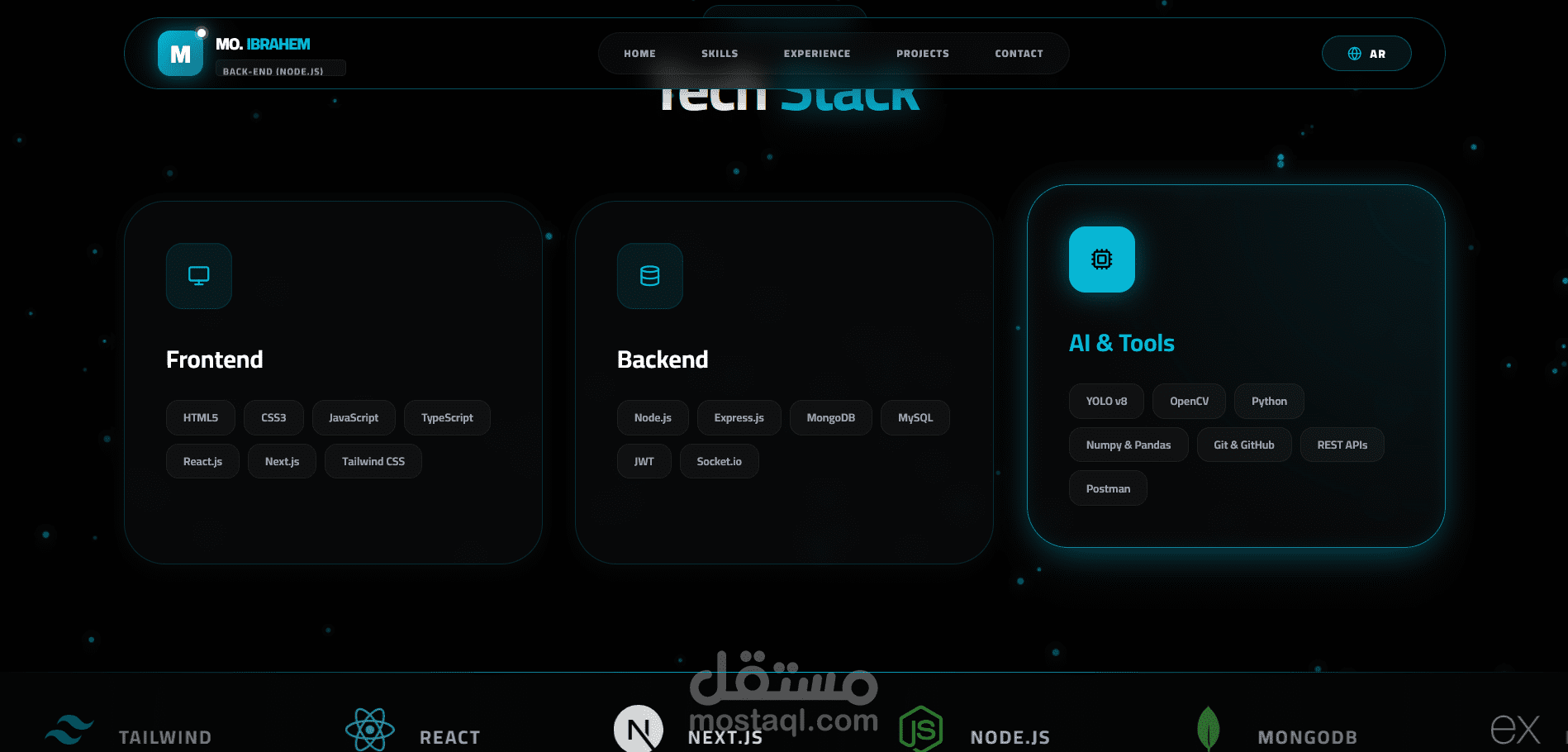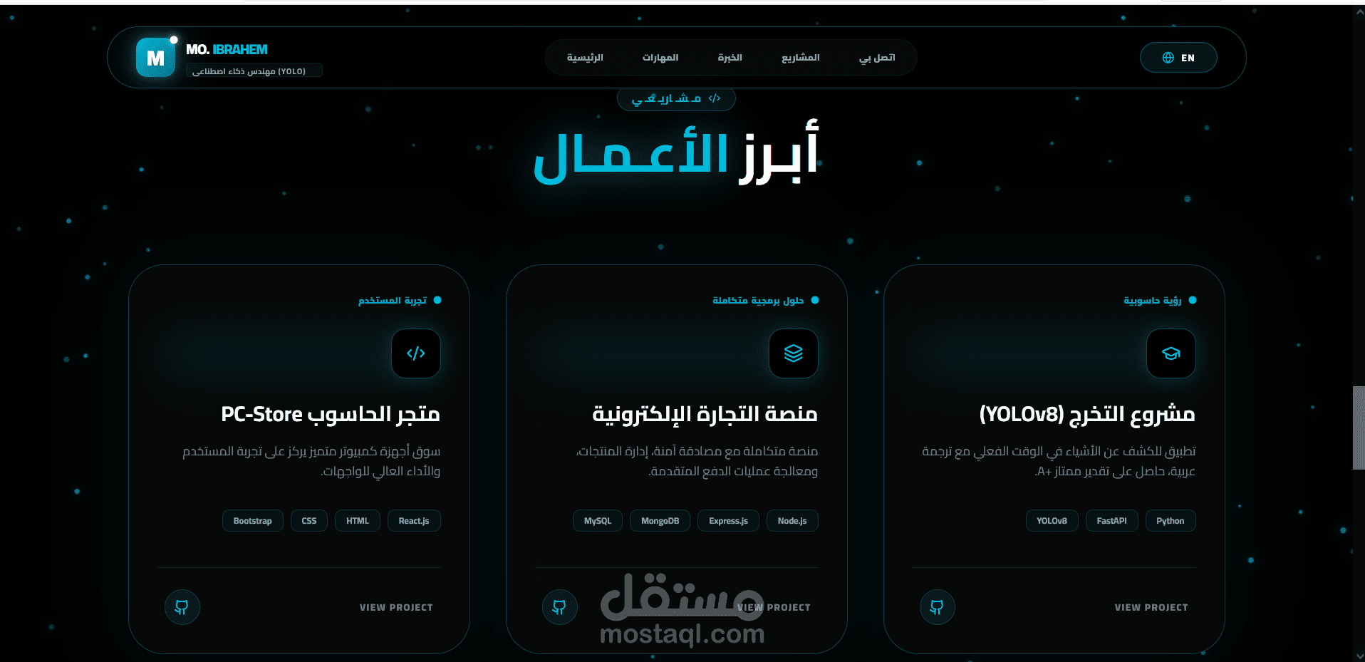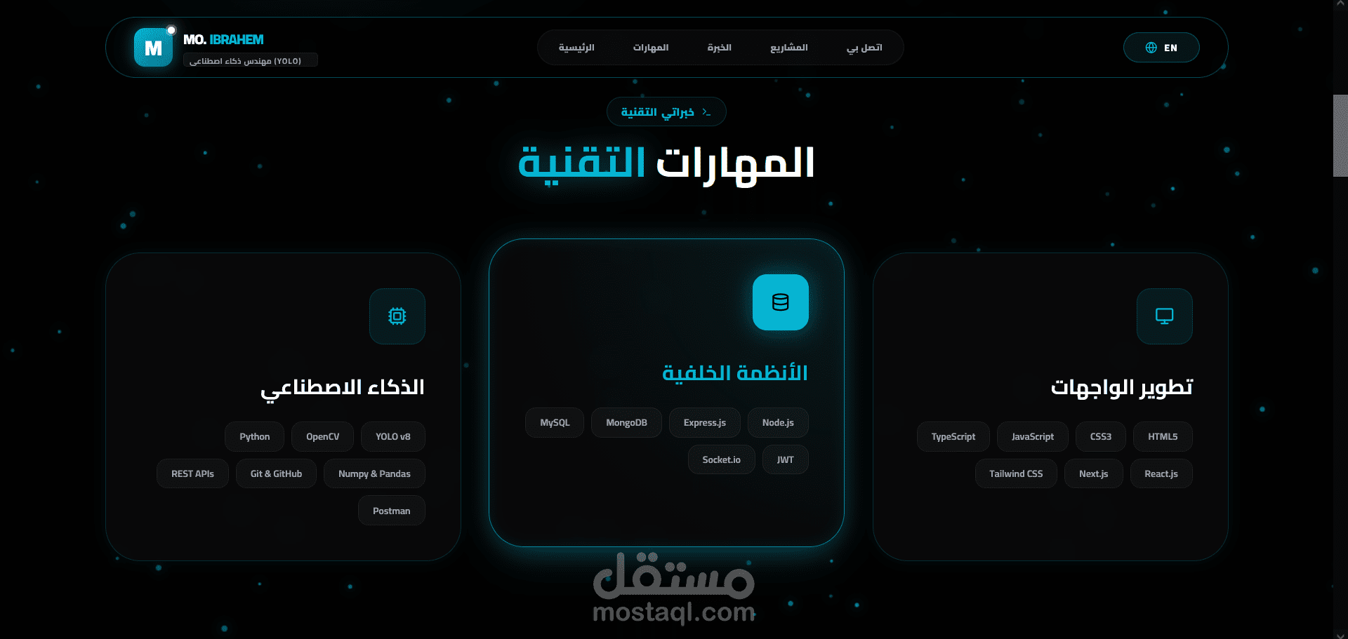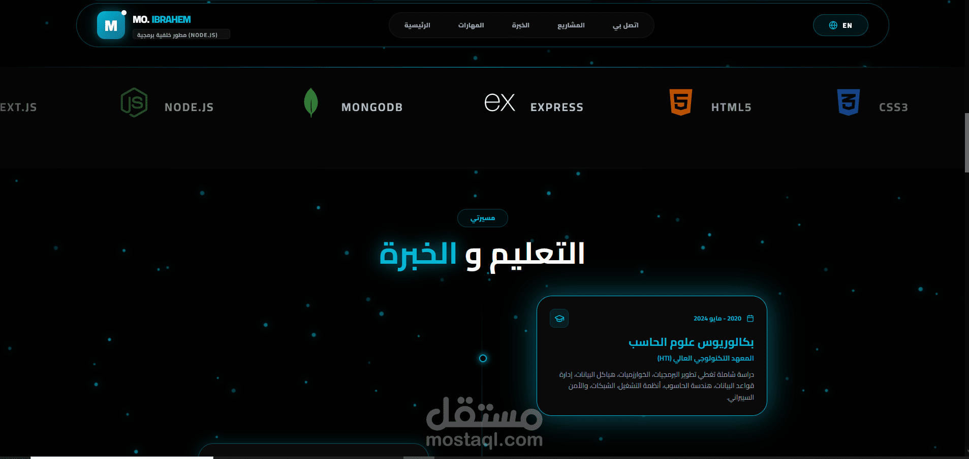 لوحة التحكم (Backend): ربطت الموقع بـ Node.js & MongoDB، بحيث أقدر أضيف أو أعدل أي مشروع أو مهارة من لوحة تحكم خاصة بيا فوراً، من غير ما ألمس الكود كل شوية.