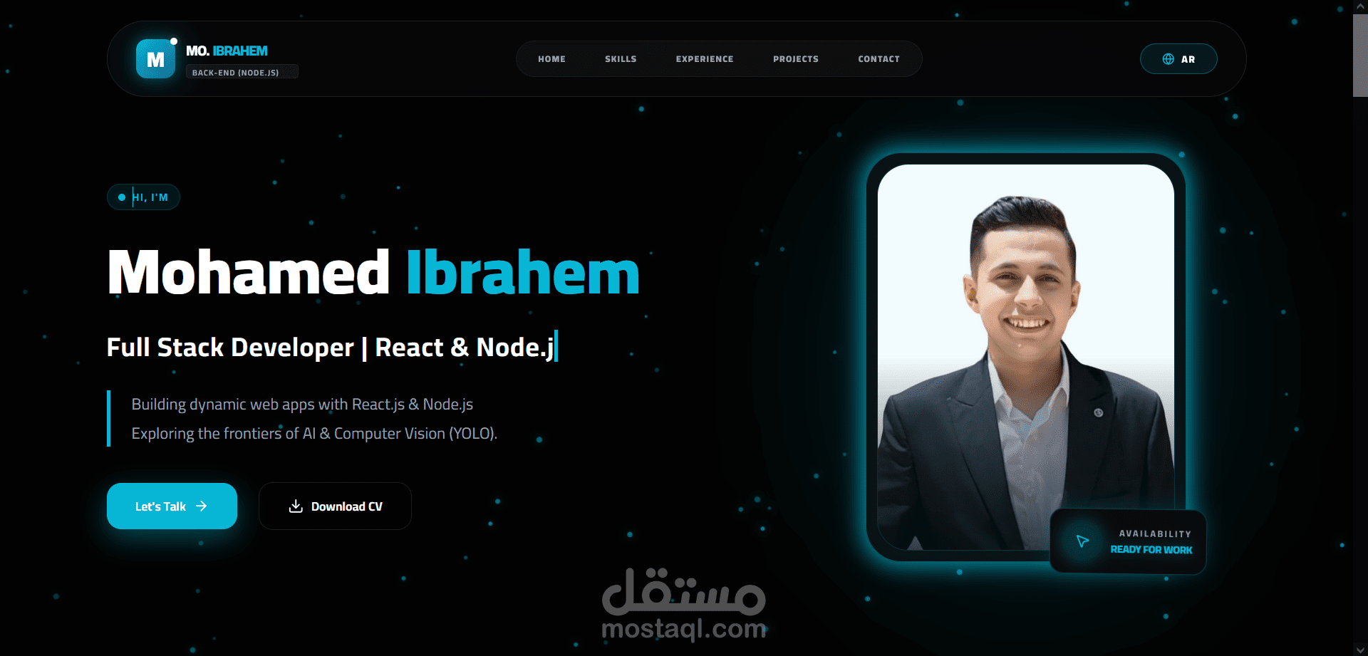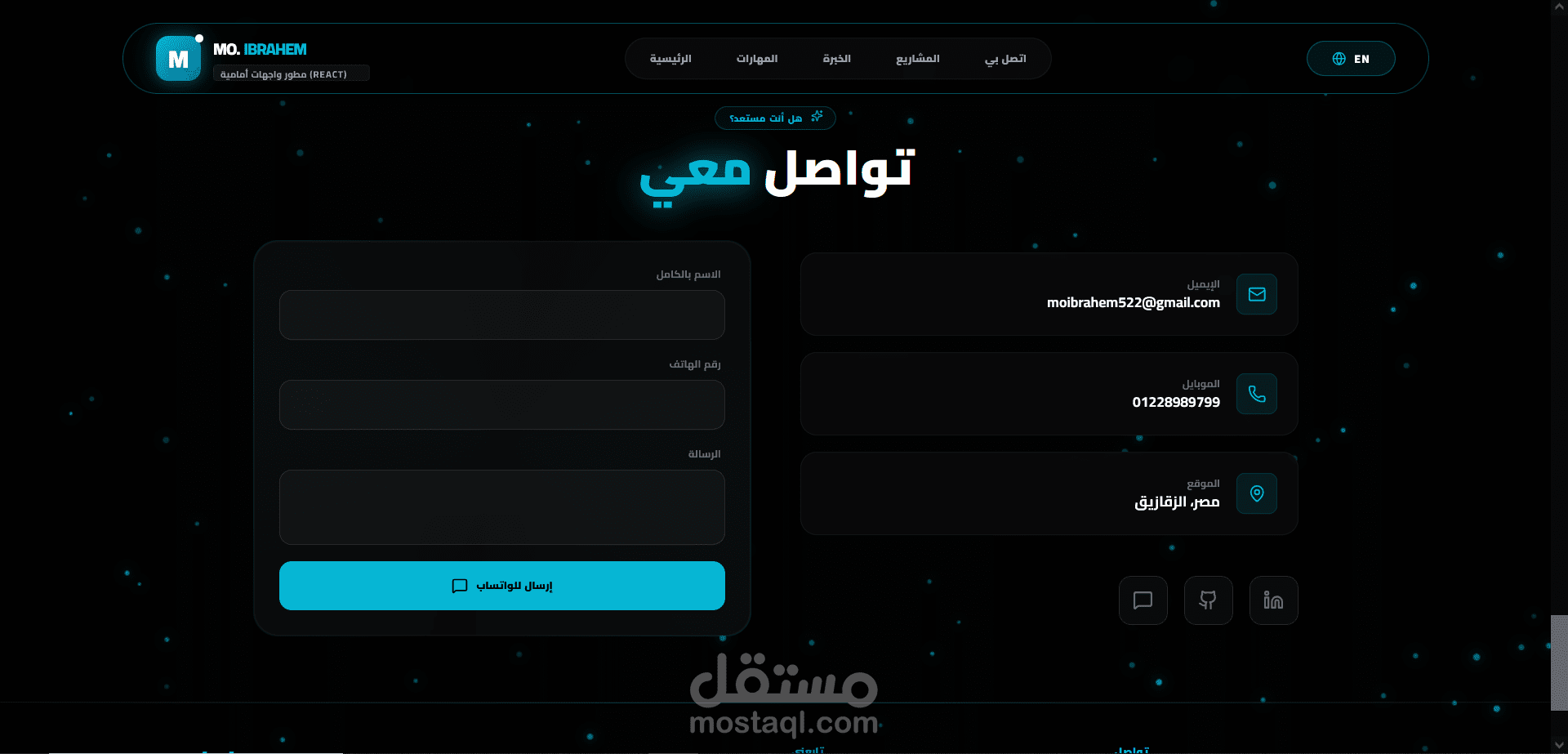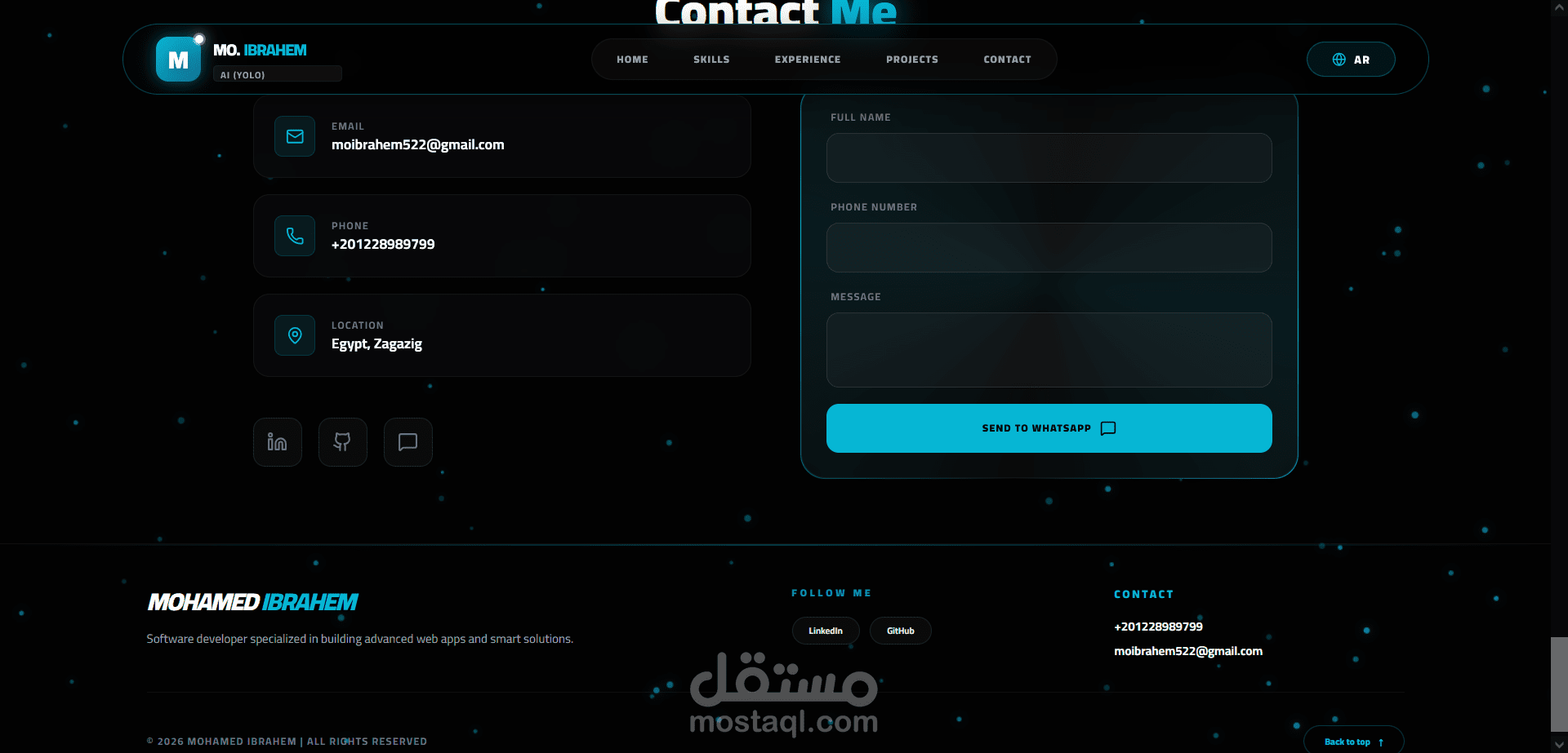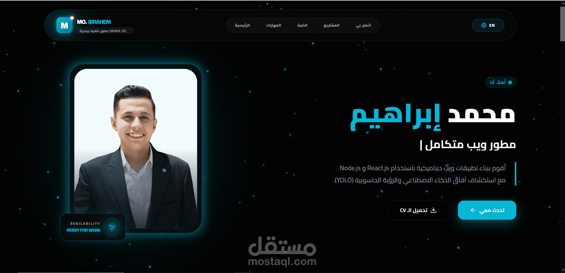 لوحة التحكم (Backend): ربطت الموقع بـ Node.js & MongoDB، بحيث أقدر أضيف أو أعدل أي مشروع أو مهارة من لوحة تحكم خاصة بيا فوراً، من غير ما ألمس الكود كل شوية.