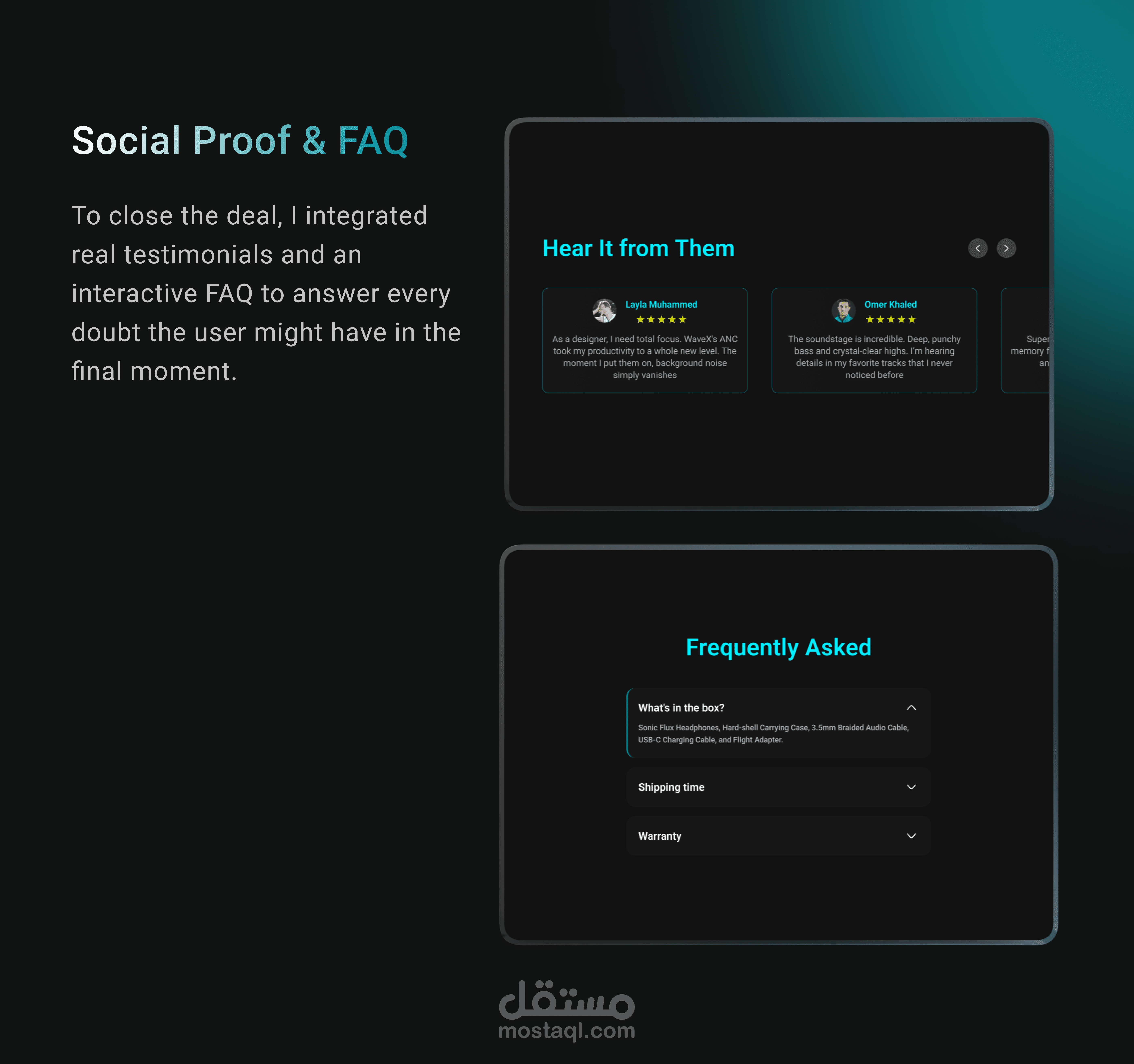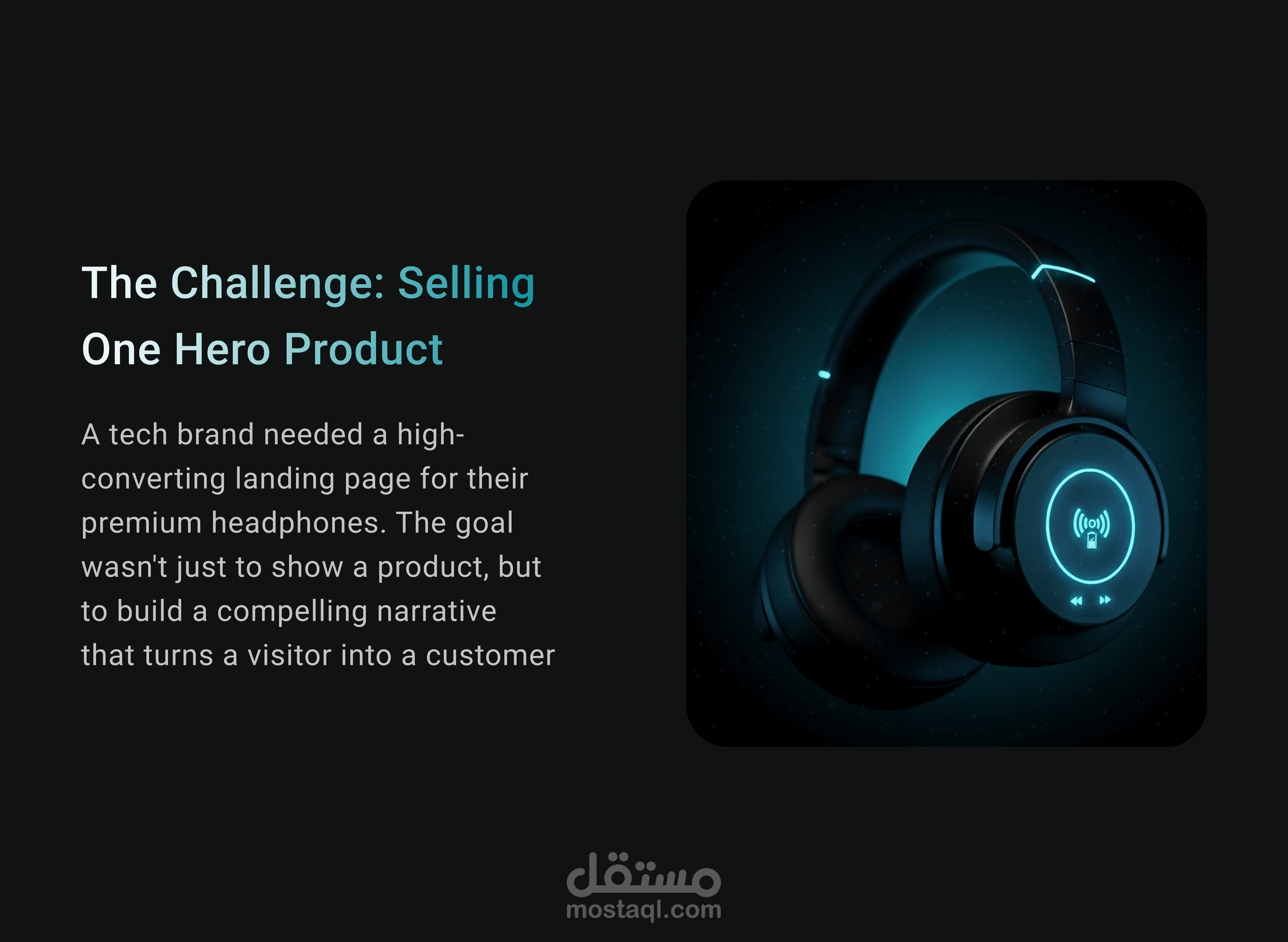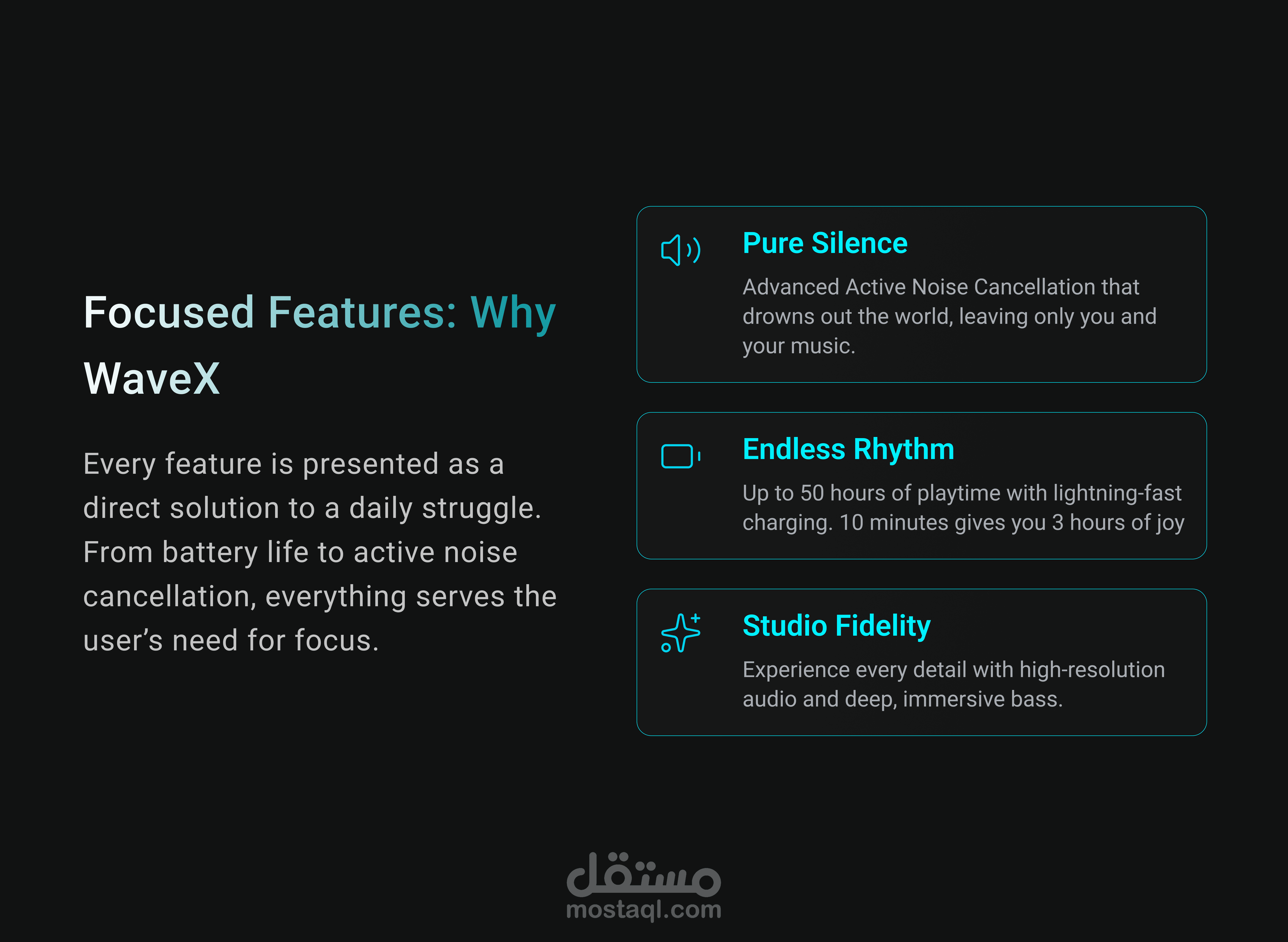 في هذا المشروع، قمت بتصميم صفحة هبوط متكاملة لمنتج واحد (سماعة WaveX) بهدف تحويل الزوار إلى عملاء دائمين من خلال دمج سيكولوجية التصميم مع الهوية البصرية العصرية.