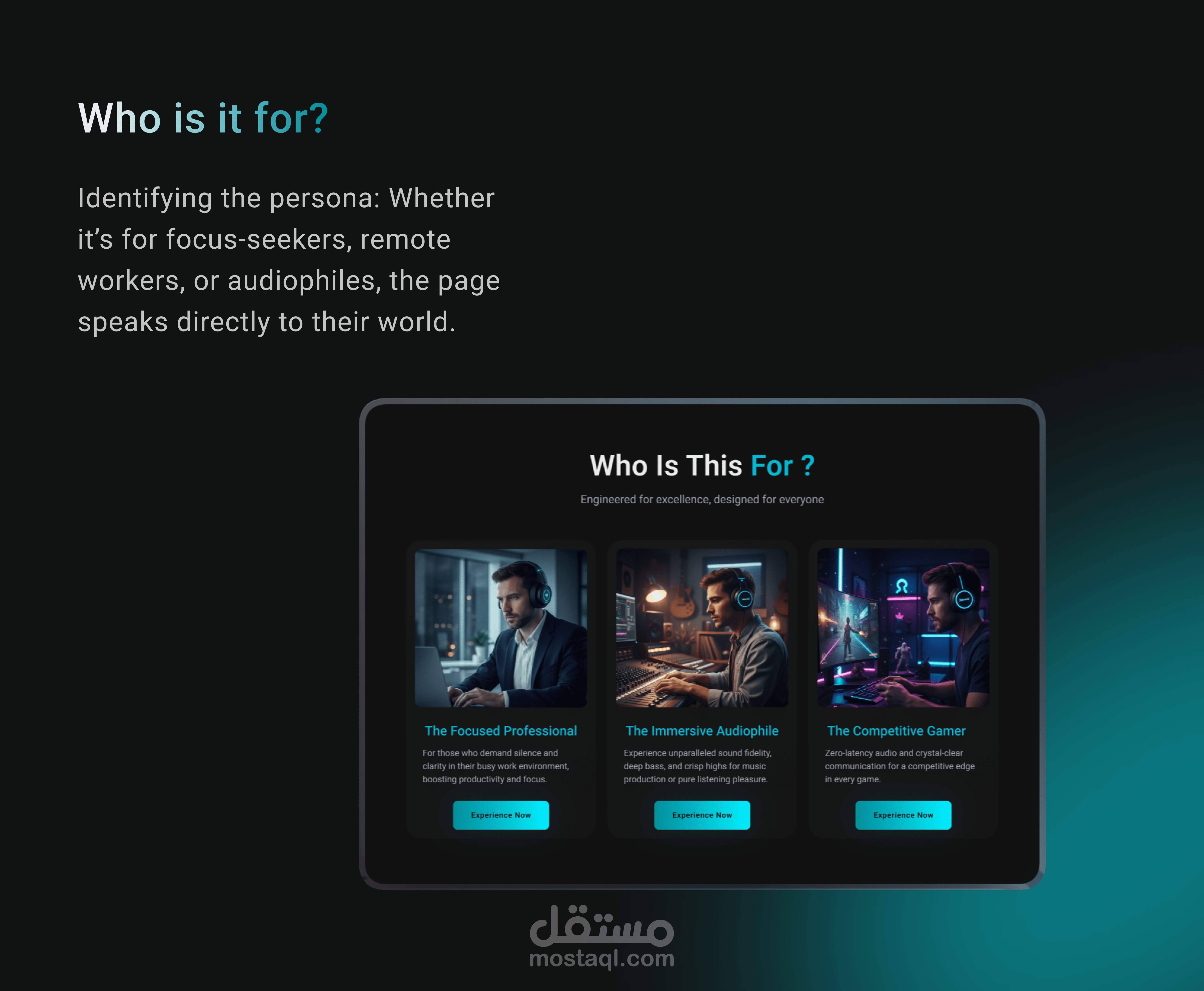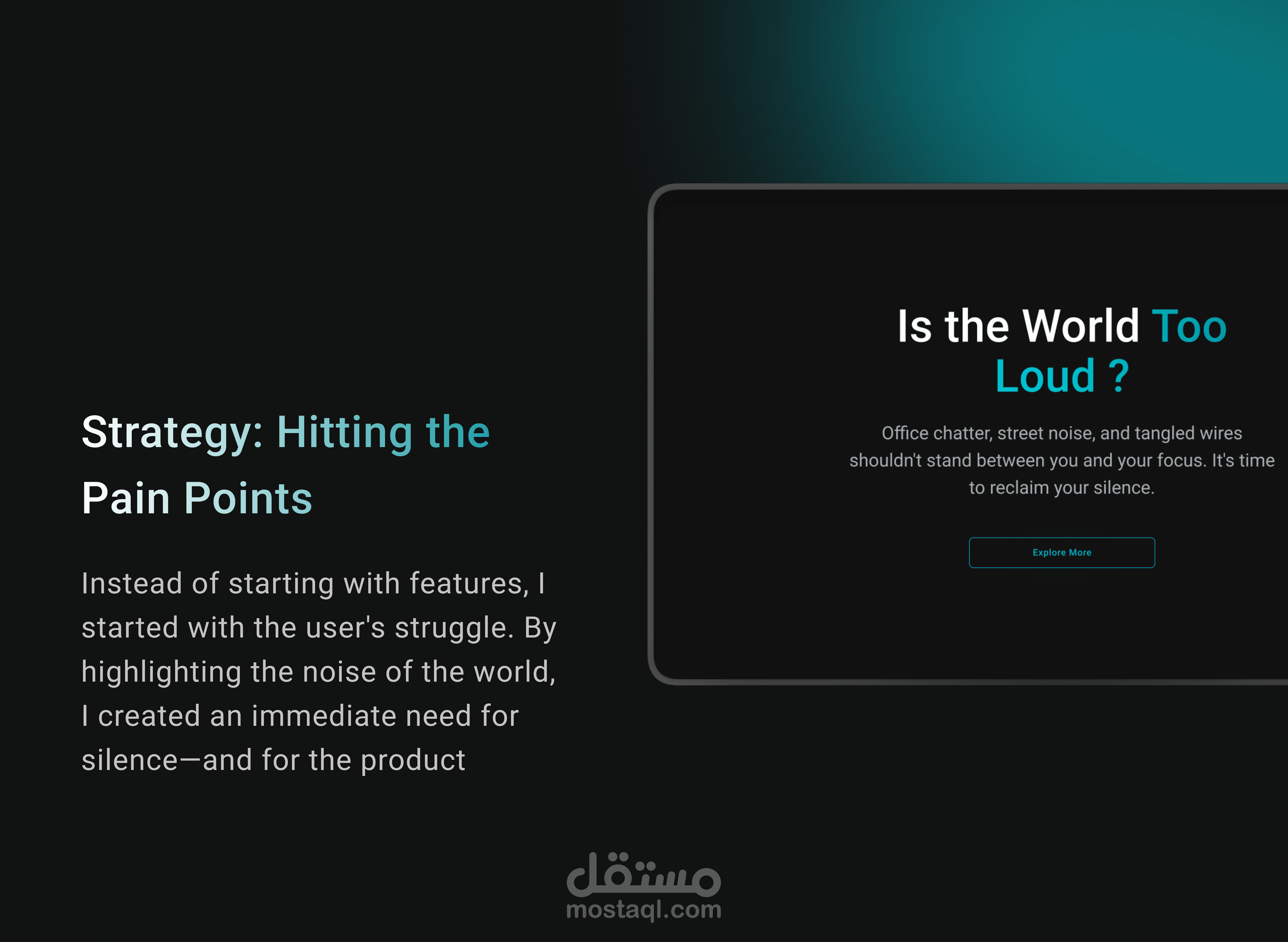 خلق تجربة مستخدم (UX) تجعل العميل "يشعر" بجودة المنتج وفخامته قبل شرائه، مع التركيز على ميزة عزل الضوضاء كحل أساسي لمشكلة التشتت