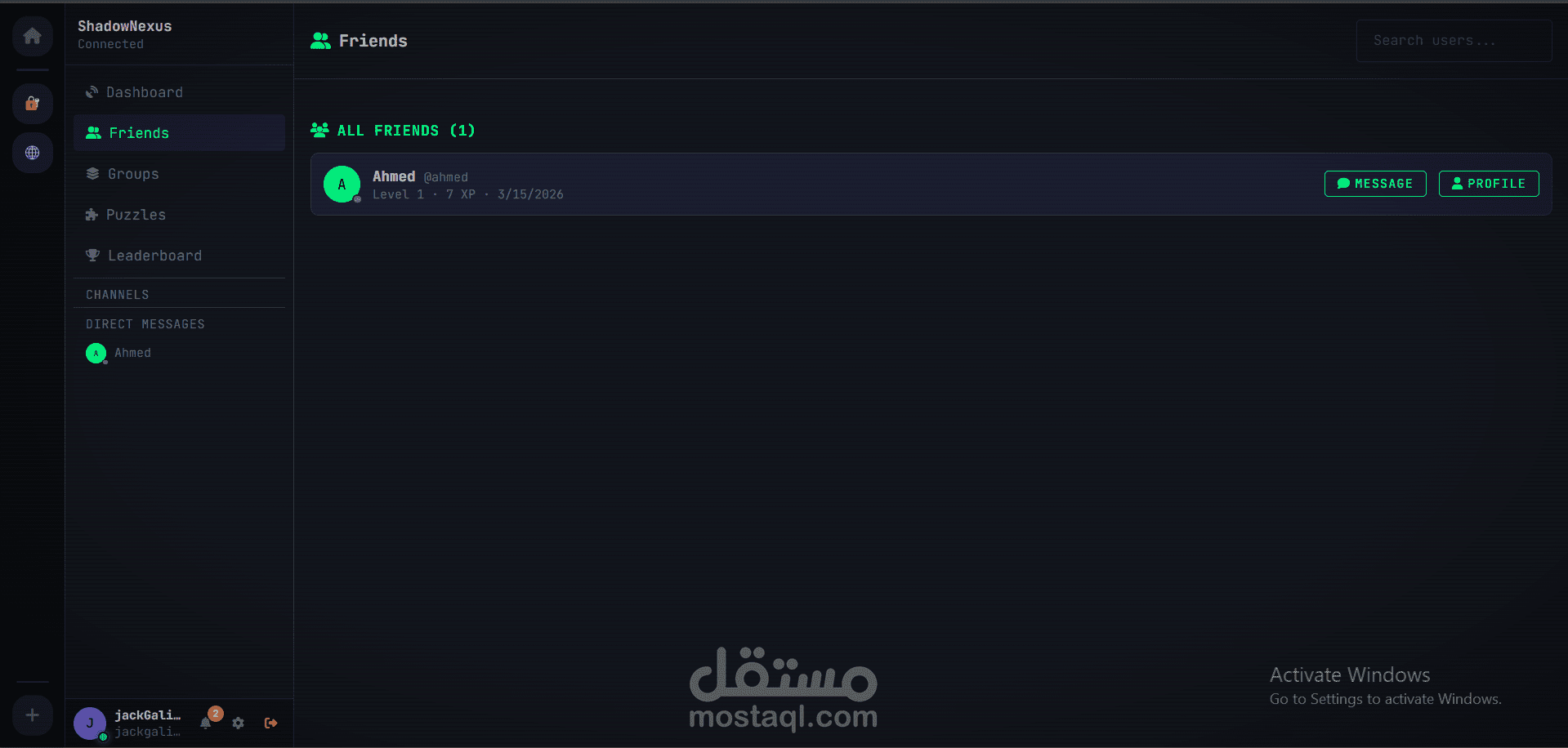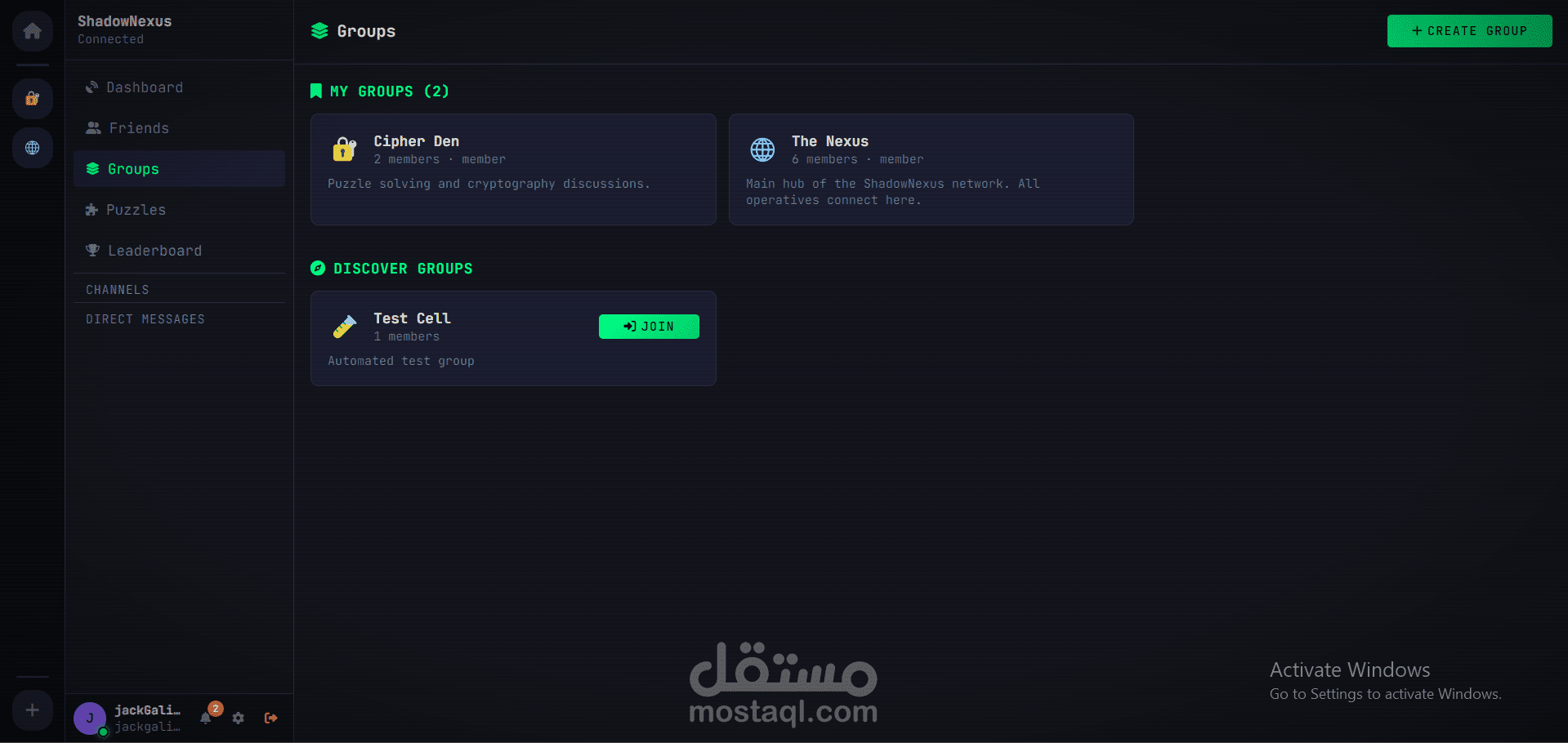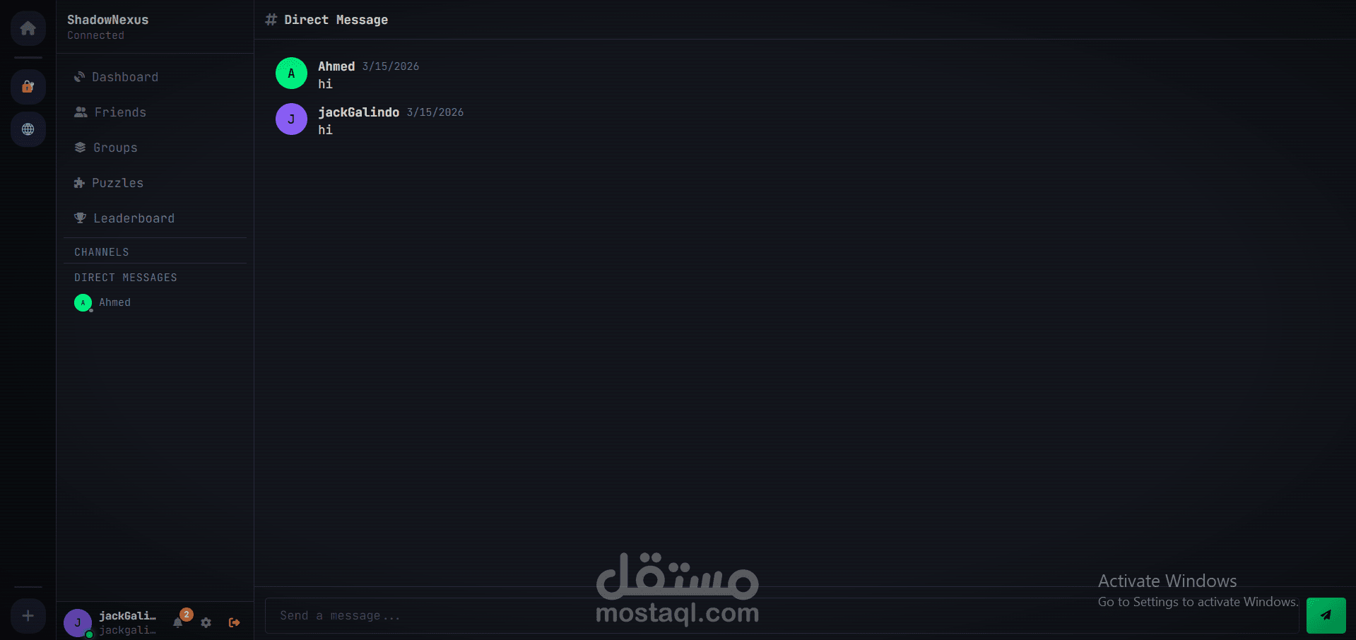 ShadowNexus هو نظام تواصل فوري مبتكر يجمع بين الدردشة، التفاعل الاجتماعي، وحل الألغاز ضمن بيئة مشفرة وآمنة. يتميز المشروع بالقدرة على إدارة المستخدمين، المجموعات، والقنوات، مع لوحة تحكم واضحة تعرض النشاطات، المستويات، والنقاط.