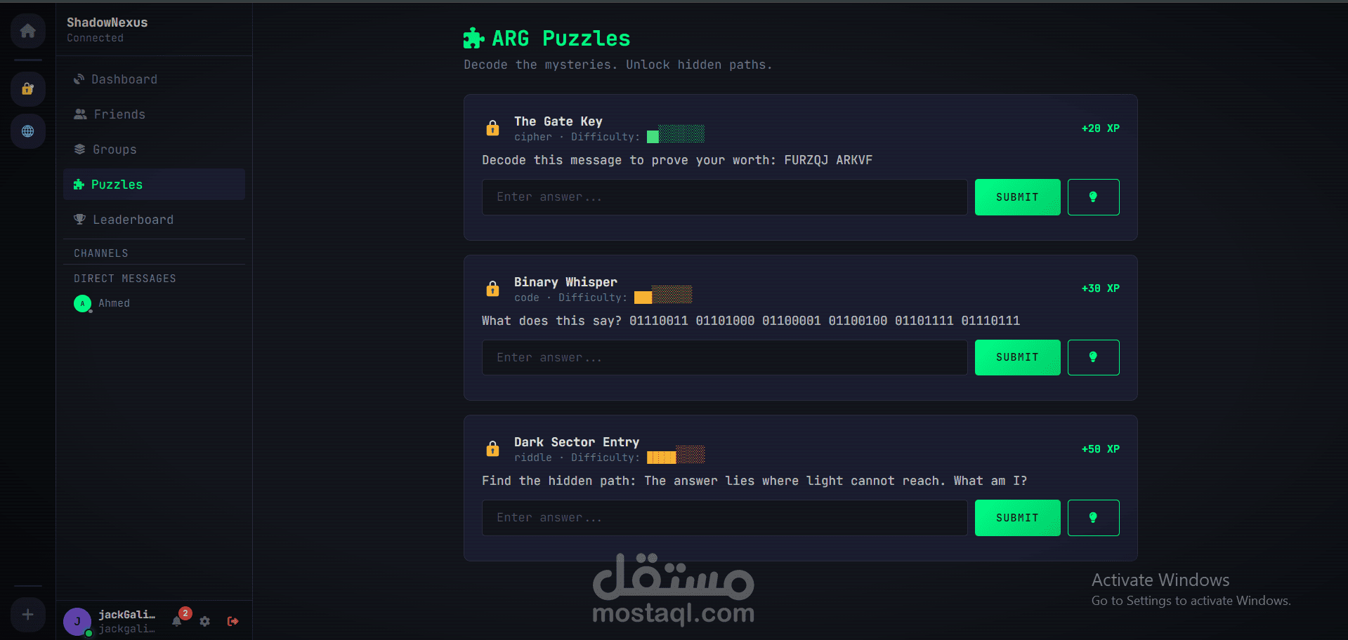 ألغاز وتحديات: ألعاب ARG، شفرات ثنائية، والألغاز الذكية التي تمنح XP عند الحل لتشجيع المشاركة.
