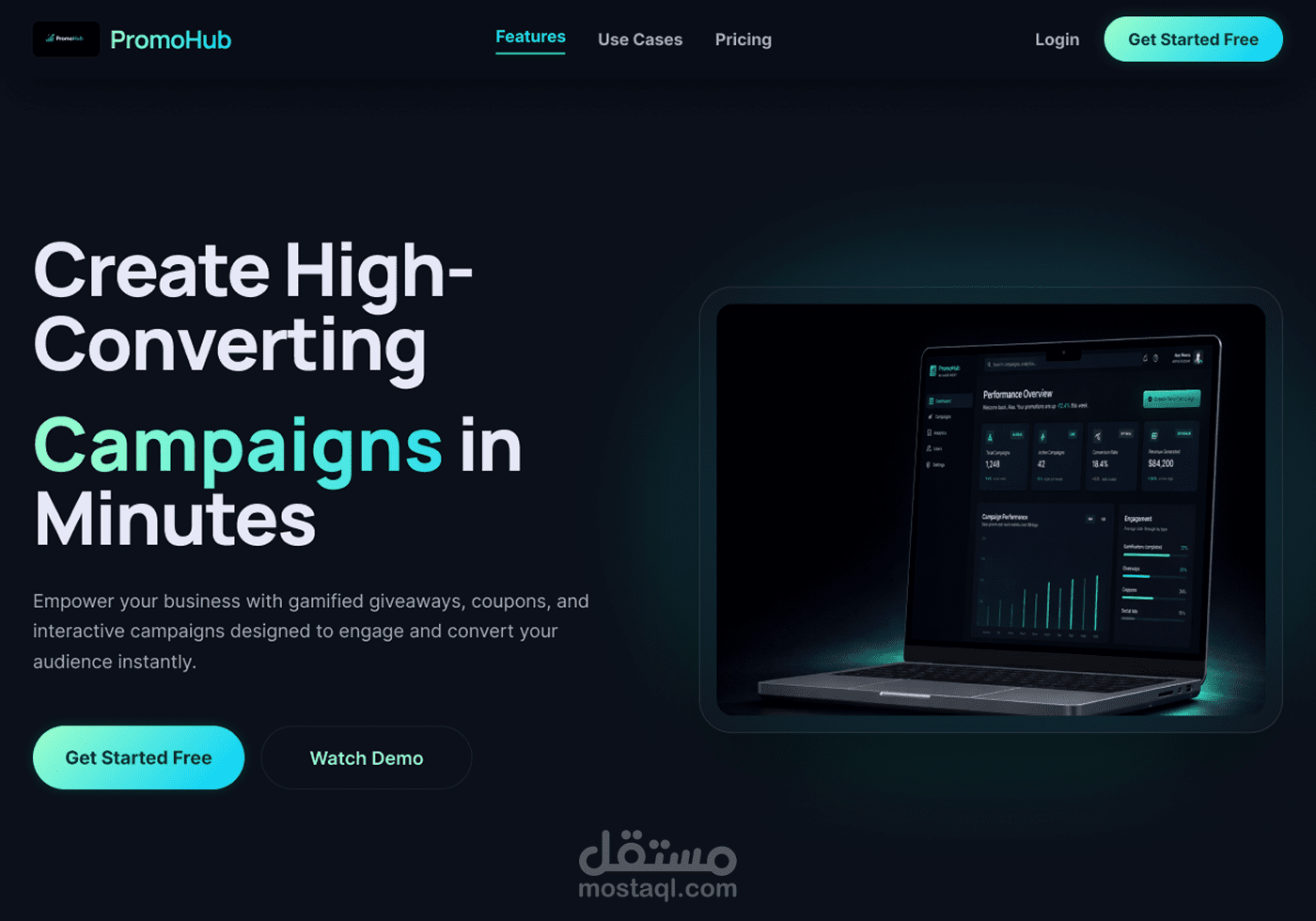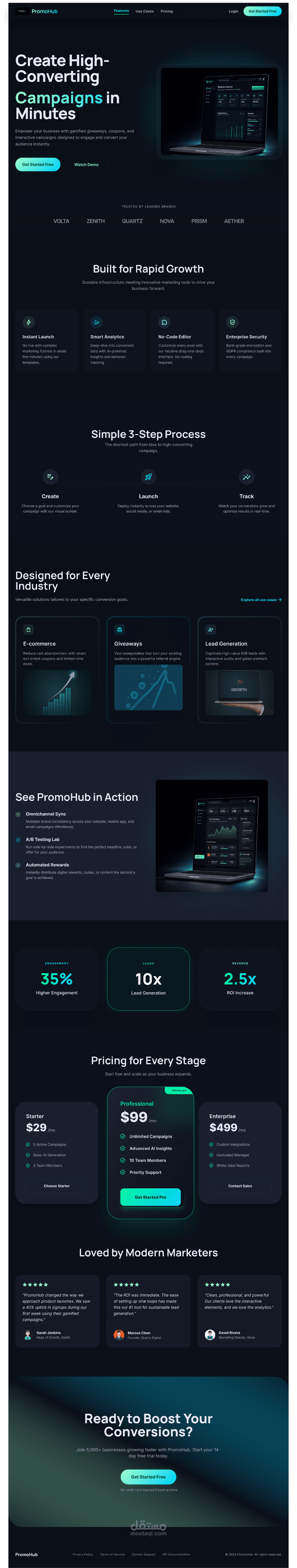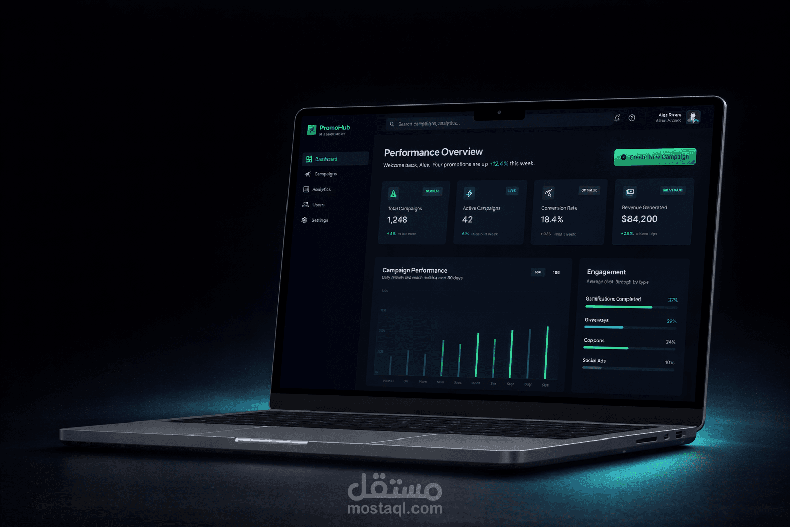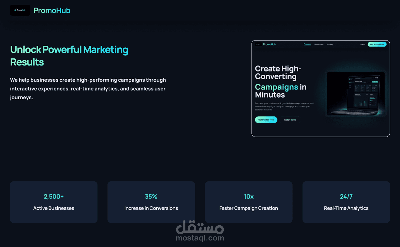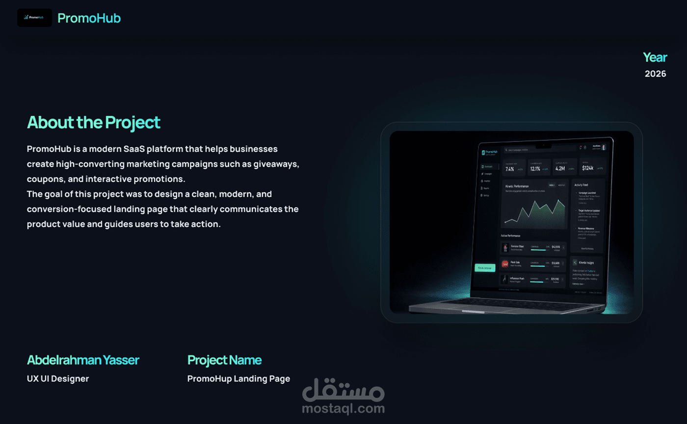 PromoHub is a modern SaaS landing page and dashboard designed to help businesses create high-converting marketing campaigns. The platform focuses on simplifying campaign creation, improving performance tracking, and delivering a smooth and intuitive user experience.