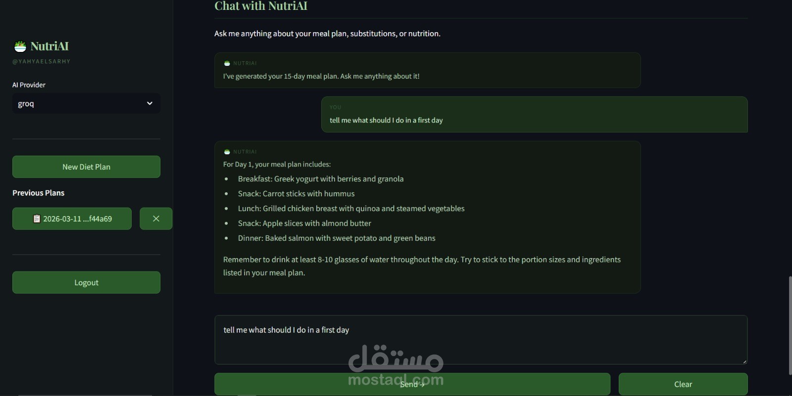 دردشة تفاعلية - طرح أسئلة متابعة حول خطة وجباتك مع حفظ كامل للمحادثة