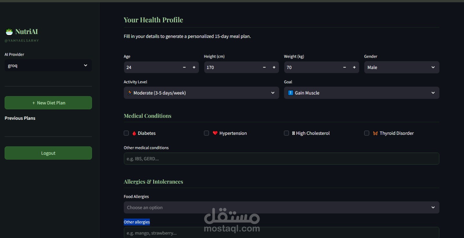 مساعد تغذية متكامل مدعوم بالذكاء الاصطناعي يقوم بإنشاء خطط وجبات شخصية لمدة 15 يومًا بناءً على الملف الصحي للمستخدم، والحالات الطبية، والحساسية، والتفضيلات الغذائية - مع واجهة دردشة للمتابعة مدعومة بنماذج التعلم الممتد.