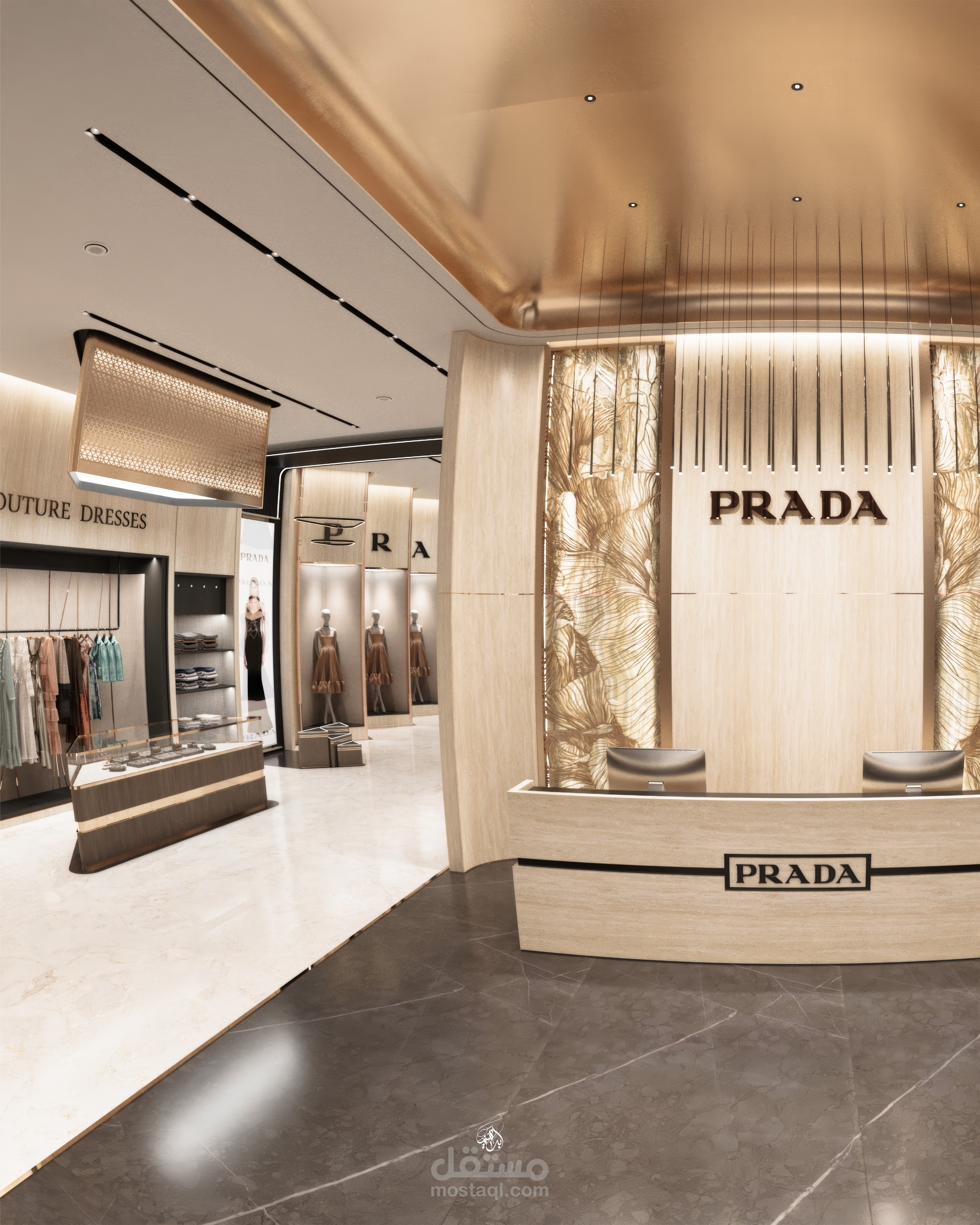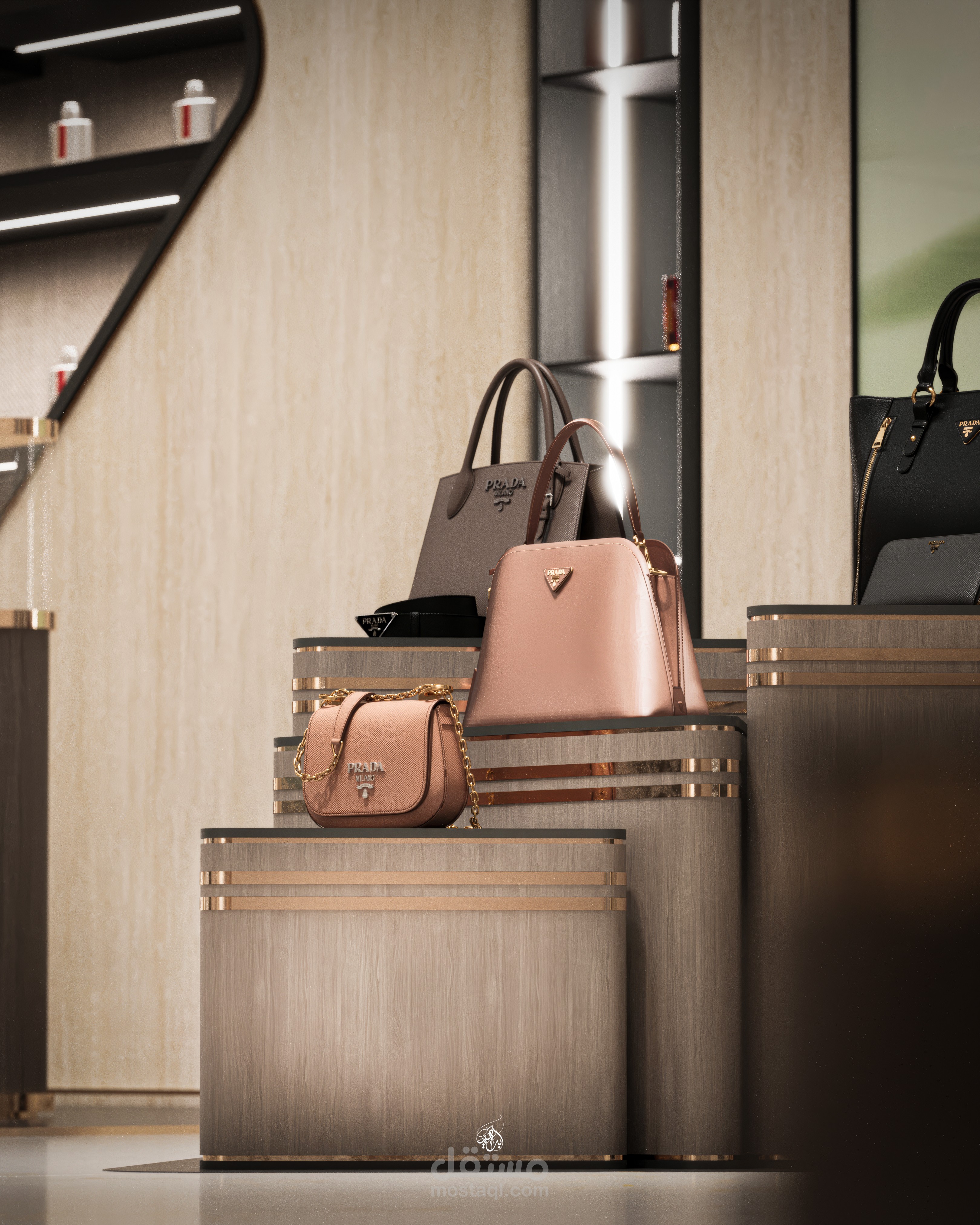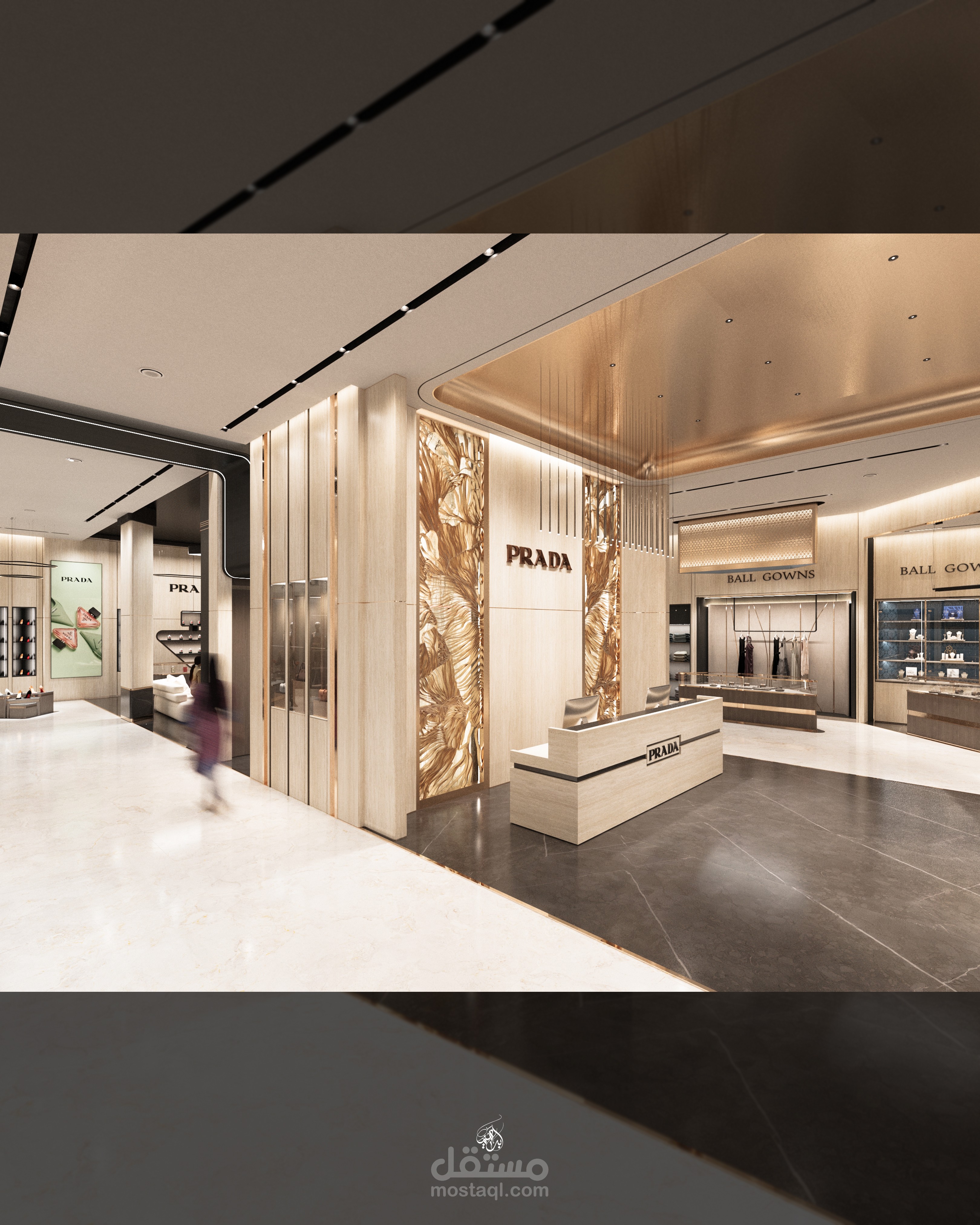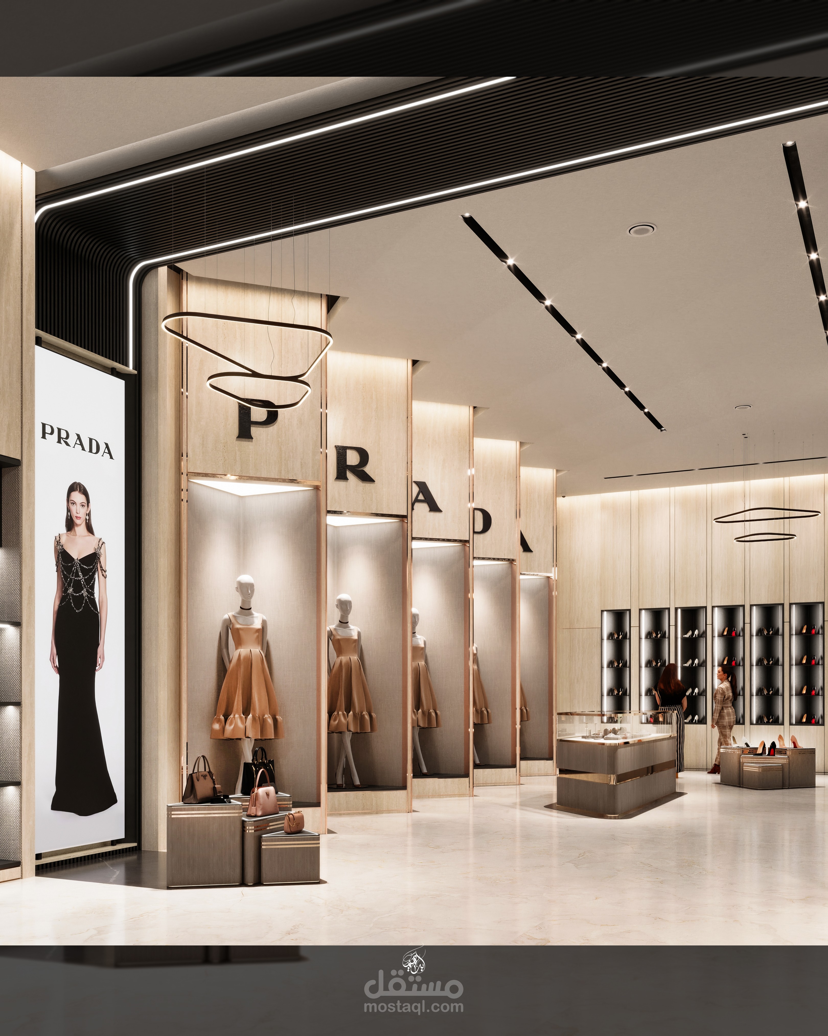 تصميم معرض أزياء مستوحى من هوية علامة Prada، يركز على إبراز المنتجات بطريقة راقية تعزز تجربة الزائر داخل الفراغ. يعتمد التصميم على أسلوب حديث بخطوط نظيفة وتكوين بصري متوازن، مع توزيع مدروس يوجّه حركة العملاء ويخلق نقاط جذب واضحة لكل قطعة معروضة.