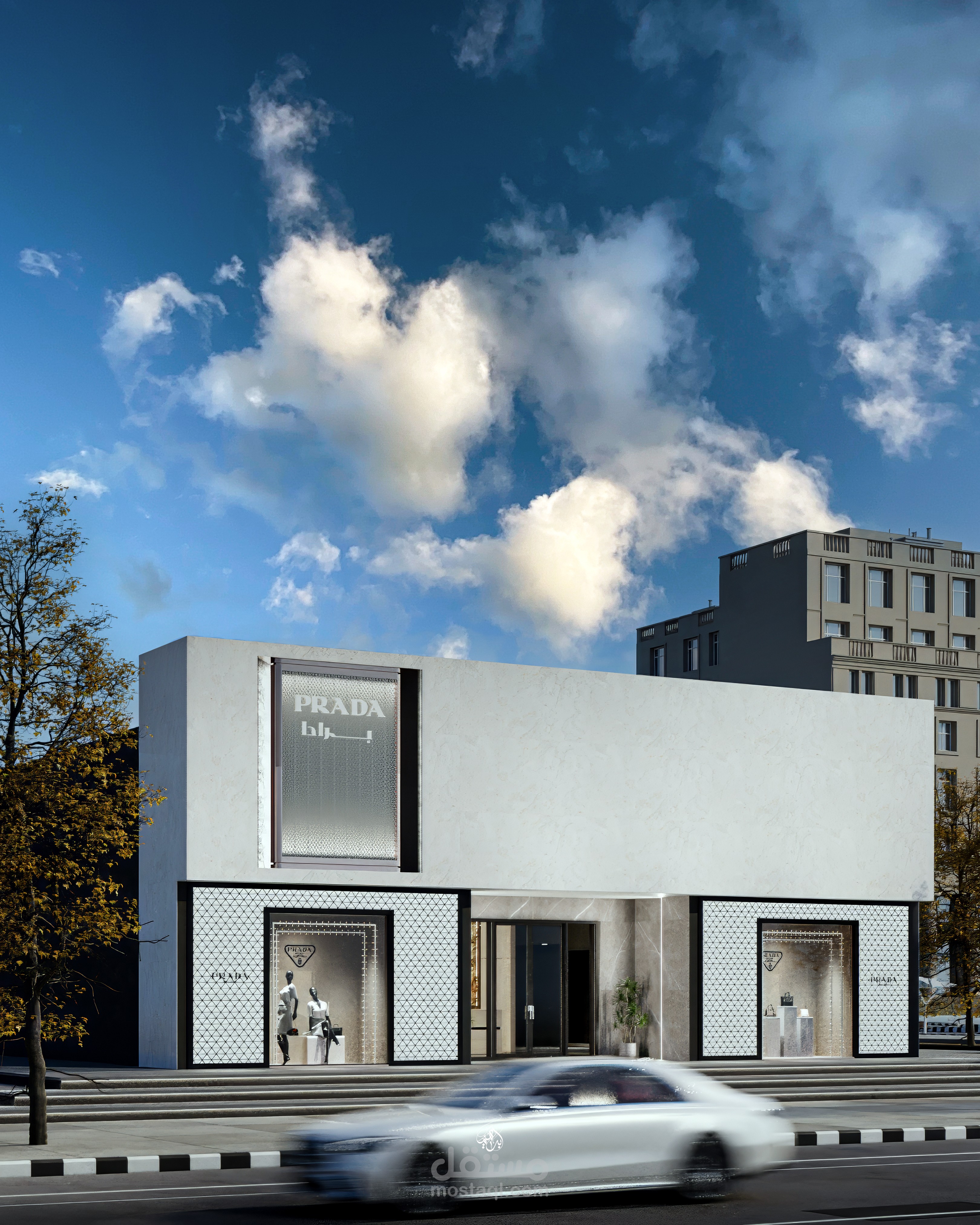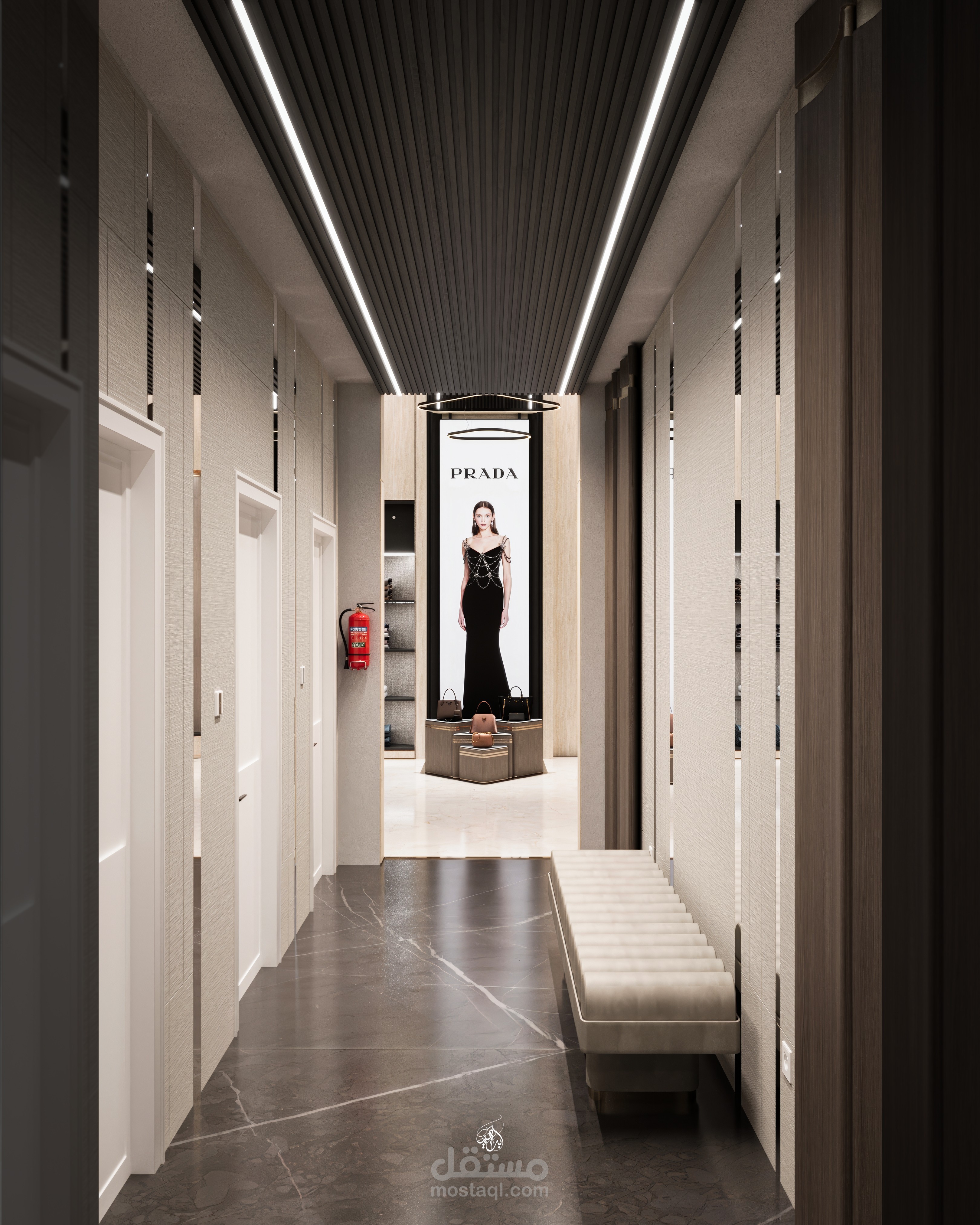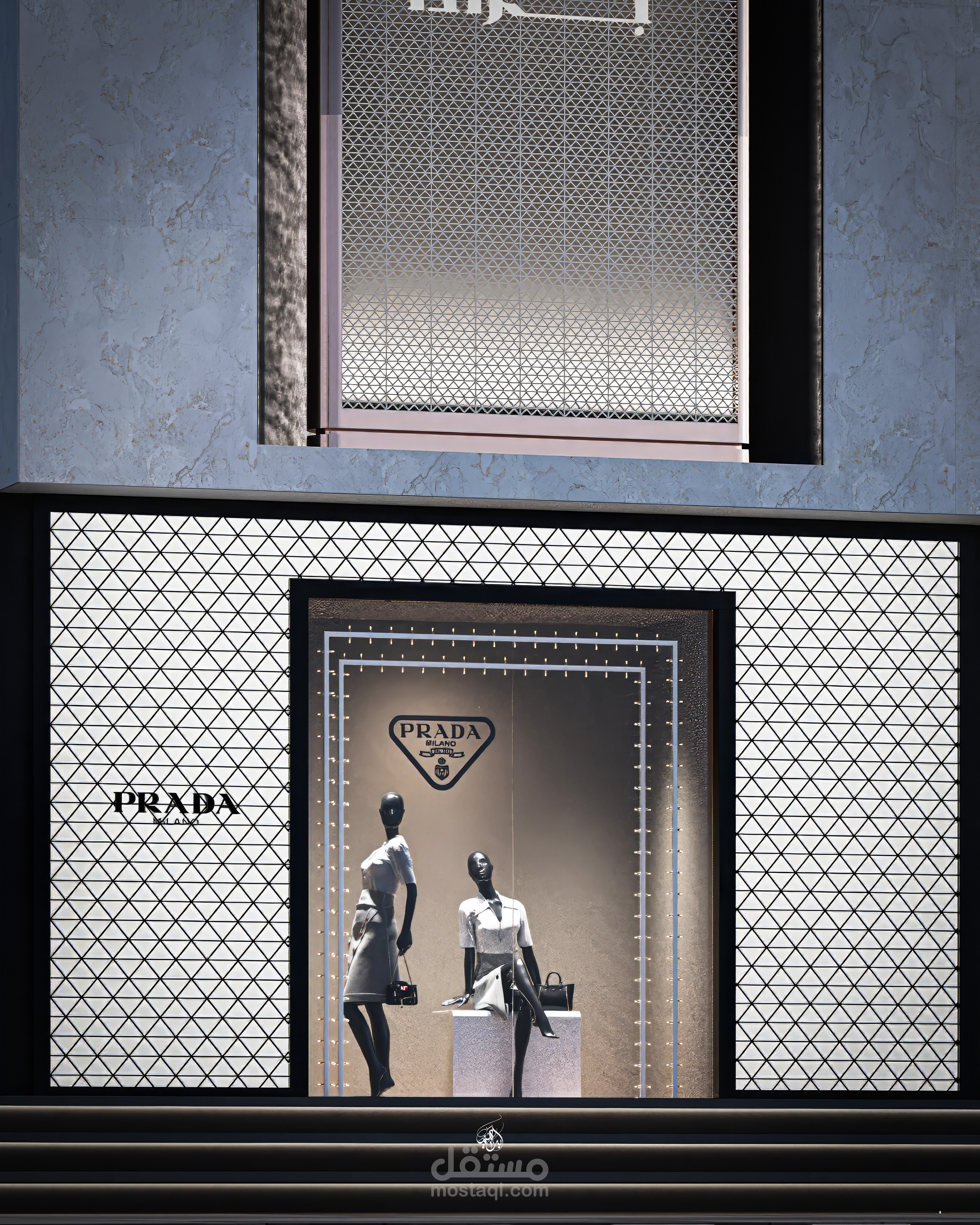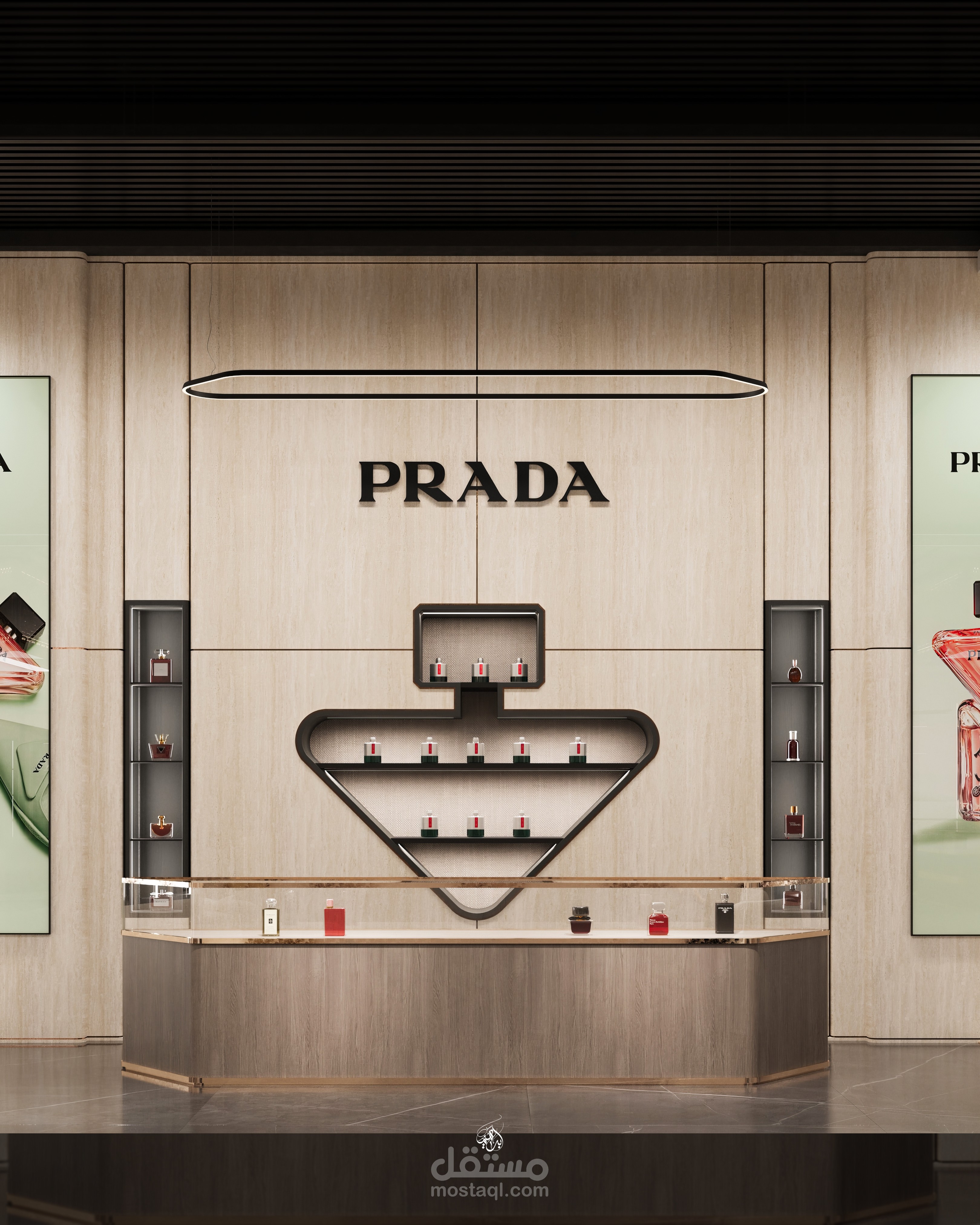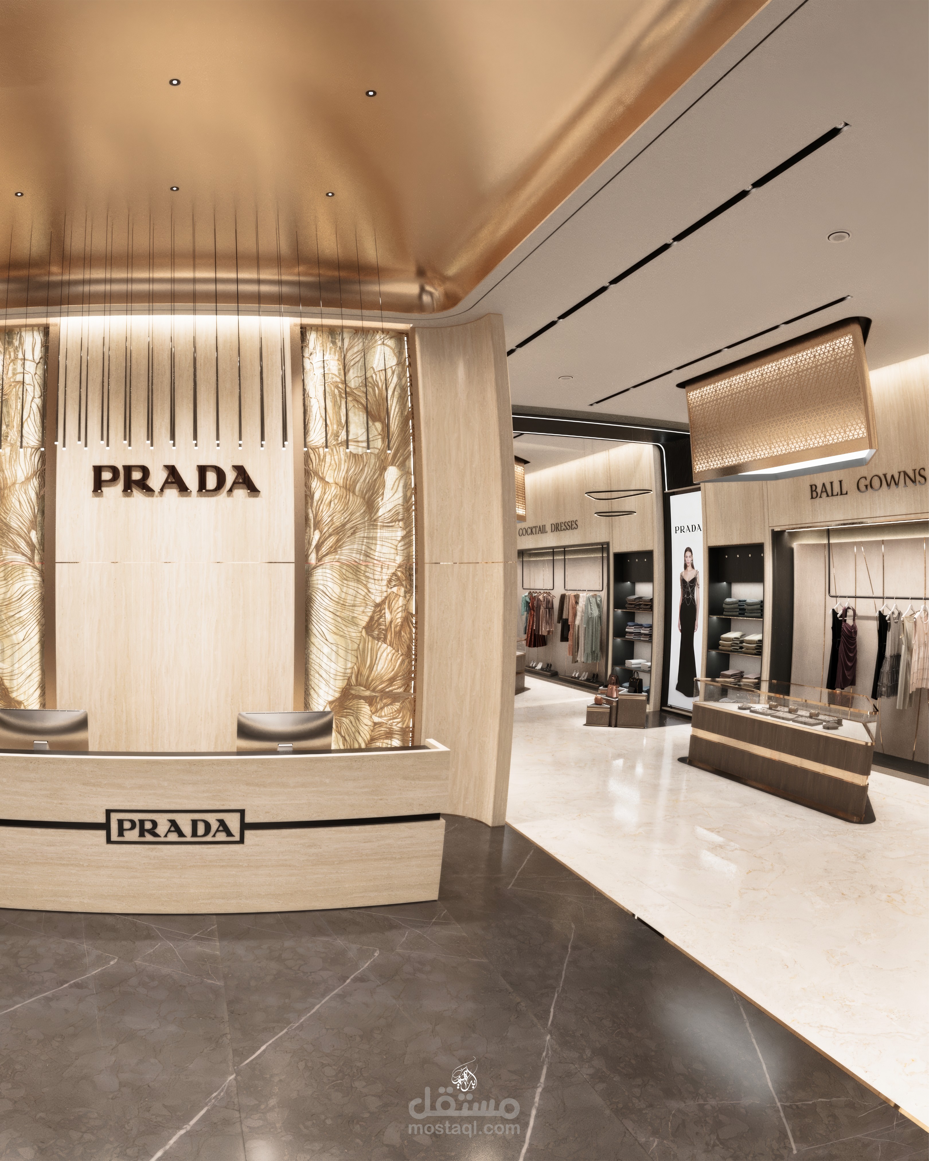 تصميم معرض أزياء مستوحى من هوية علامة Prada، يركز على إبراز المنتجات بطريقة راقية تعزز تجربة الزائر داخل الفراغ. يعتمد التصميم على أسلوب حديث بخطوط نظيفة وتكوين بصري متوازن، مع توزيع مدروس يوجّه حركة العملاء ويخلق نقاط جذب واضحة لكل قطعة معروضة.
