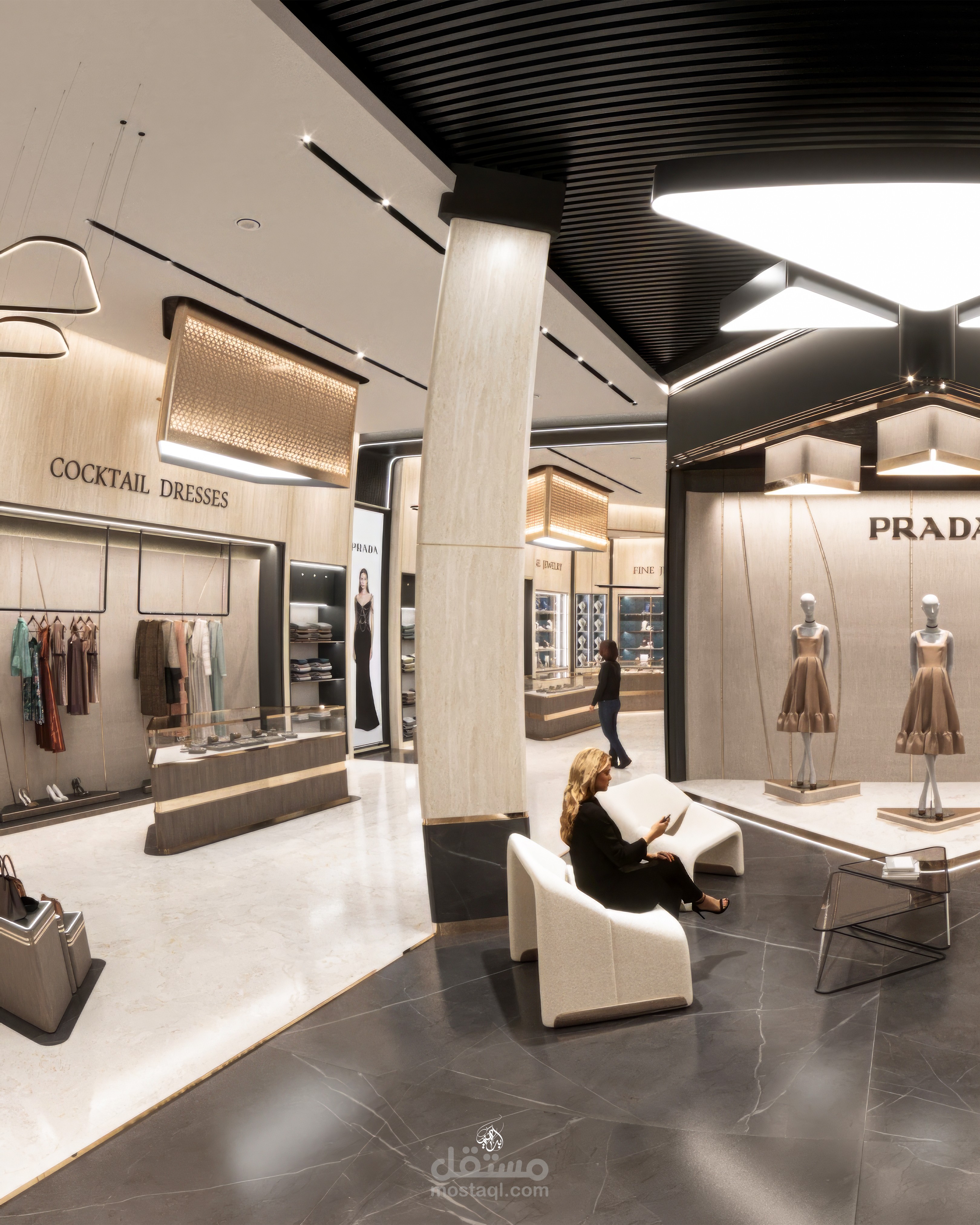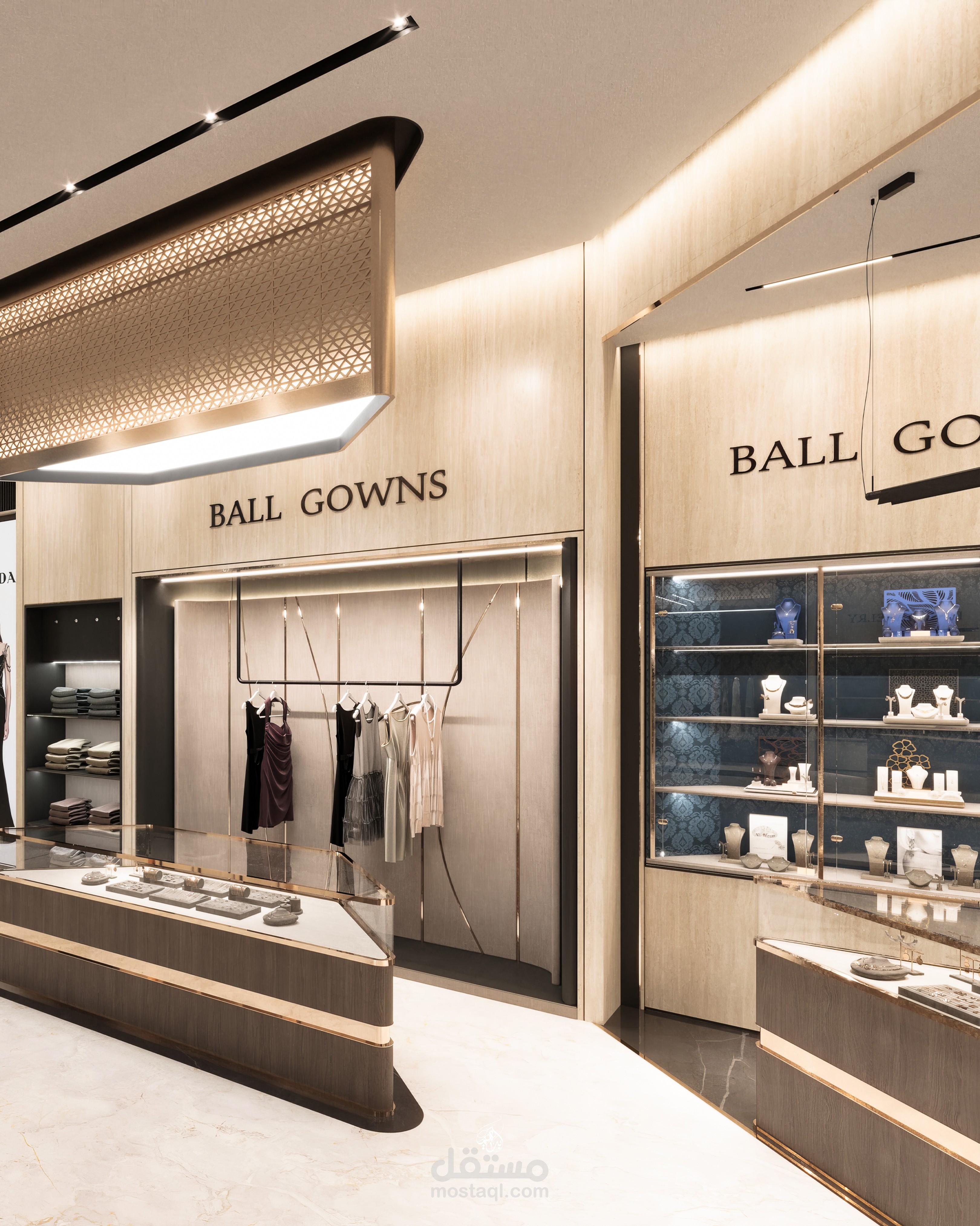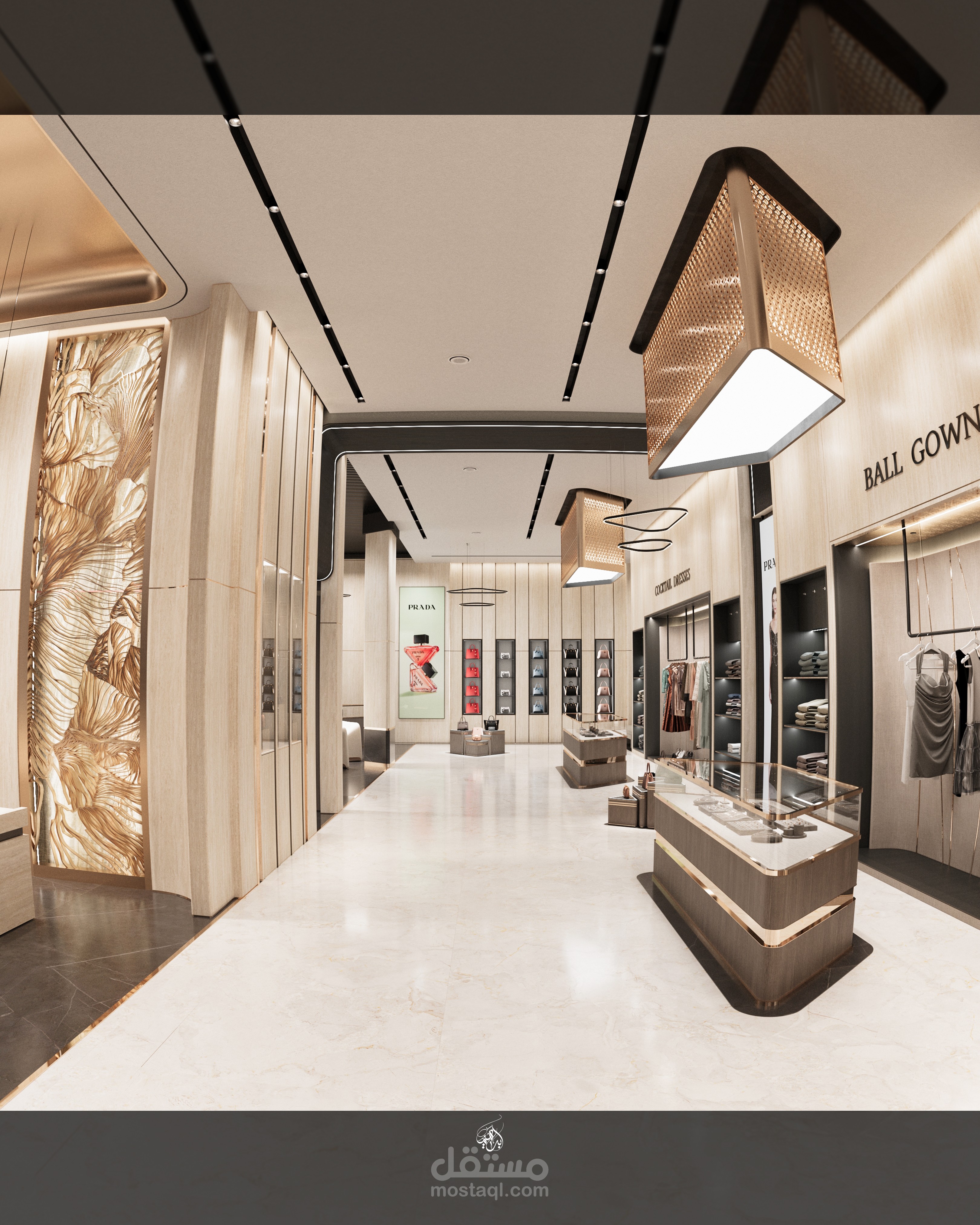 تم اختيار الخامات بعناية لتعكس طابع الفخامة والبساطة الراقية، مع اعتماد نظام إضاءة احترافي يجمع بين الإضاءة العامة والموجهة لإبراز التفاصيل وإضافة عمق للمساحة. يهدف التصميم إلى خلق تجربة تسوق مريحة ومميزة تجمع بين الجمال والوظيفة.