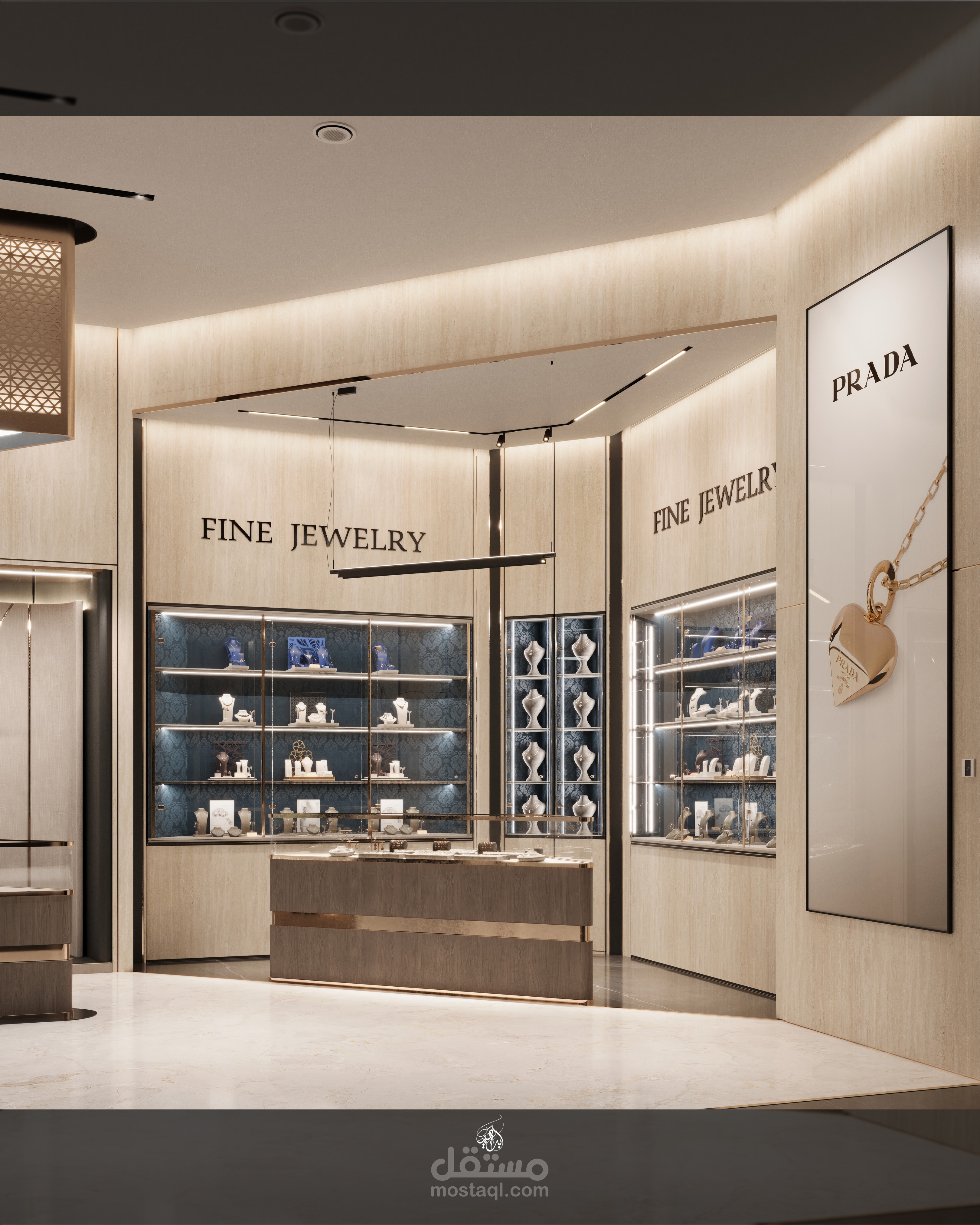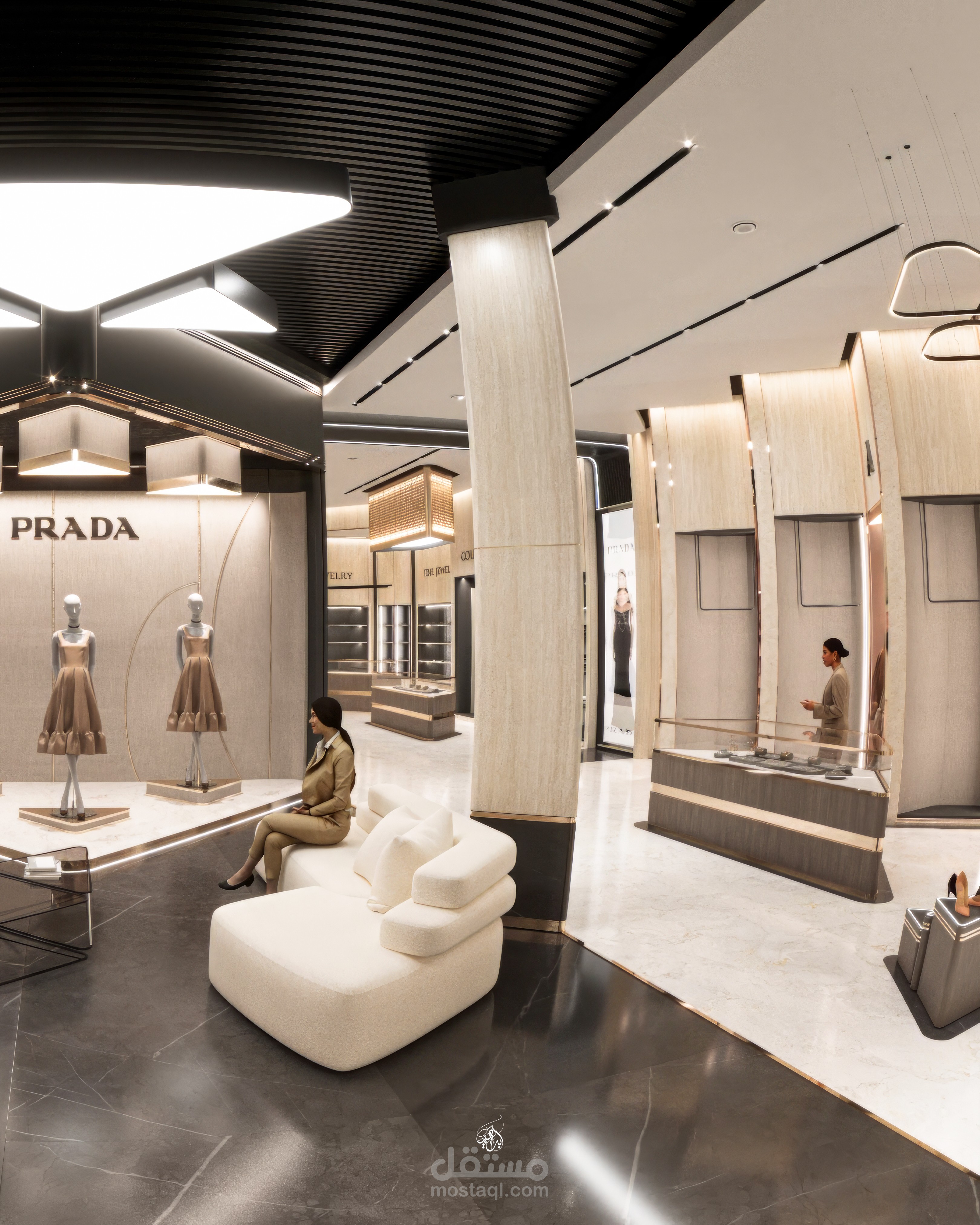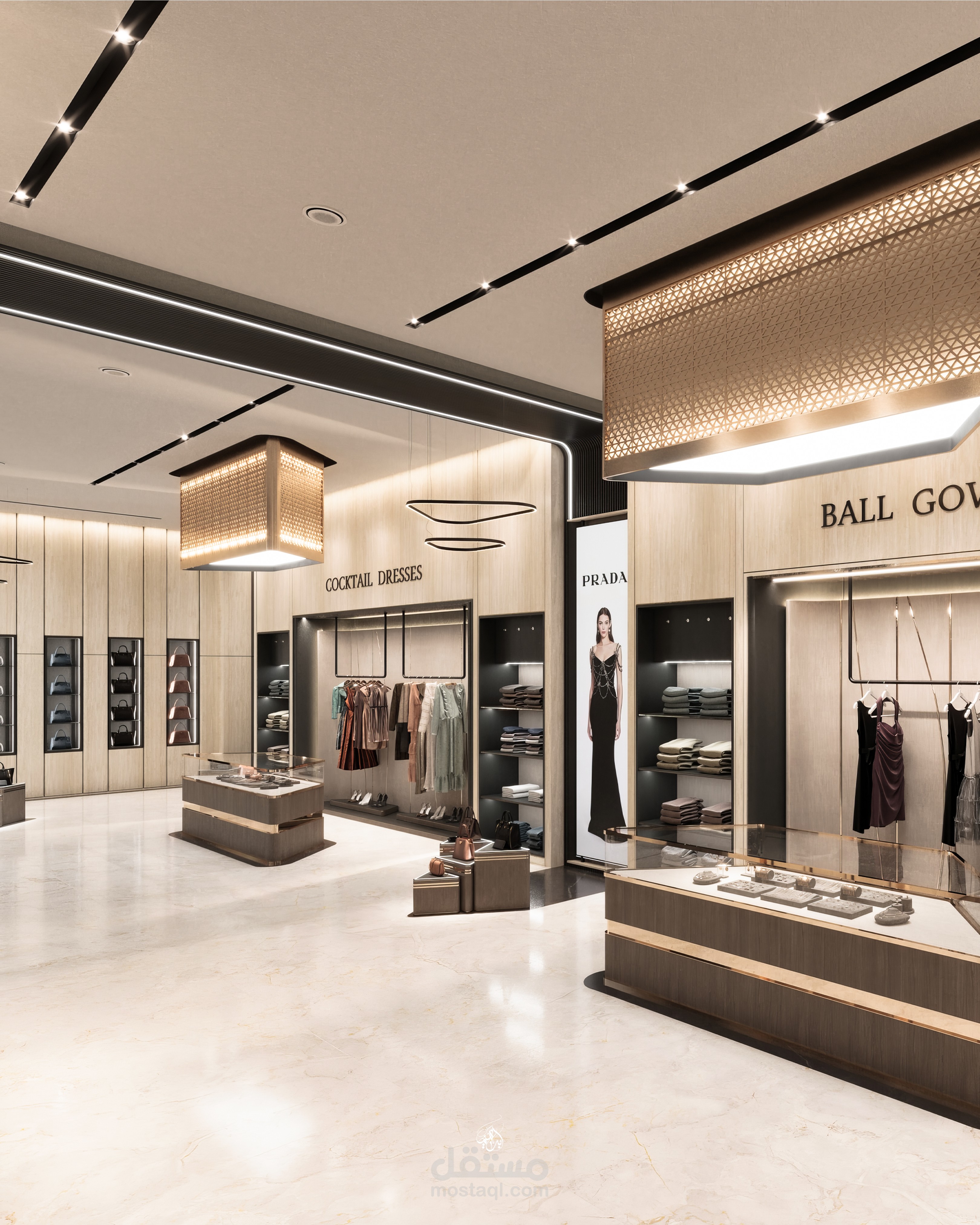 تم اختيار الخامات بعناية لتعكس طابع الفخامة والبساطة الراقية، مع اعتماد نظام إضاءة احترافي يجمع بين الإضاءة العامة والموجهة لإبراز التفاصيل وإضافة عمق للمساحة. يهدف التصميم إلى خلق تجربة تسوق مريحة ومميزة تجمع بين الجمال والوظيفة.