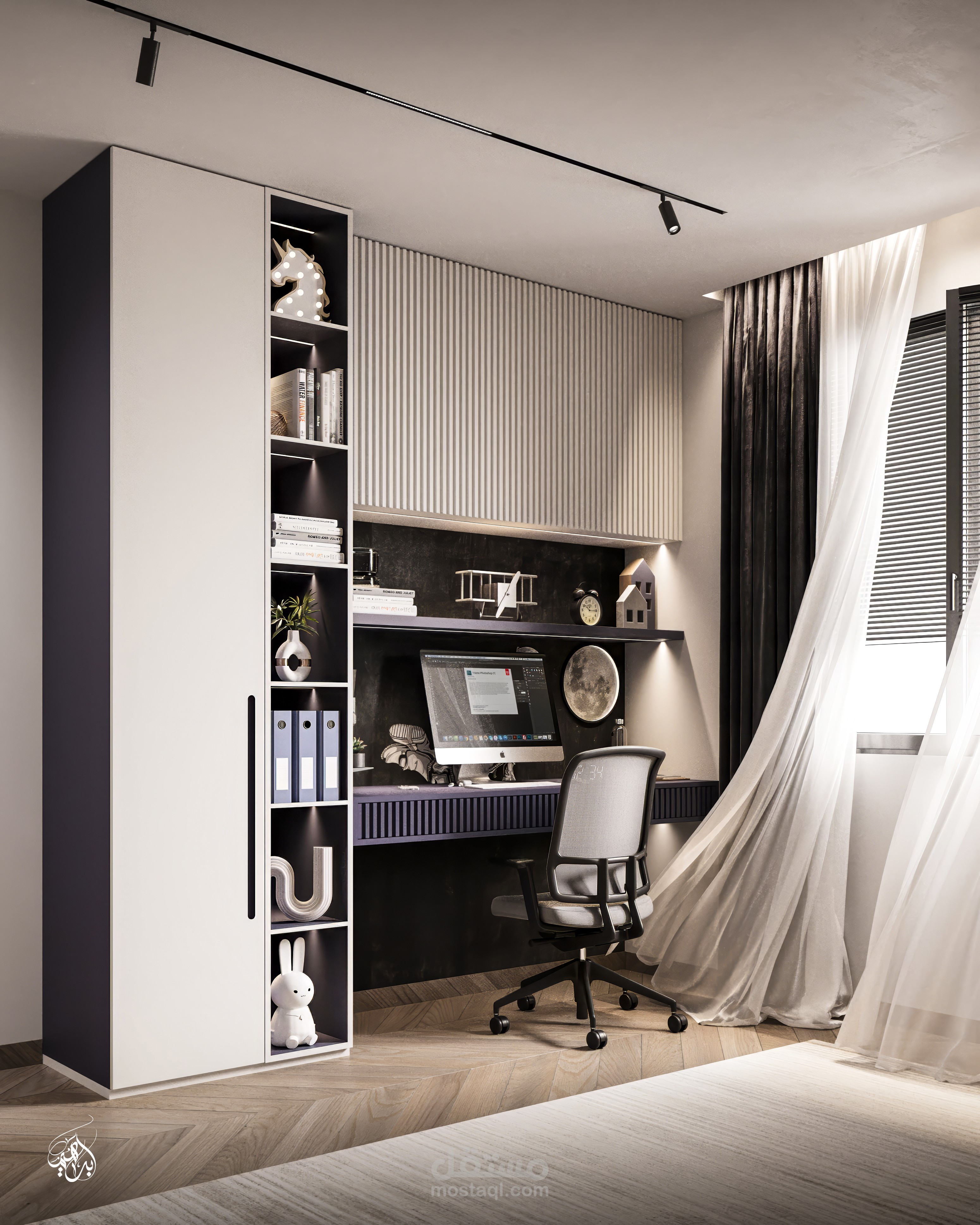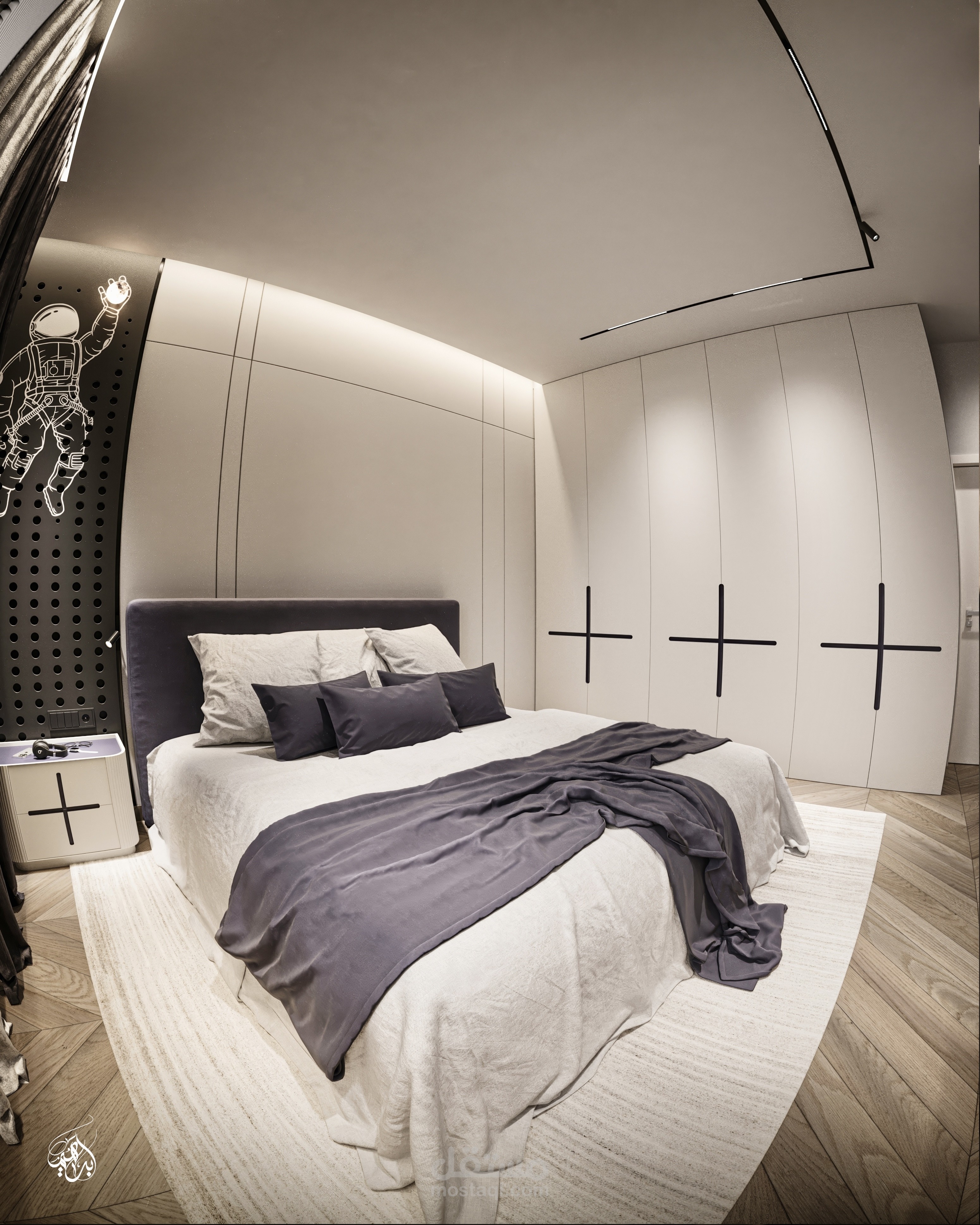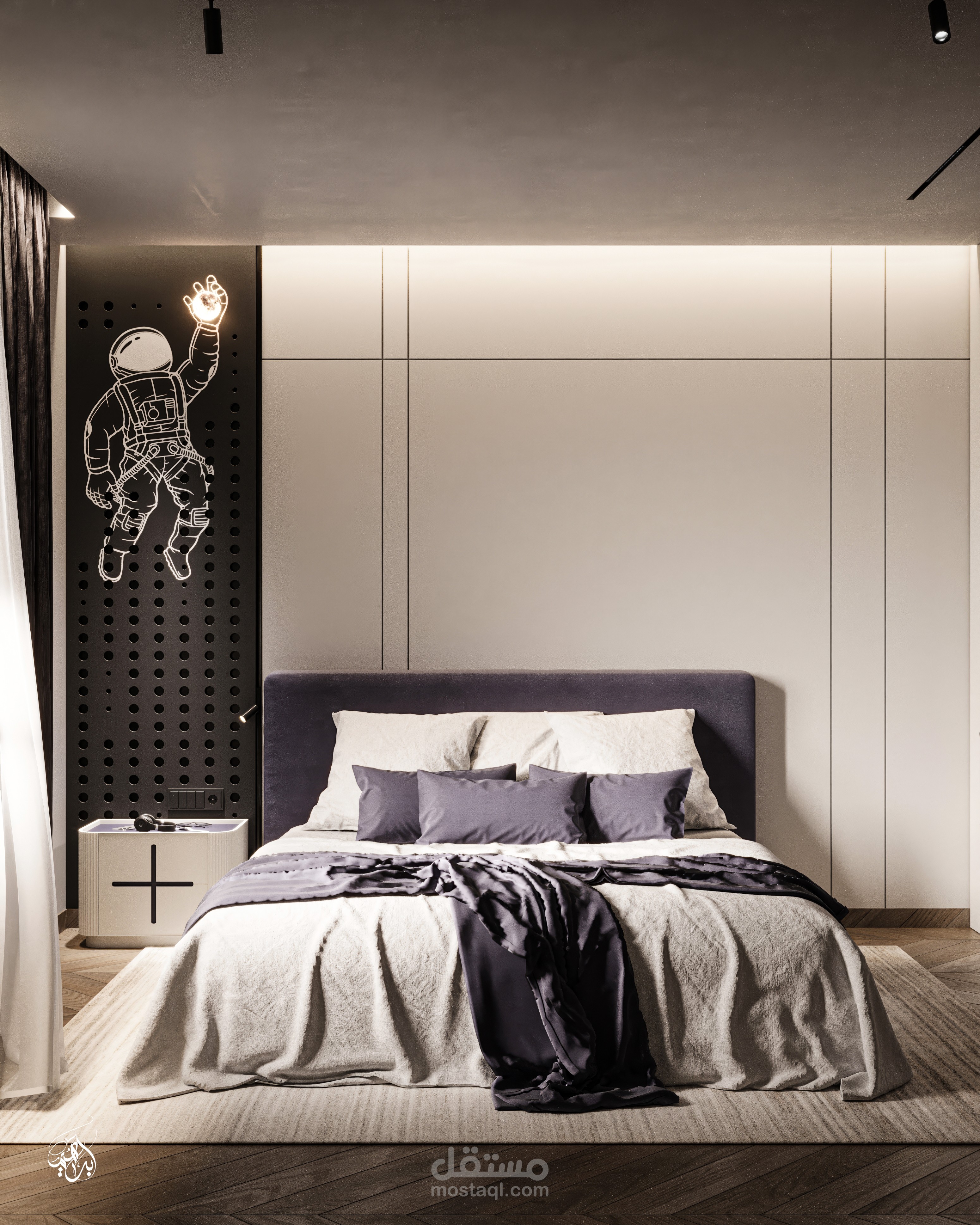 تصميم غرفة نوم أطفال مستوحاة من عالم الفضاء، يهدف إلى خلق بيئة خيالية محفزة تجمع بين المرح والراحة. يعتمد التصميم على توظيف العناصر البصرية مثل النجوم والكواكب والإضاءة المحيطية لإضفاء طابع ديناميكي يثير خيال الطفل ويعزز تجربته داخل الفراغ.