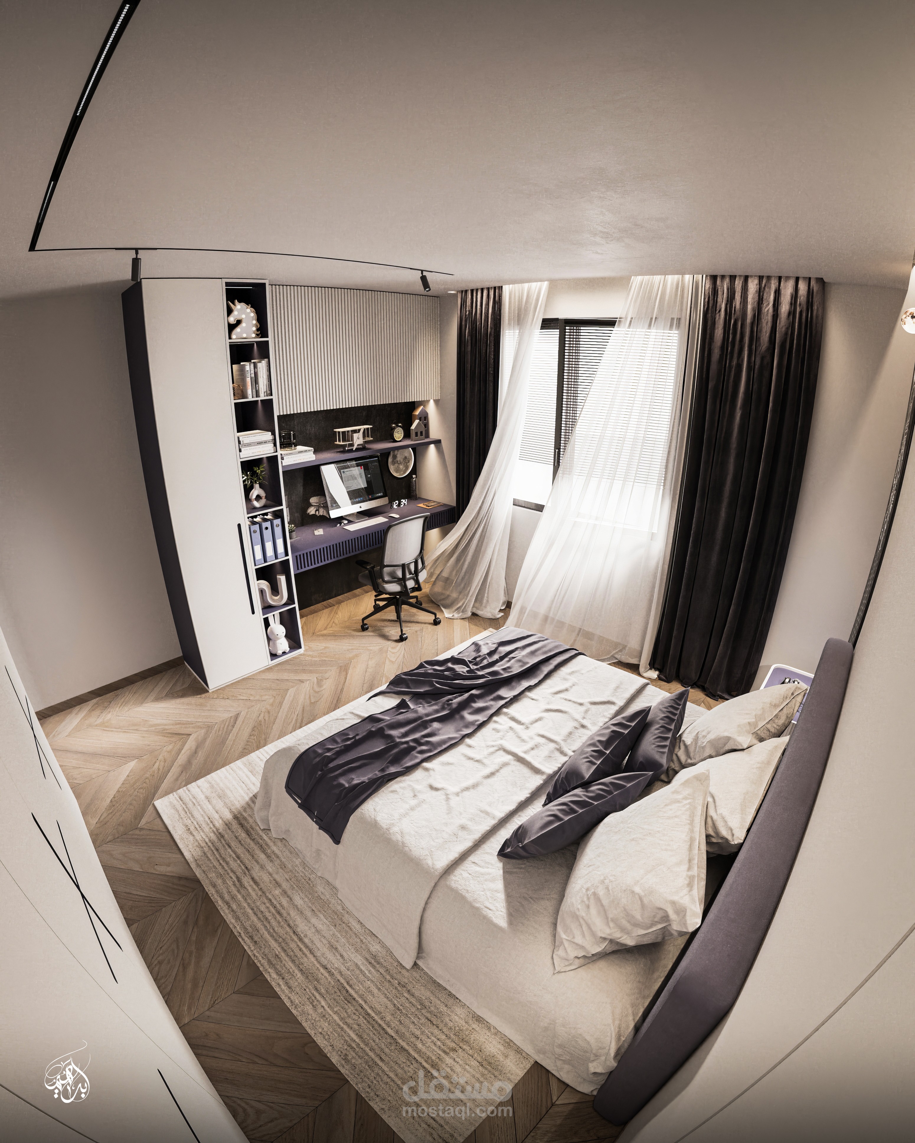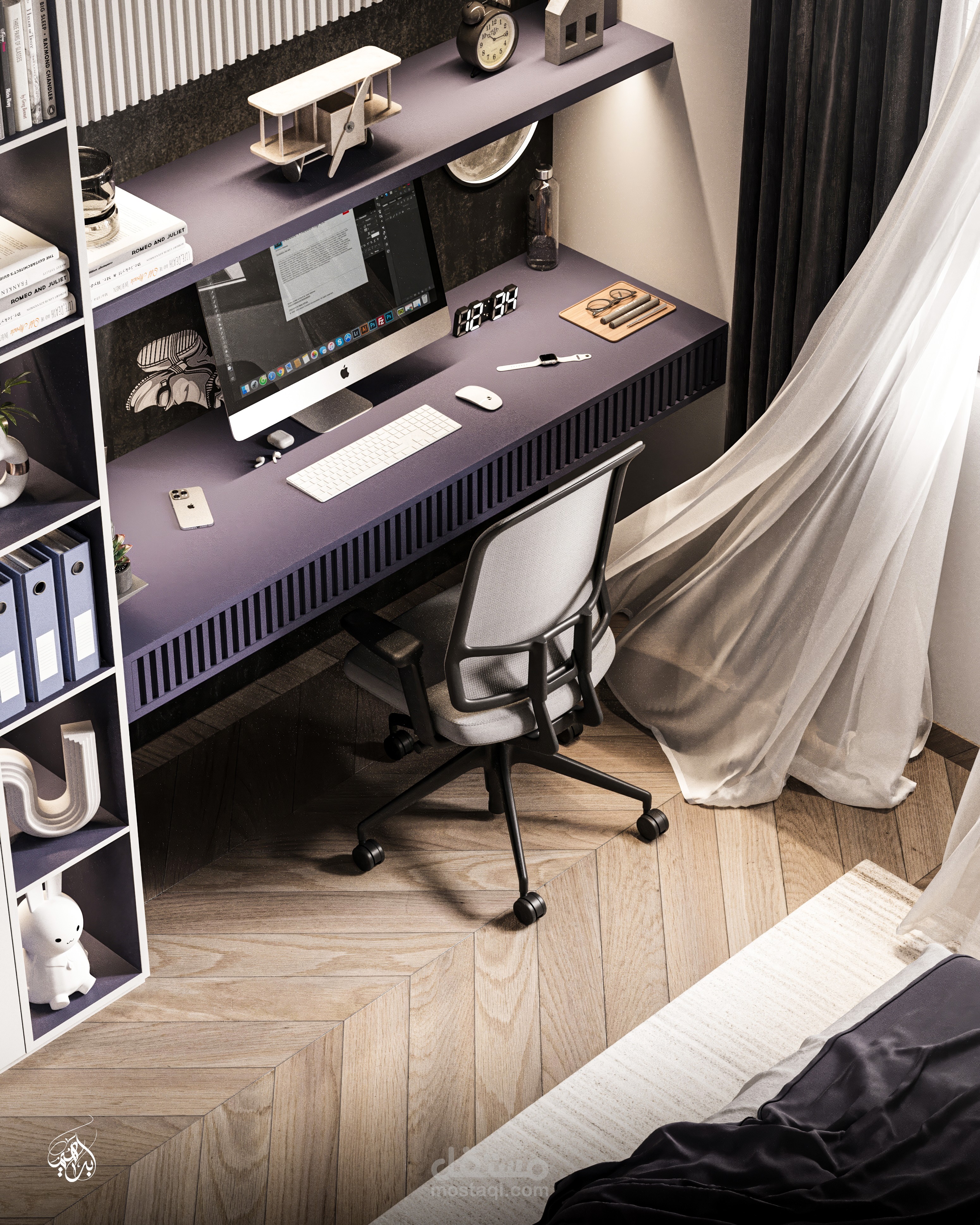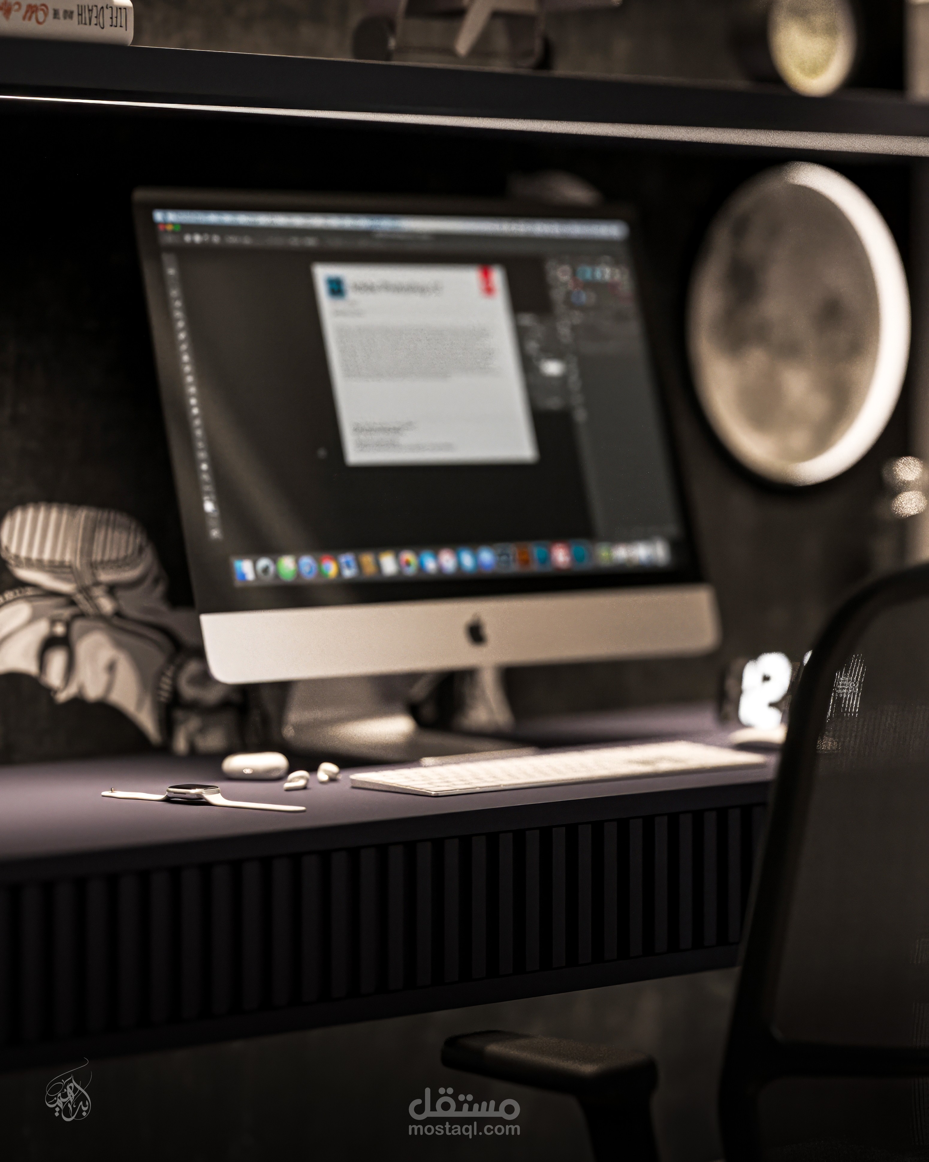 تصميم غرفة نوم أطفال مستوحاة من عالم الفضاء، يهدف إلى خلق بيئة خيالية محفزة تجمع بين المرح والراحة. يعتمد التصميم على توظيف العناصر البصرية مثل النجوم والكواكب والإضاءة المحيطية لإضفاء طابع ديناميكي يثير خيال الطفل ويعزز تجربته داخل الفراغ.