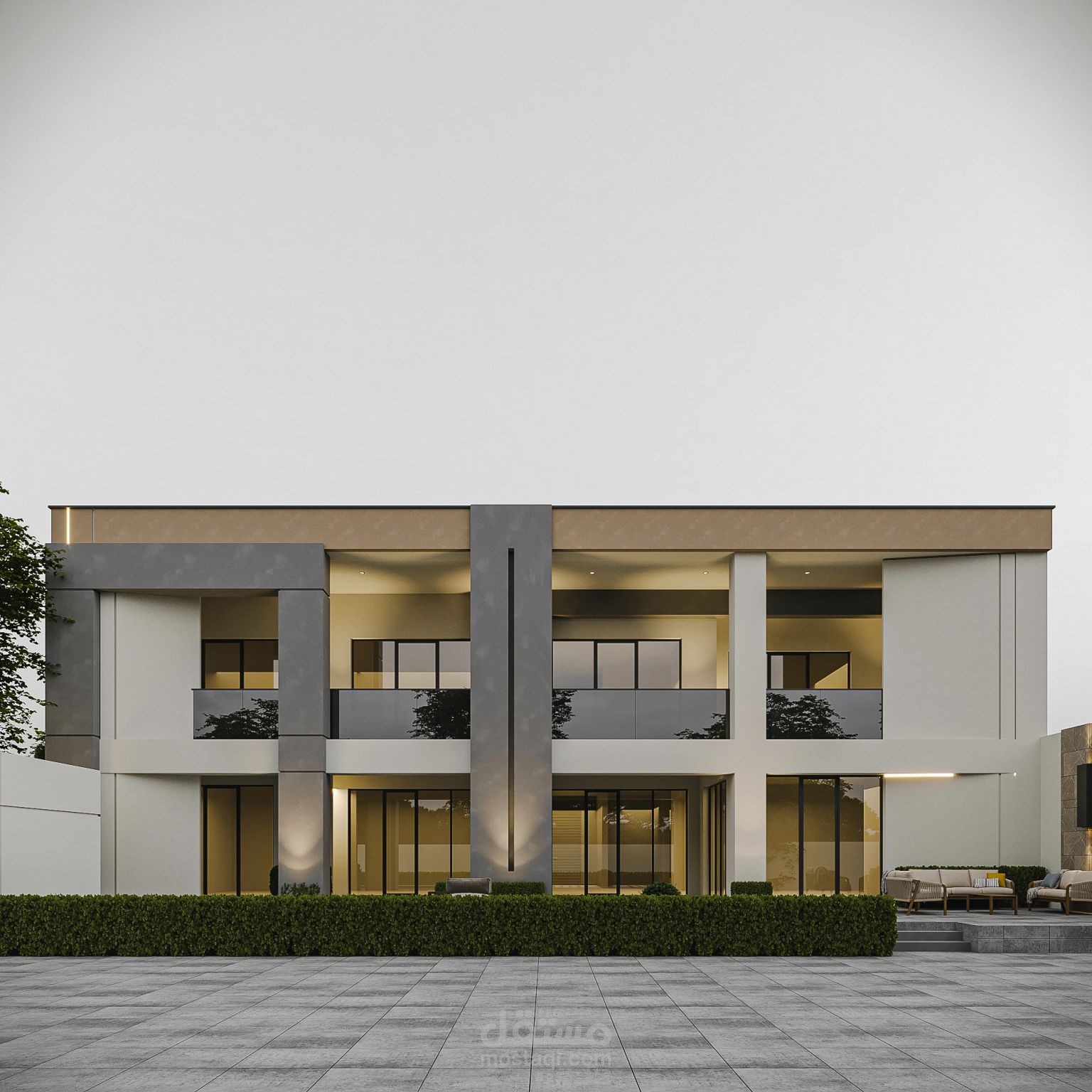 تصميم فيلا سكنية فاخرة بأسلوب حديث يركز على وضوح الكتل وإبراز المدخل الرئيسي كعنصر بصري مميز.