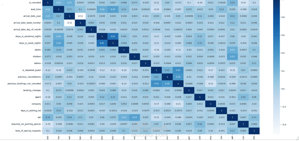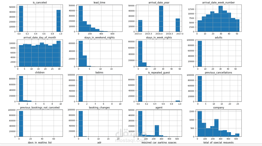 تحتوي هذه البيانات على معلومات تفصيلية عن حجوزات الفنادق، وتهدف إلى تحليل سلوك العملاء والتنبؤ بإمكانية إلغاء الحجز. تشمل البيانات مجموعة من الخصائص المتعلقة بالحجز مثل مدة الحجز قبل الوصول (lead time)، نوع العميل، نوع الفندق، عدد النزلاء، وتفاصيل أخرى مرتبطة بالحجز.