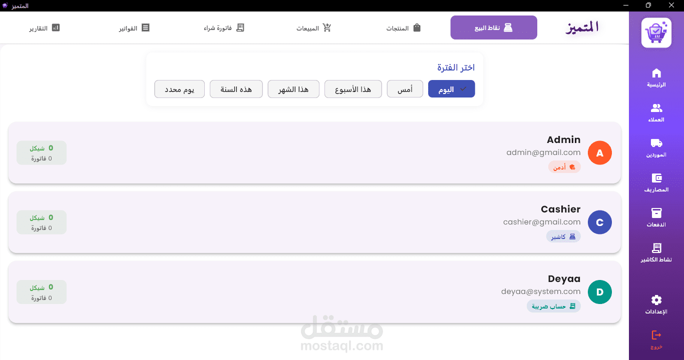 نظام صلاحيات (Admin / Cashier) للتحكم بالمستخدمين
