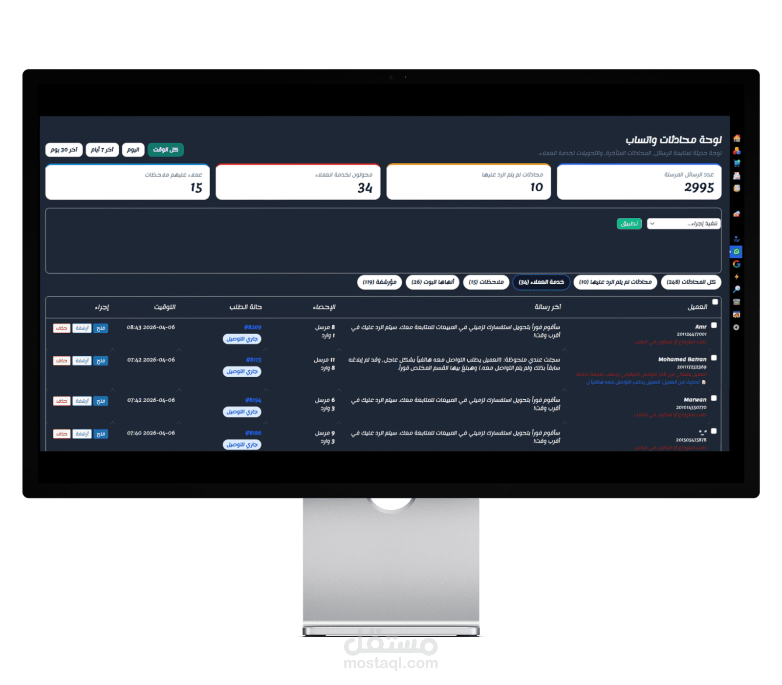 6-إحصائيات الرسائل: تتبع عدد الرسائل المرسلة والواردة لكل عميل (مثال: 8 مرسل / 1 وارد) لتحليل التفاعل وتقييم أداء خدمة العملاء.
