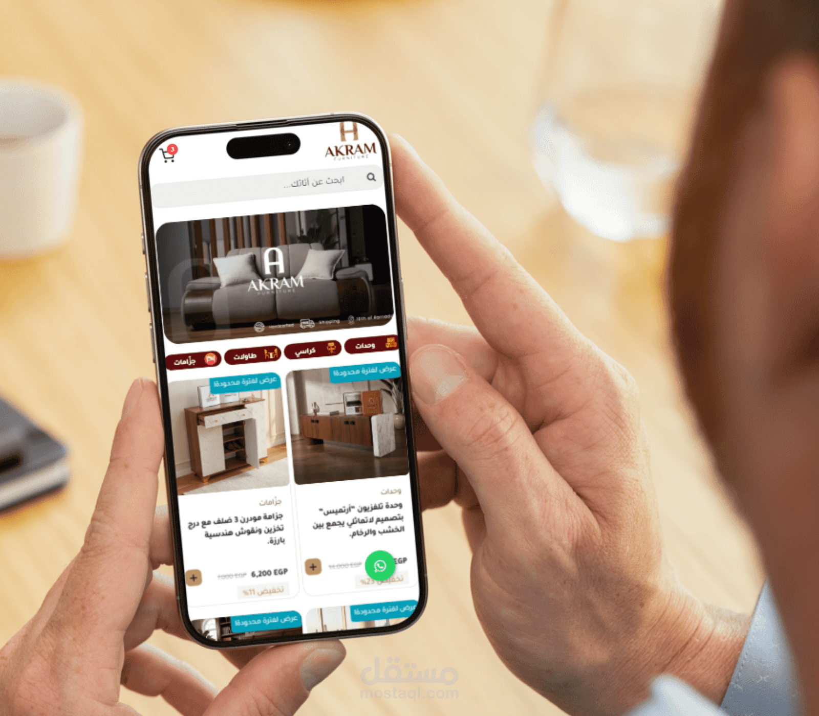 2-بطاقات وعروض المنتجات: عرض احترافي للمنتجات يبرز الصور بجودة عالية، مع توضيح تفاصيل الأسعار والخصومات بوضوح (مثال: تخفيض 11%)، وزر مباشر للإضافة إلى السلة، بالإضافة إلى زر عائم للتواصل الفوري عبر واتساب.