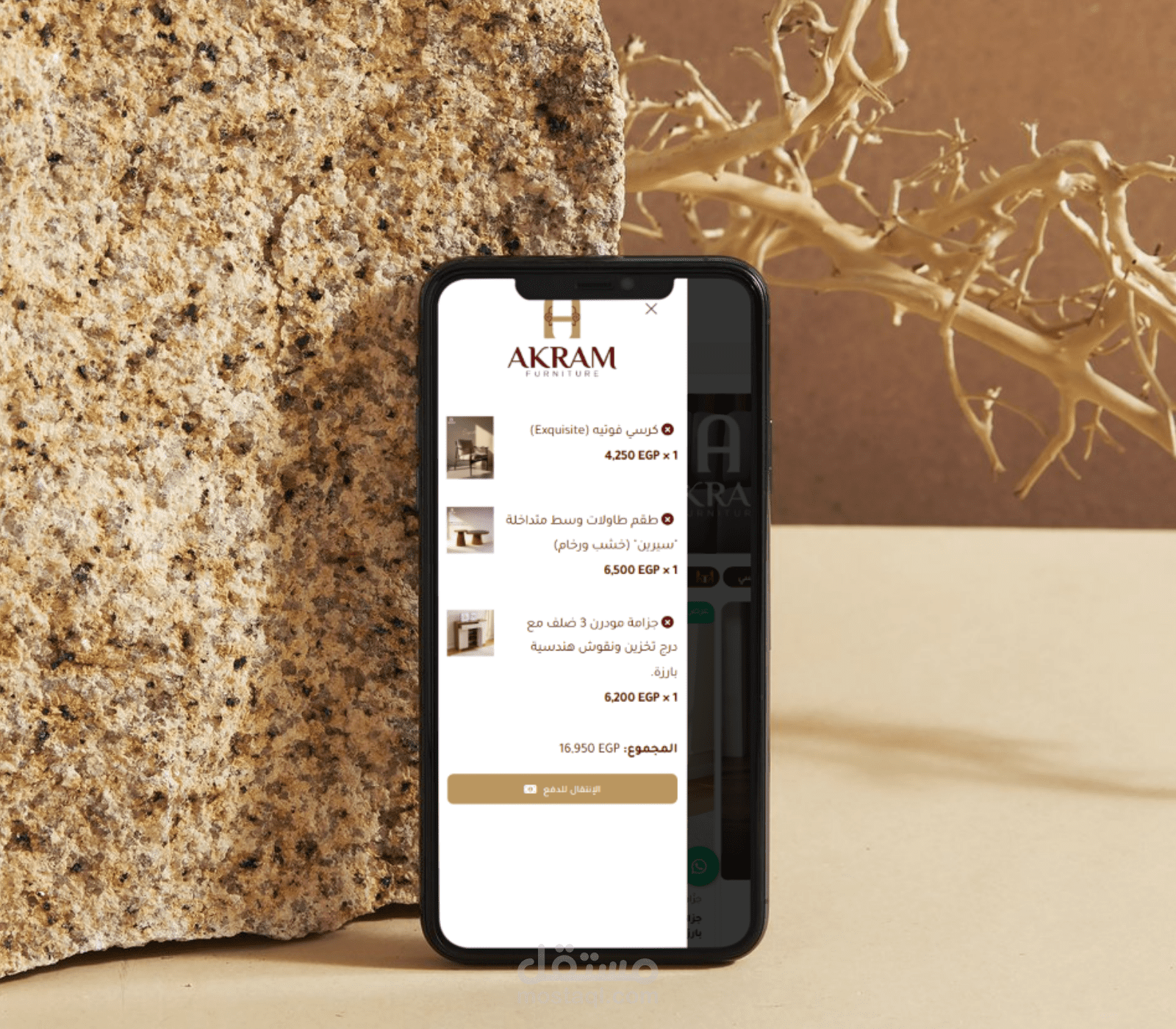 4-سلة مشتريات منبثقة (Cart Overlay): تصميم سلس يتيح للعميل مراجعة المنتجات المختارة (مثل: طقم طاولات، جزامة مودرن)، الكميات، وإجمالي السعر (المجموع)، مع زر واضح وسريع لـ "الانتقال للدفع" دون تعقيد.