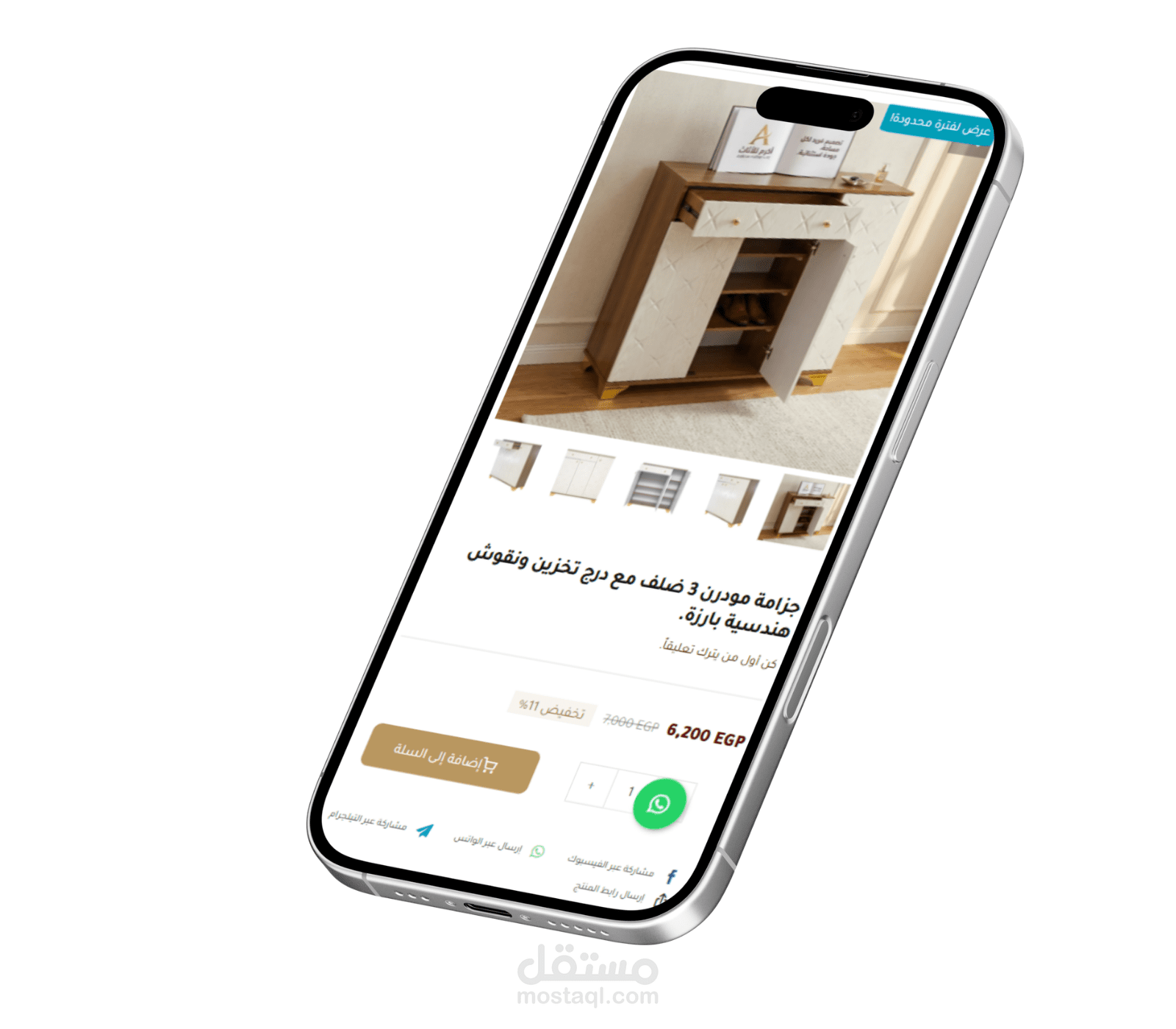 3-صفحة المنتج التفصيلية: تحتوي على معرض صور مصغر (Slider) للمنتج من زوايا مختلفة، واسم وصفي دقيق للمنتج، مع أزرار لمشاركة المنتج بسهولة عبر وسائل التواصل الاجتماعي (فيسبوك، تيليجرام، واتساب).