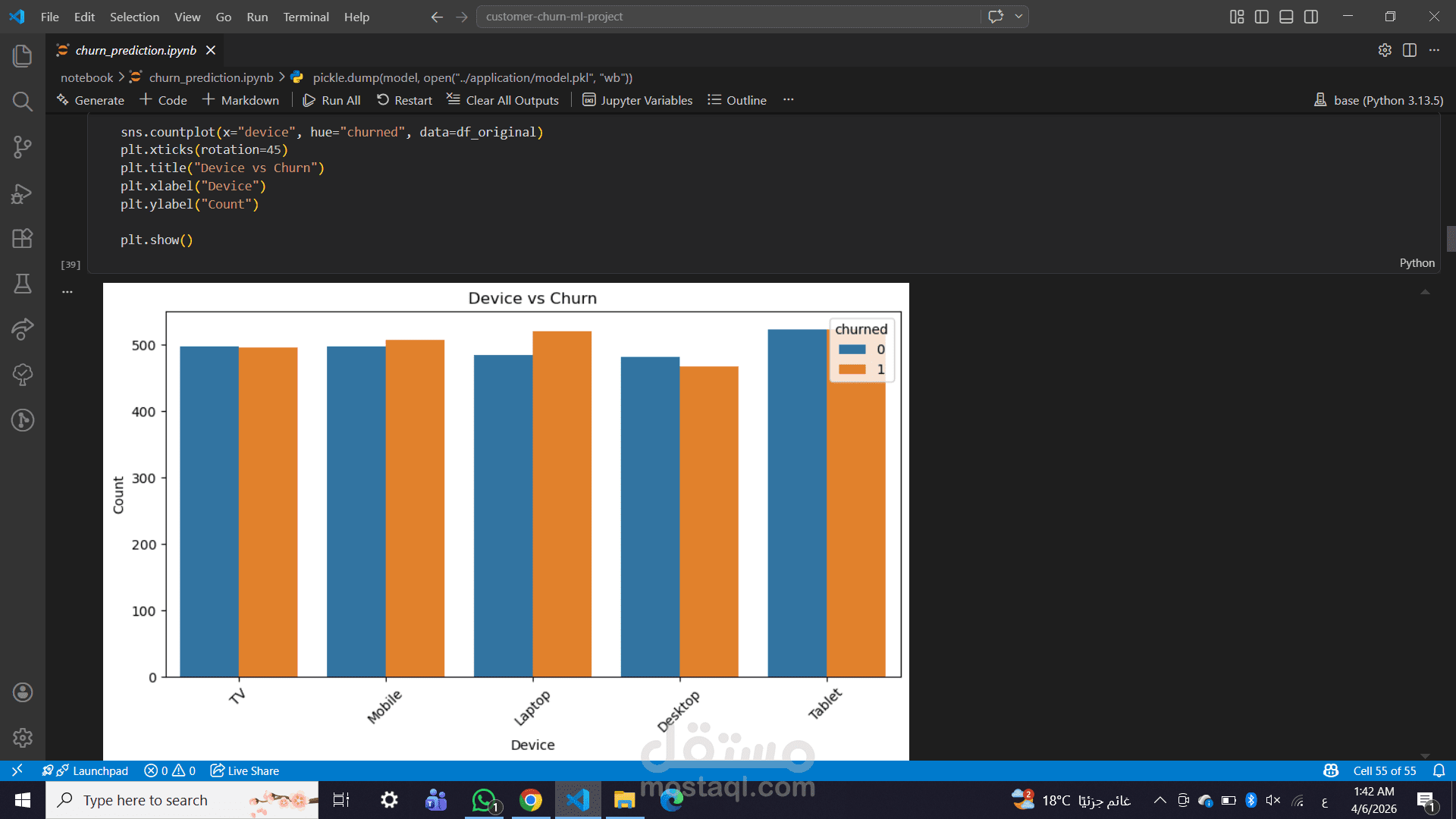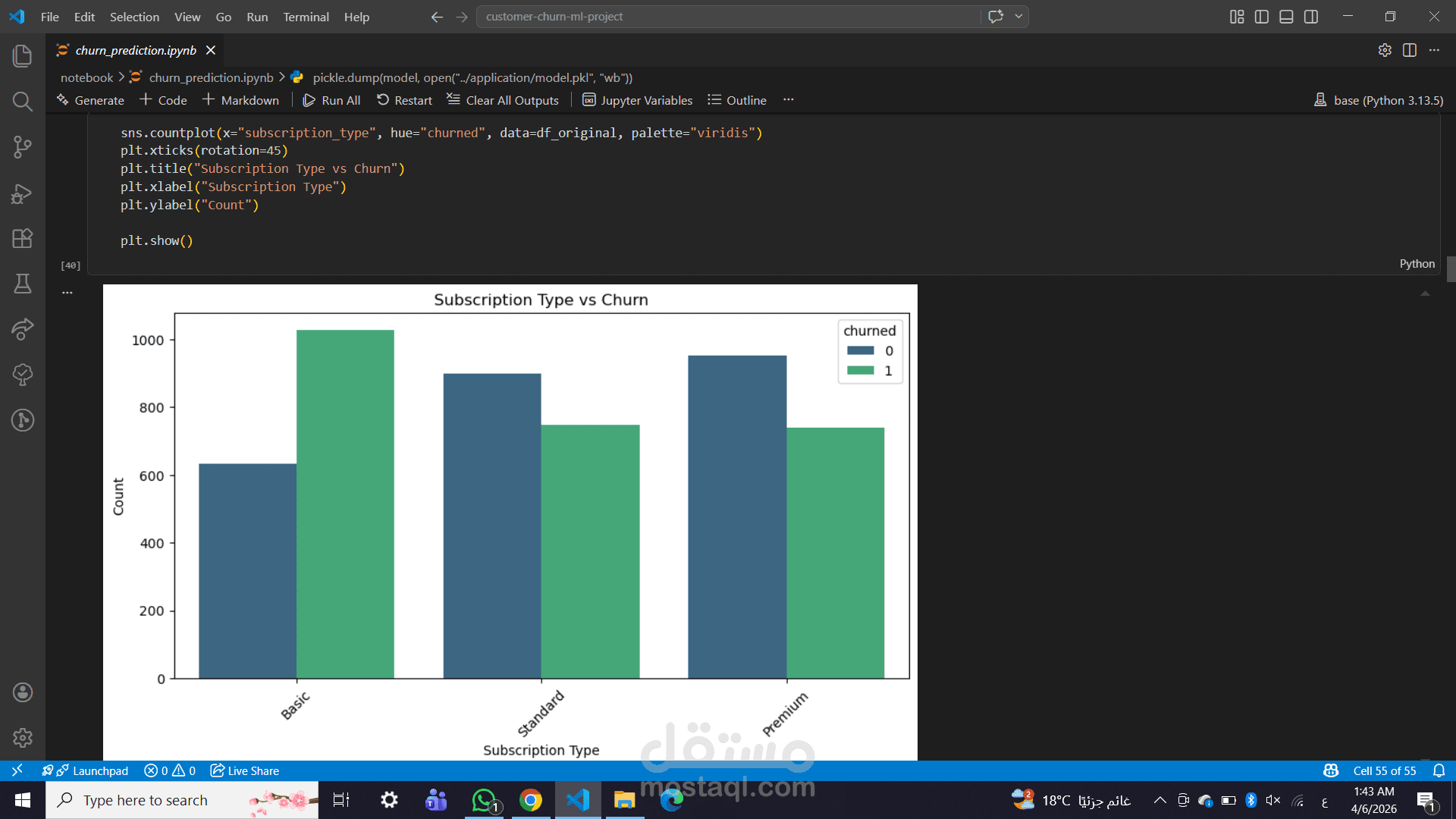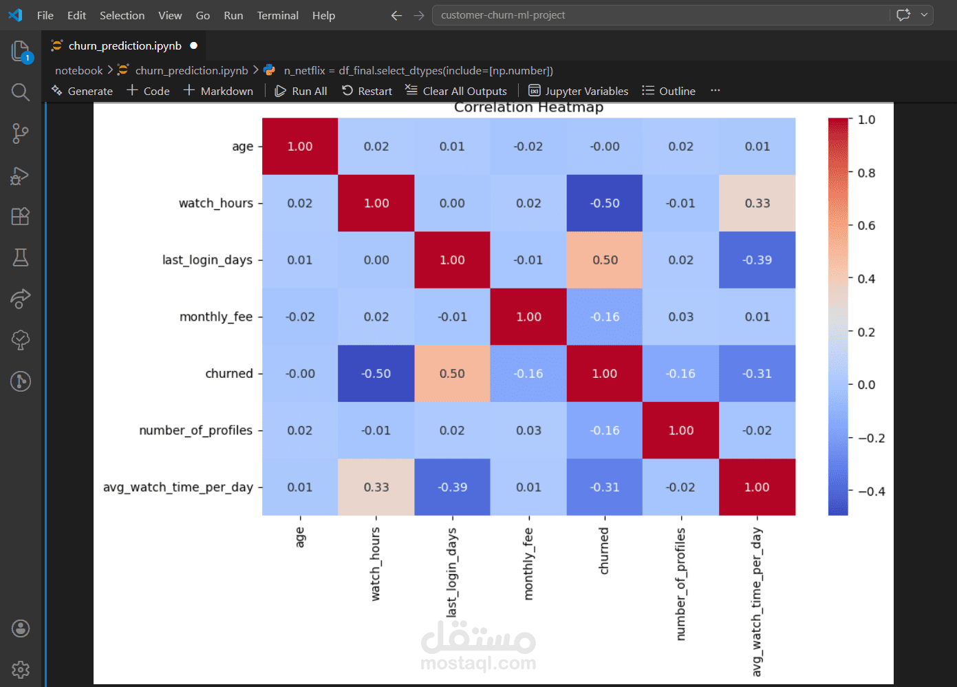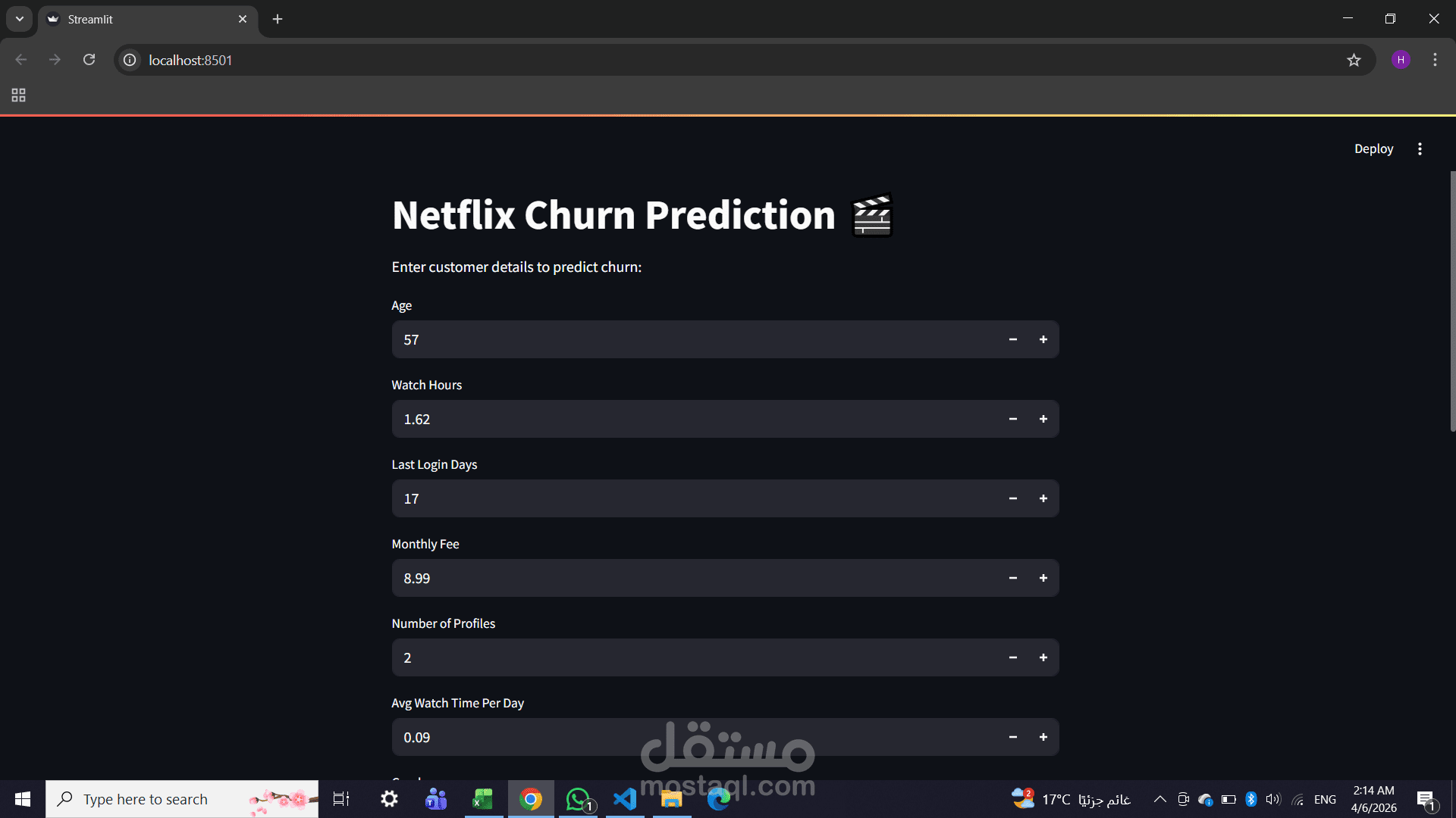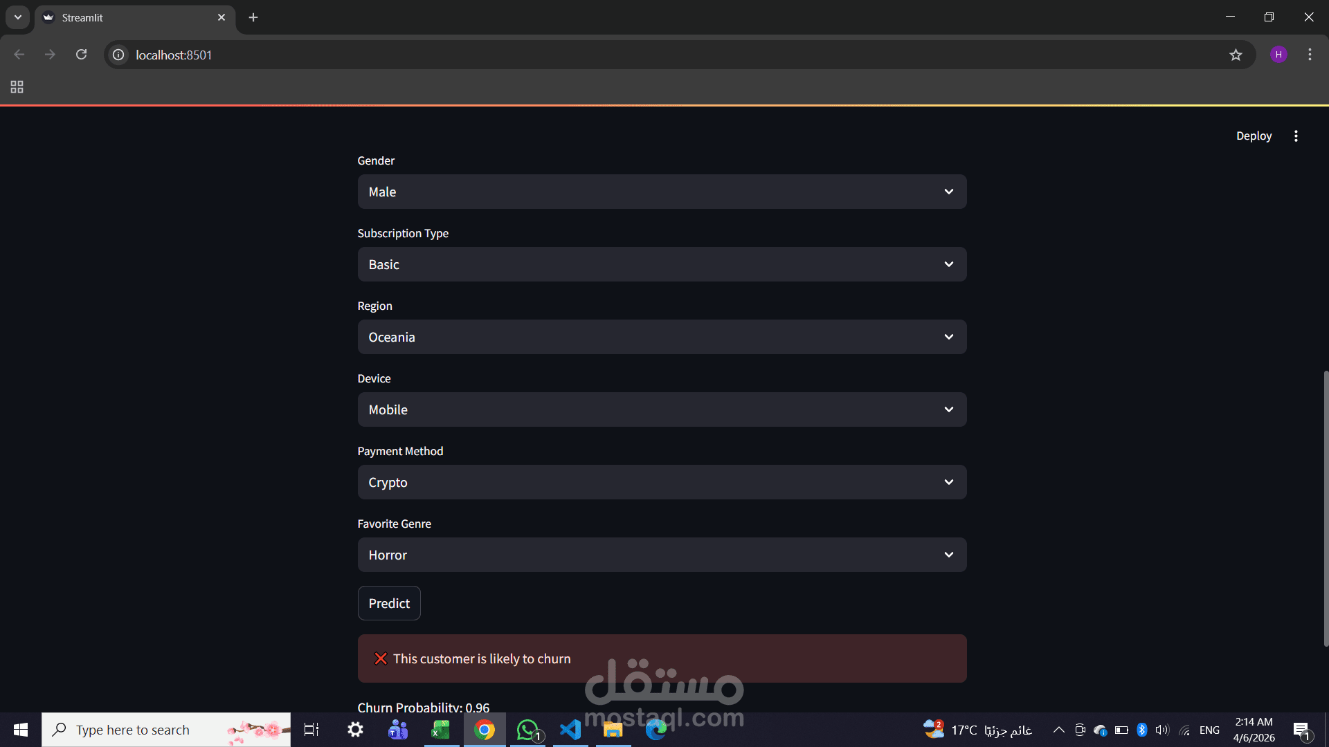 تطوير تطبيق ويب تفاعلي لتوقع ترك العملاء (Churn) لمنصة بث مشابهة لـ Netflix.