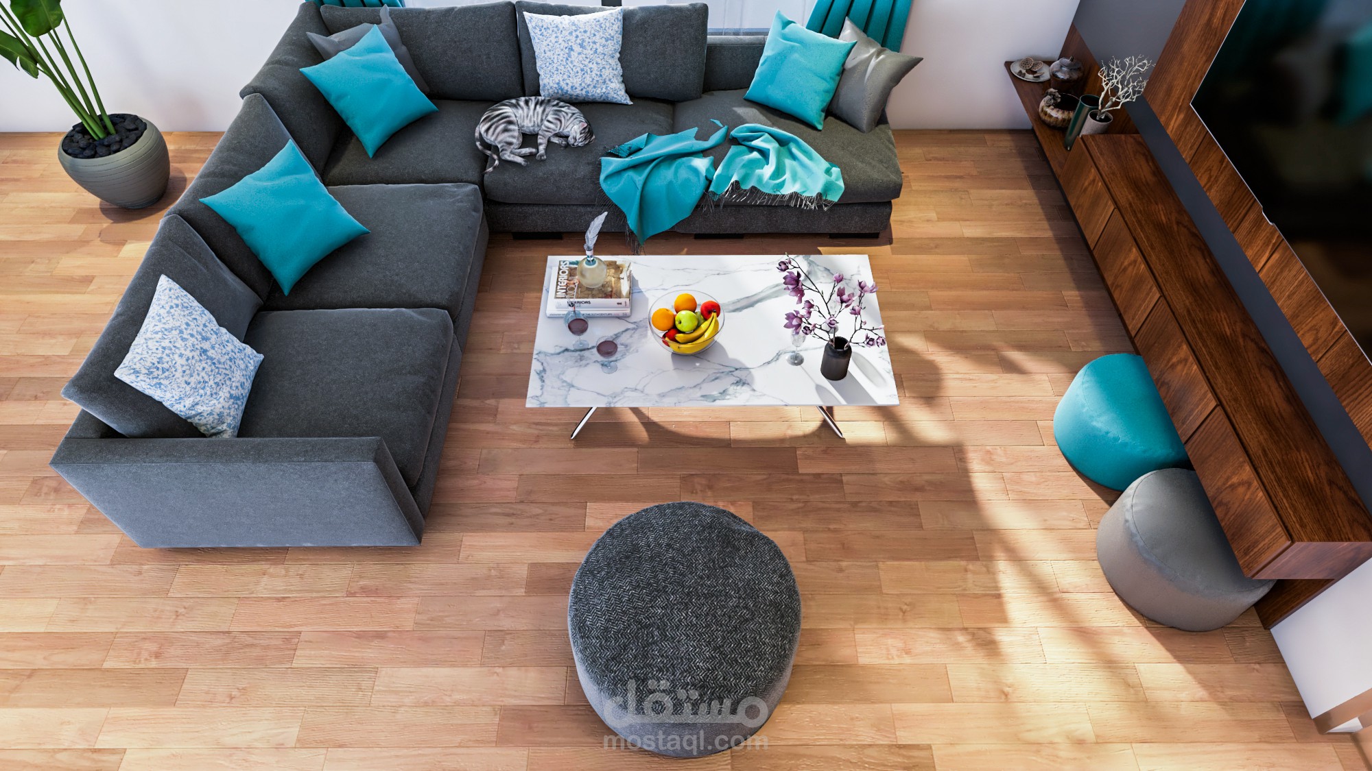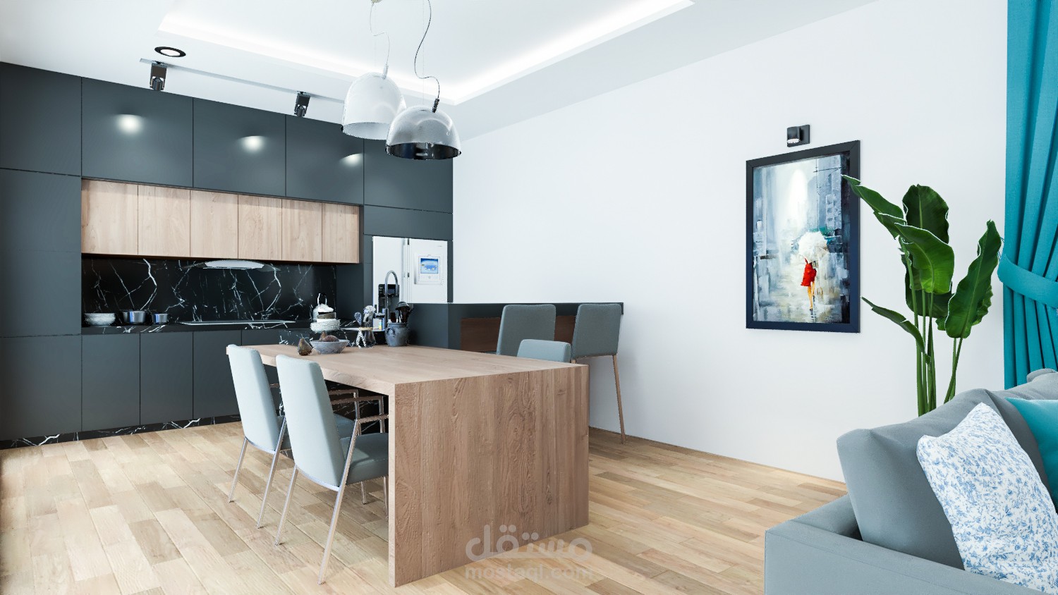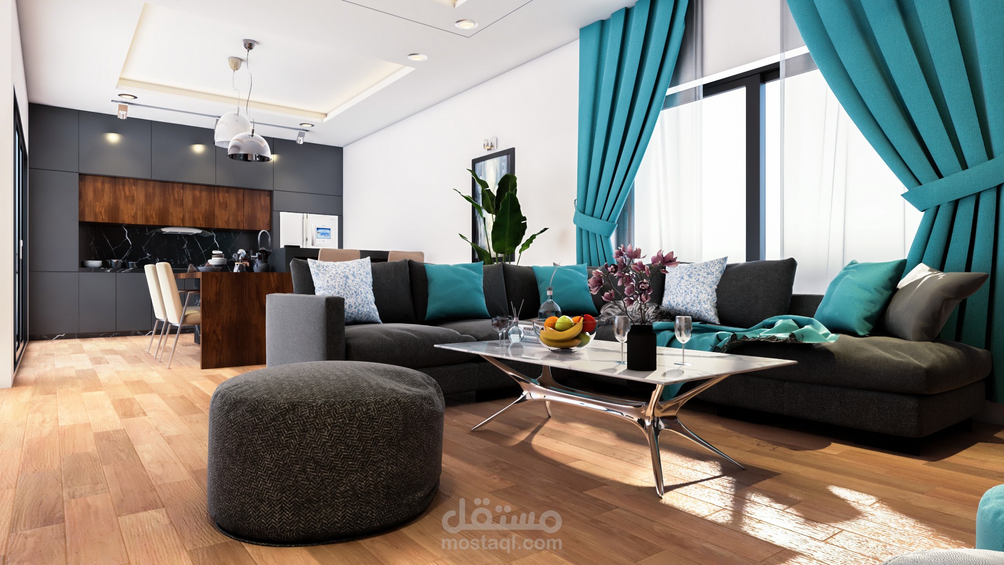 تصميم غرفة معيشة و مطبخ