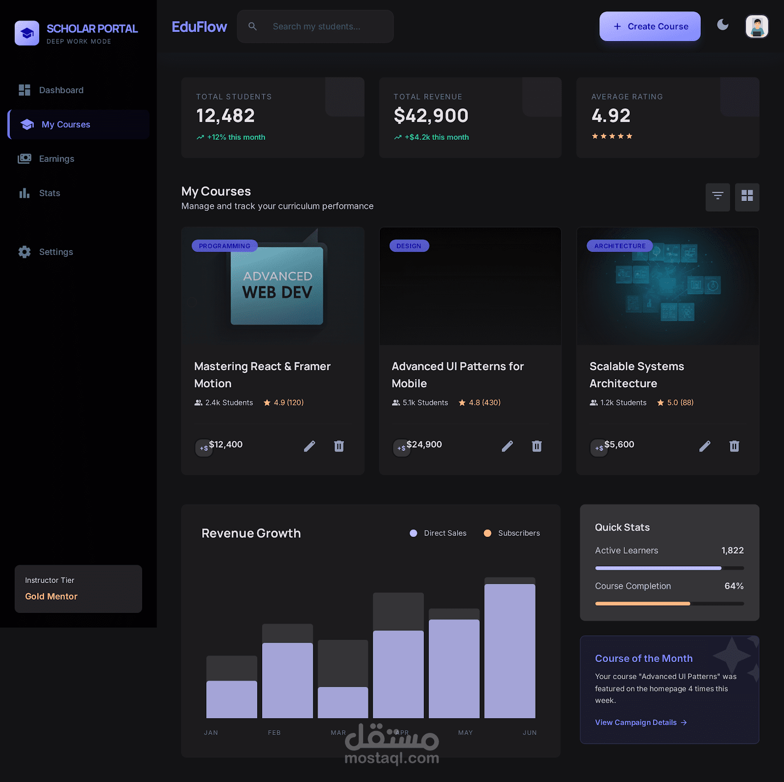 أما بالنسبة للطلاب، توفر EduFlow تجربة تعلم مرنة، حيث يمكنهم الوصول إلى الدورات في أي وقت ومن أي مكان، مع إمكانية التفاعل مع المحتوى وإجراء الاختبارات وتتبع تقدمهم بشكل مستمر.