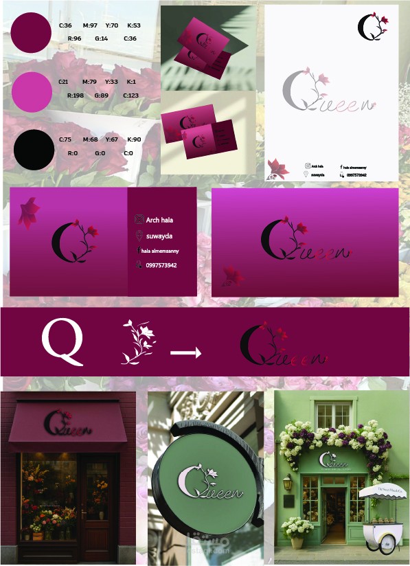 مشروع تصميم هوية بصرية متكاملة لعلامة تجارية متخصصة في الزهور وتنسيق الهدايا. تم استلهام الفكرة من الجمع بين فخامة الاسم "Queen" ونعومة الطبيعة، مع مراعاة التوازن الهندسي في بناء العناصر.