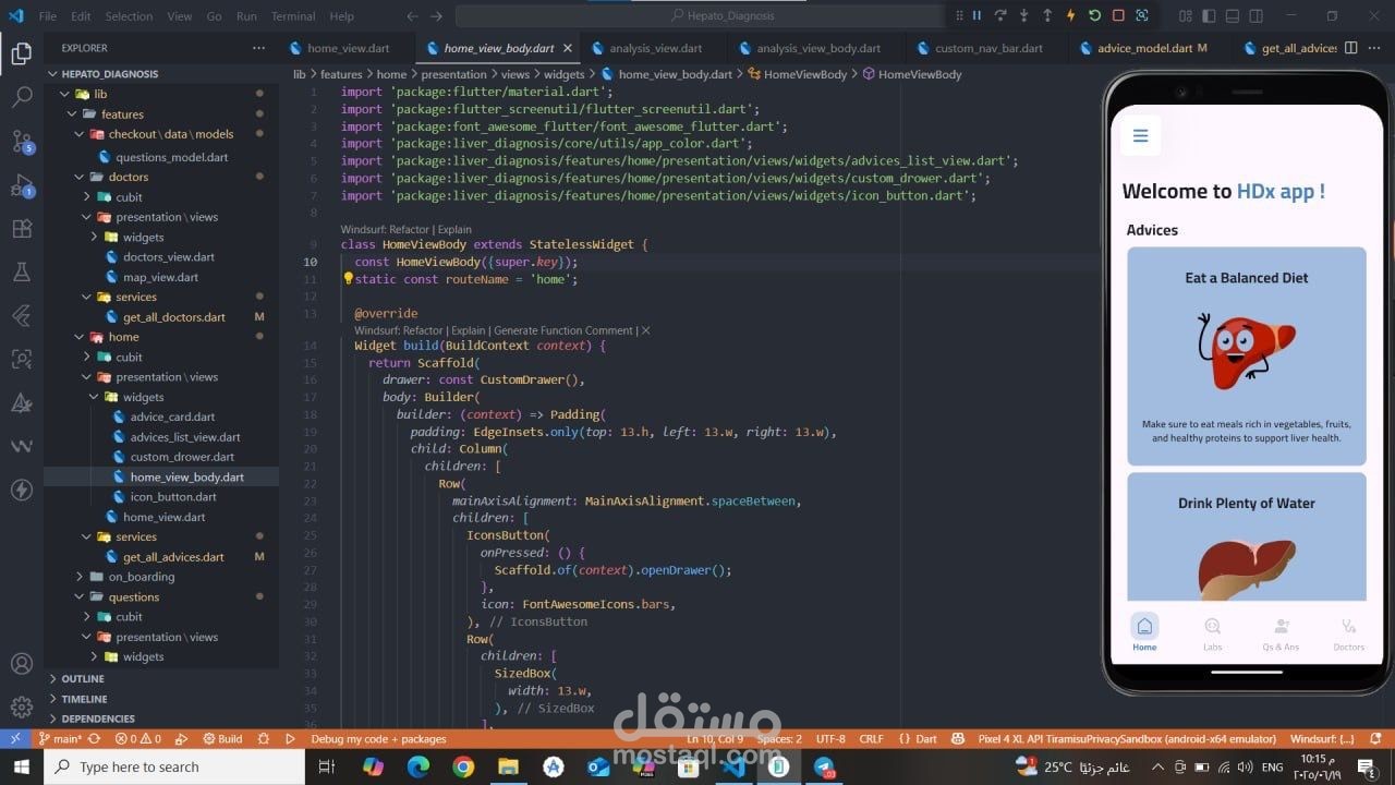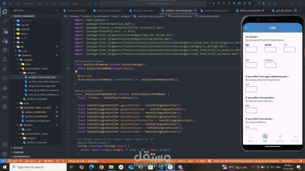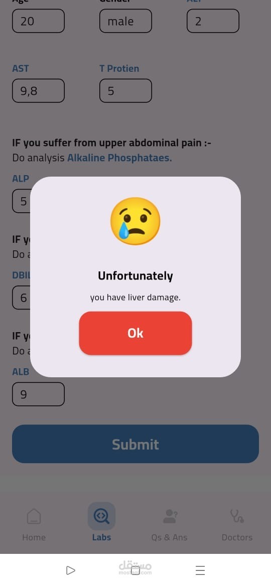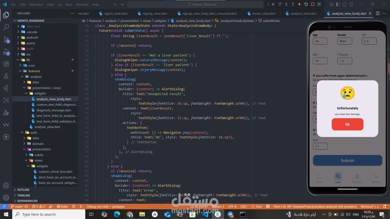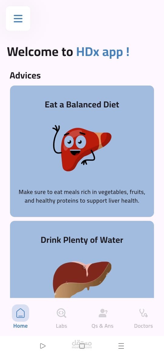 تطبيق صحي مبني باستخدام Flutter يقدّم تشخيصًا مبدئيًا لأمراض الكبد بالاعتماد على الذكاء الاصطناعي وتعلم الآلة. يقوم التطبيق بتحليل نتائج التحاليل الطبية باستخدام ML Model للتنبؤ بالحالة المحتملة للمريض. تم تطبيق MVVM Architecture مع Cubit لإدارة الحالة، ودمج Firebase Authentication لتسجيل الدخول الآمن، بالإضافة إلى استخدام Maps API لمساعدة المستخدمين في العثور على أطباء متخصصين قريبين حسب المحافظة، مع واجهة مستخدم مرنة وسهلة الاستخدام.