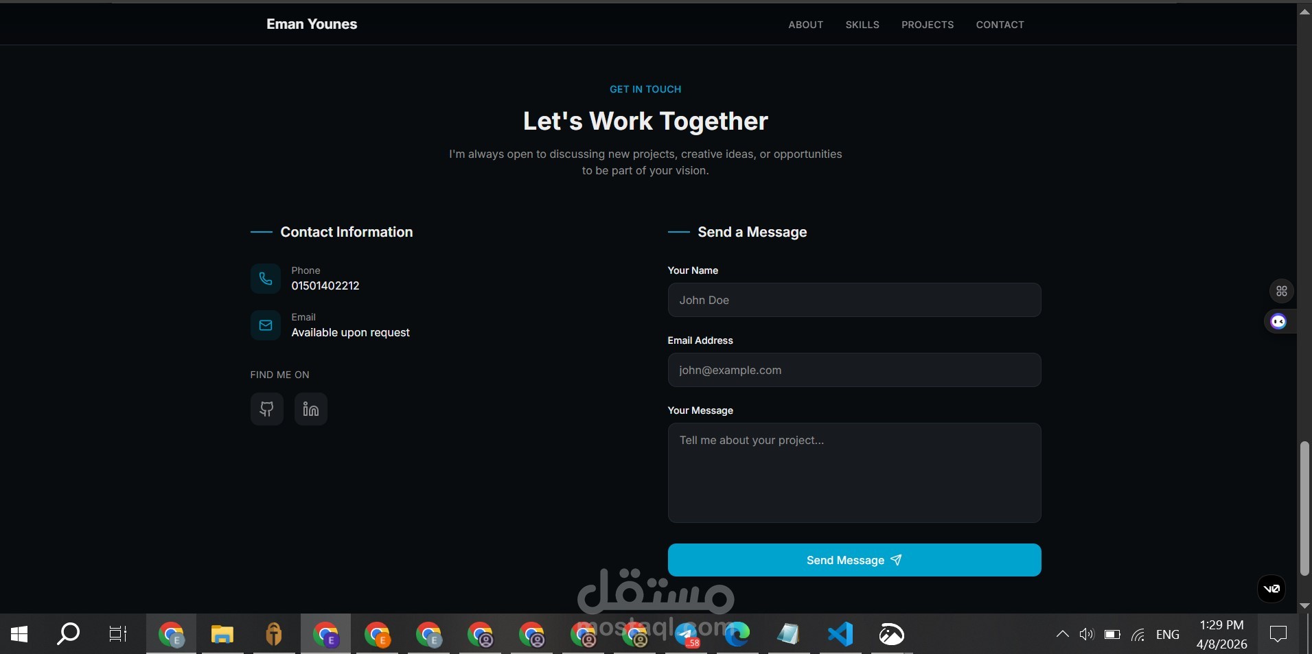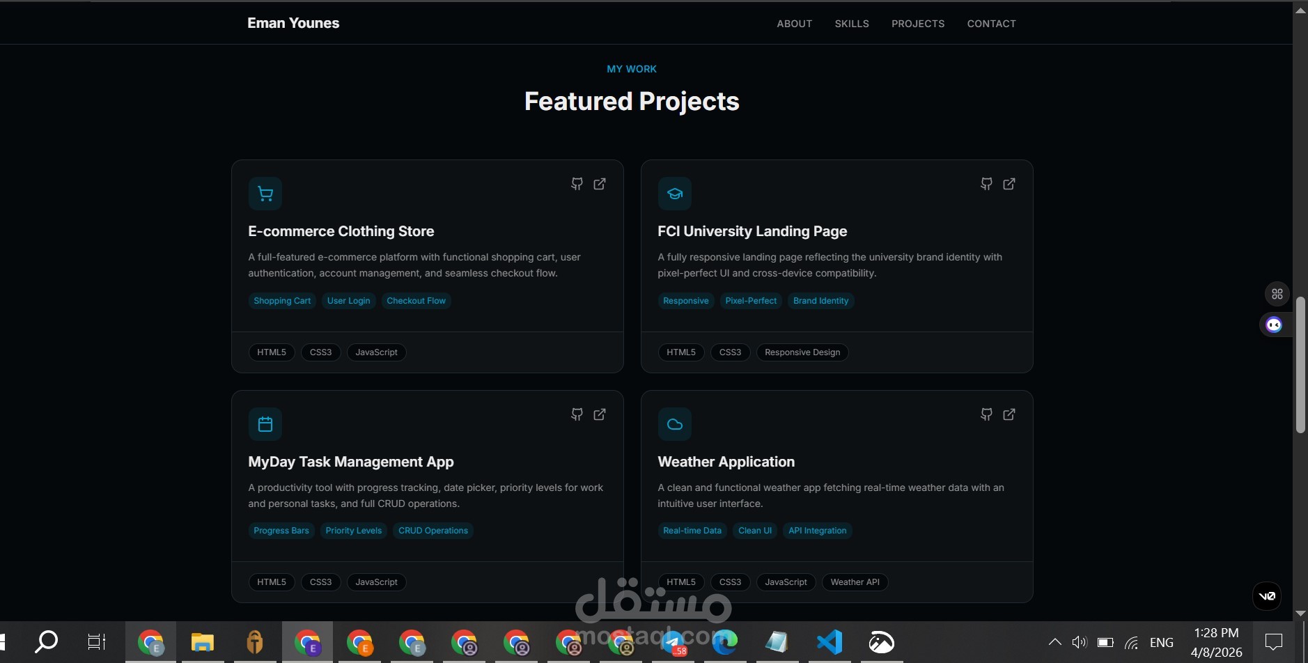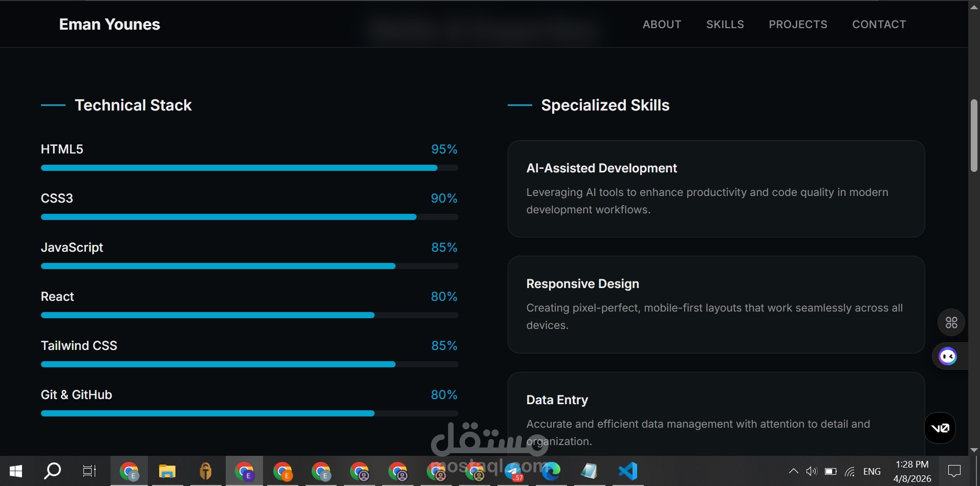 عرض المشاريع التفاعلي: قسم خاص للمشاريع يحتوي على بطاقات (Cards) تعرض تفاصيل كل مشروع، التقنيات المستخدمة، وروابط مباشرة للمعاينة.