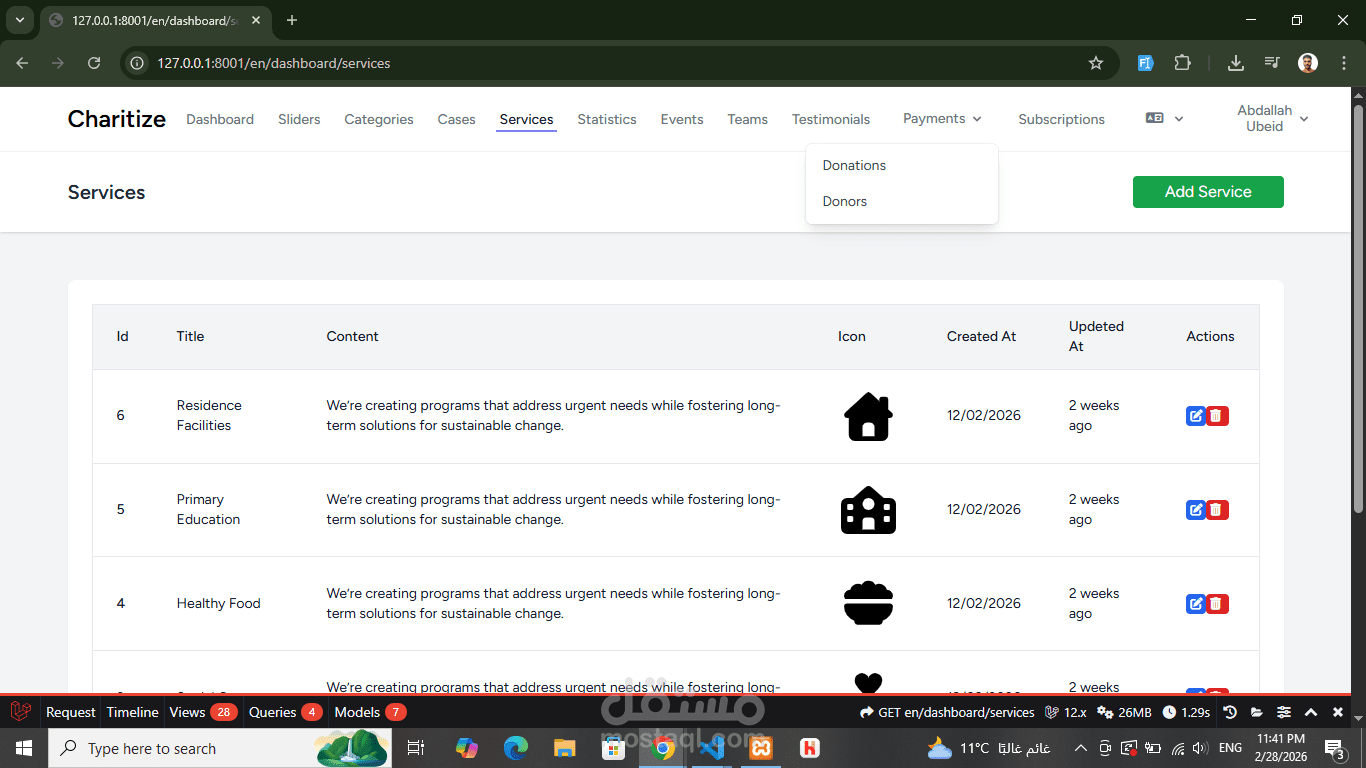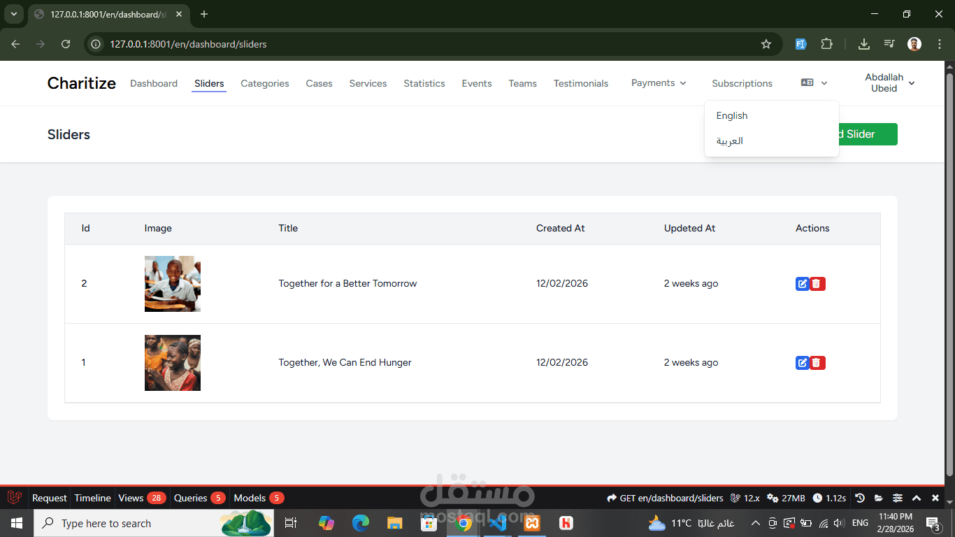 The system supports both authenticated users and guest donors, with multi-language support (Arabic & English).
