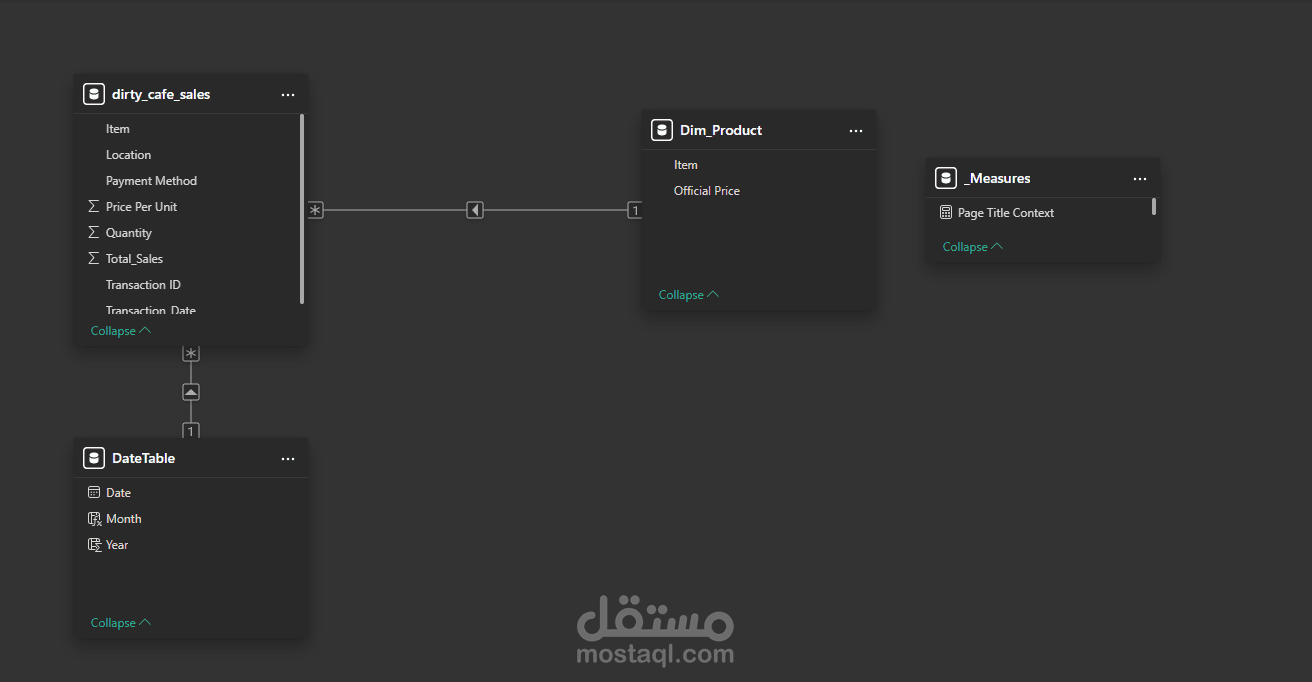 ? تم تصميم Data Model باستخدام Star Schema لربط البيانات بشكل احترافي، مع إنشاء Measures متقدمة باستخدام DAX لحساب أهم المؤشرات مثل: