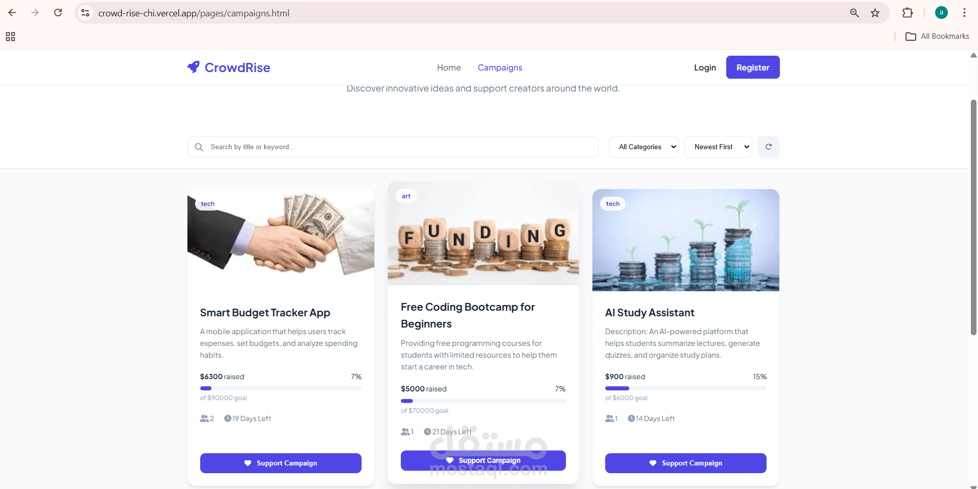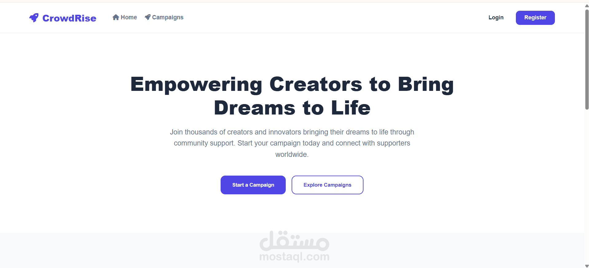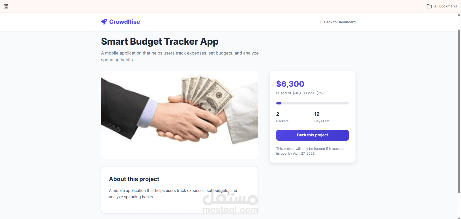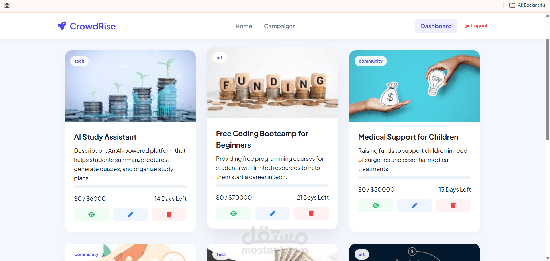 CrowdRise هي منصة تمويل جماعي (Crowdfunding Platform) تعمل بالكامل على جانب العميل (Client-Side) باستخدام تقنيات الويب الأساسية: HTML وCSS وJavaScript.