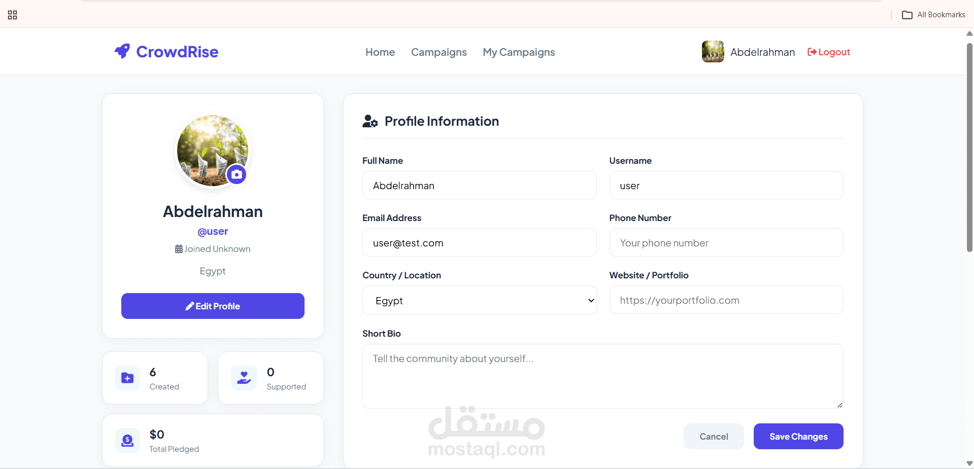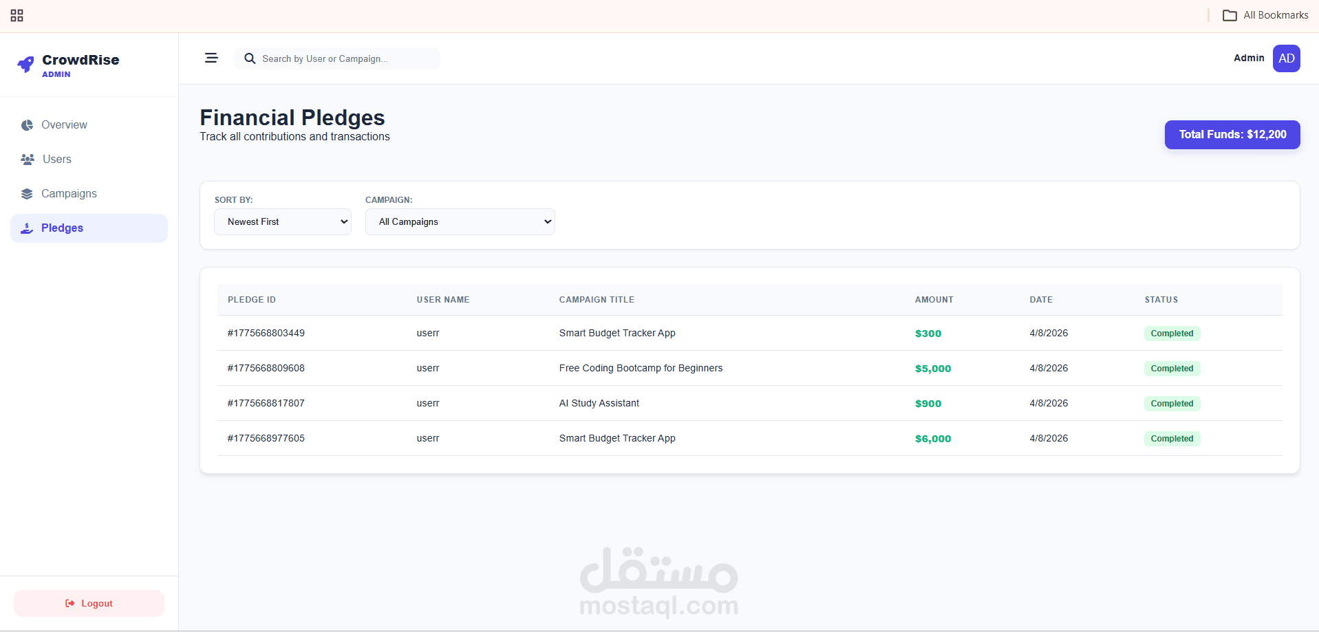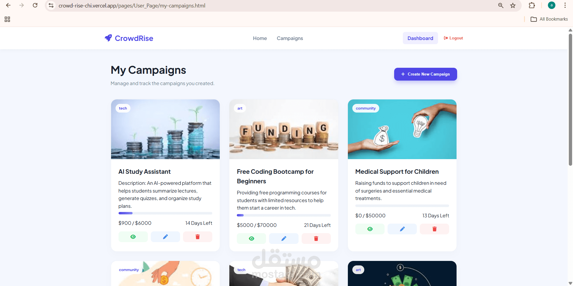 CrowdRise هي منصة تمويل جماعي (Crowdfunding Platform) تعمل بالكامل على جانب العميل (Client-Side) باستخدام تقنيات الويب الأساسية: HTML وCSS وJavaScript.