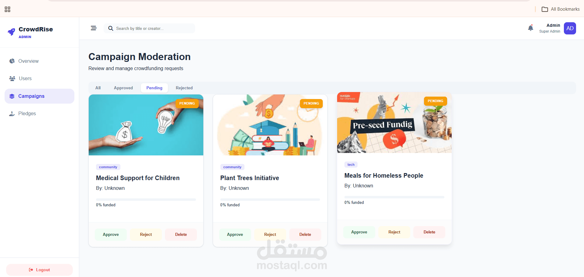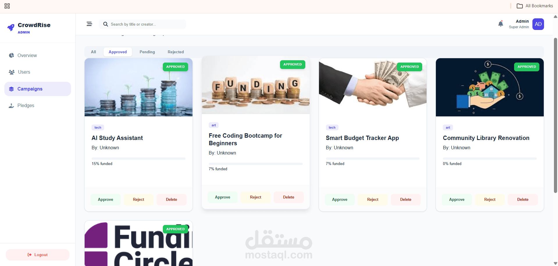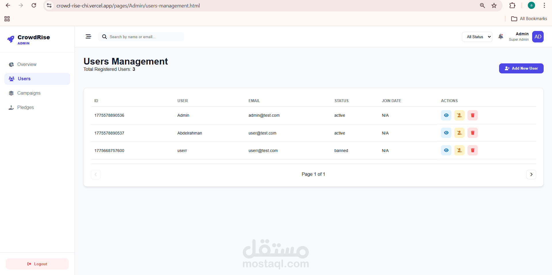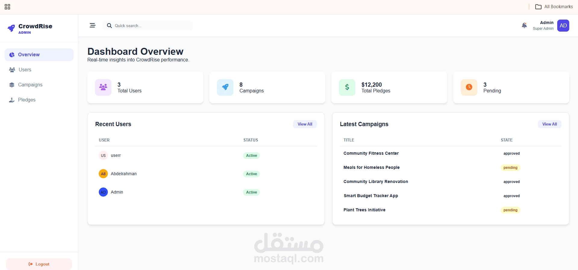 CrowdRise هي منصة تمويل جماعي (Crowdfunding Platform) تعمل بالكامل على جانب العميل (Client-Side) باستخدام تقنيات الويب الأساسية: HTML وCSS وJavaScript.