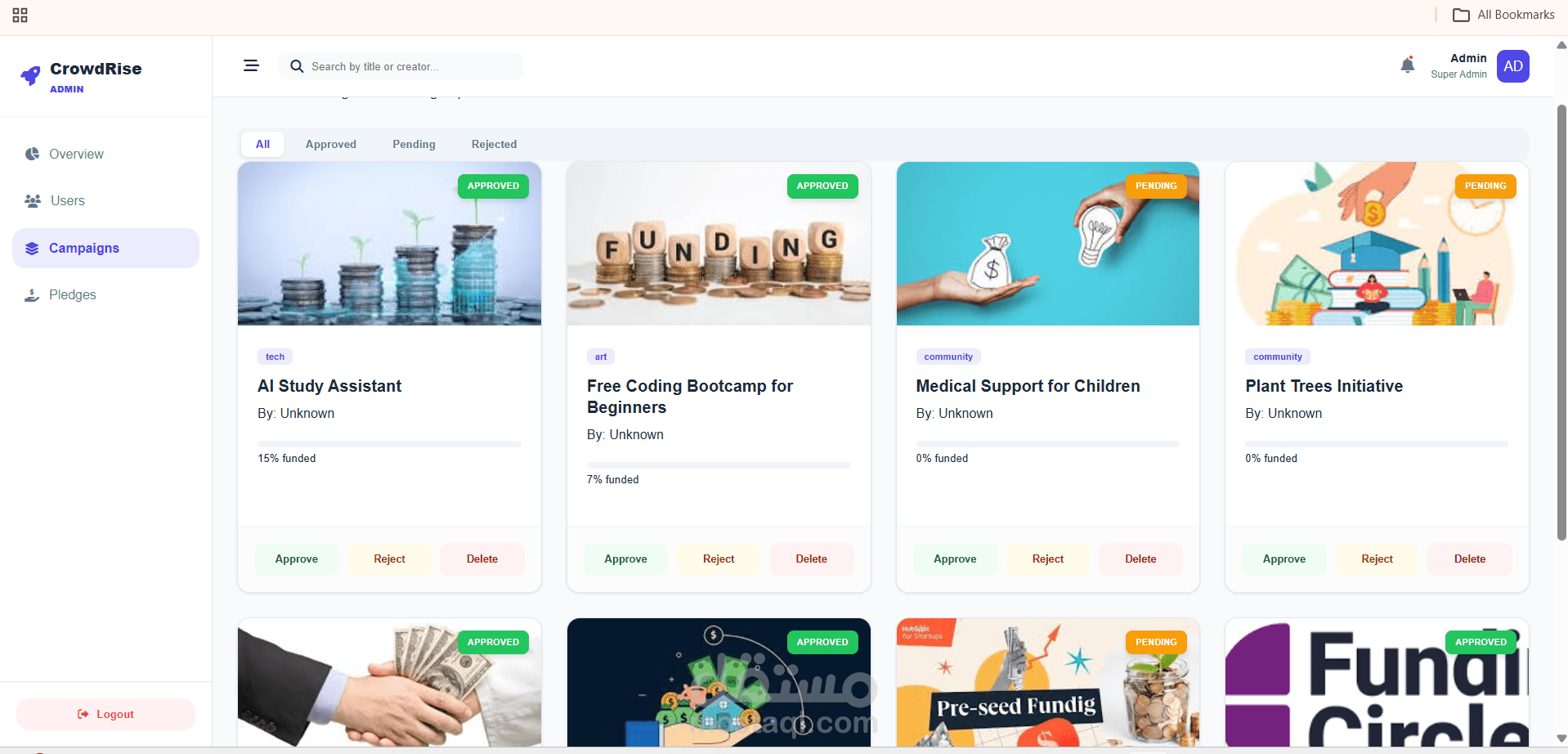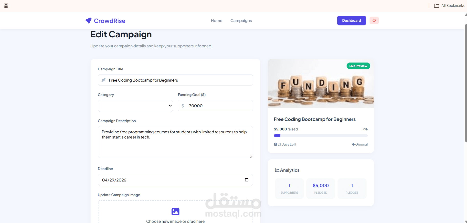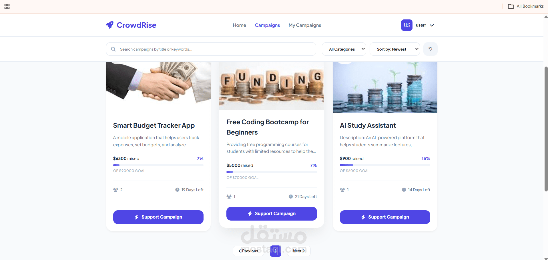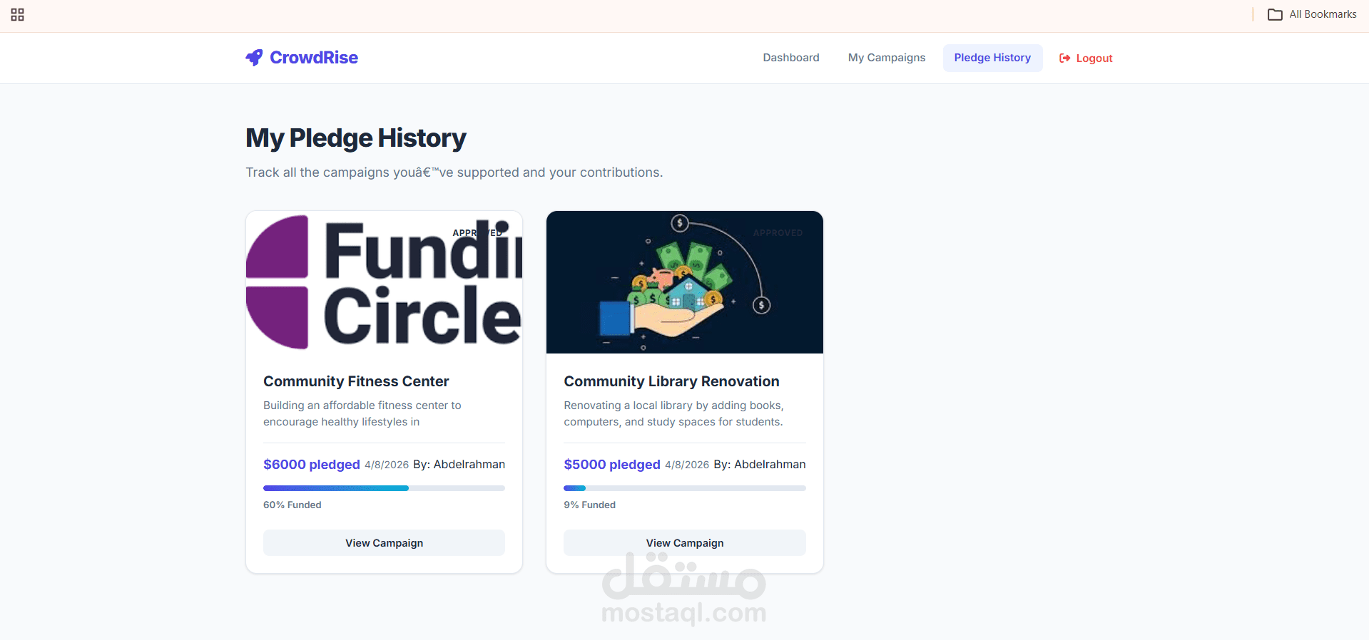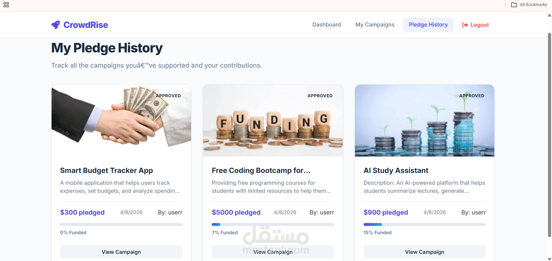 تتيح المنصة للمستخدمين إنشاء حملات تمويل خاصة بهم، دعم حملات الآخرين من خلال نظام التبرعات (Pledges)، بالإضافة إلى إدارة الملف الشخصي الخاص بالمستخدم، مع تحديثات ديناميكية فورية لواجهة المستخدم عبر جميع الصفحات.