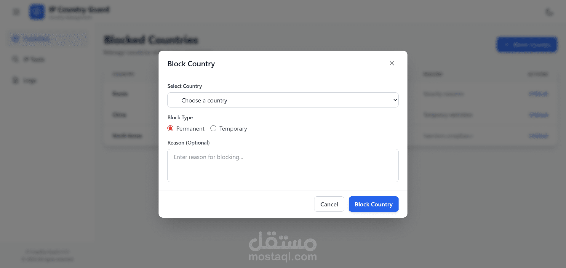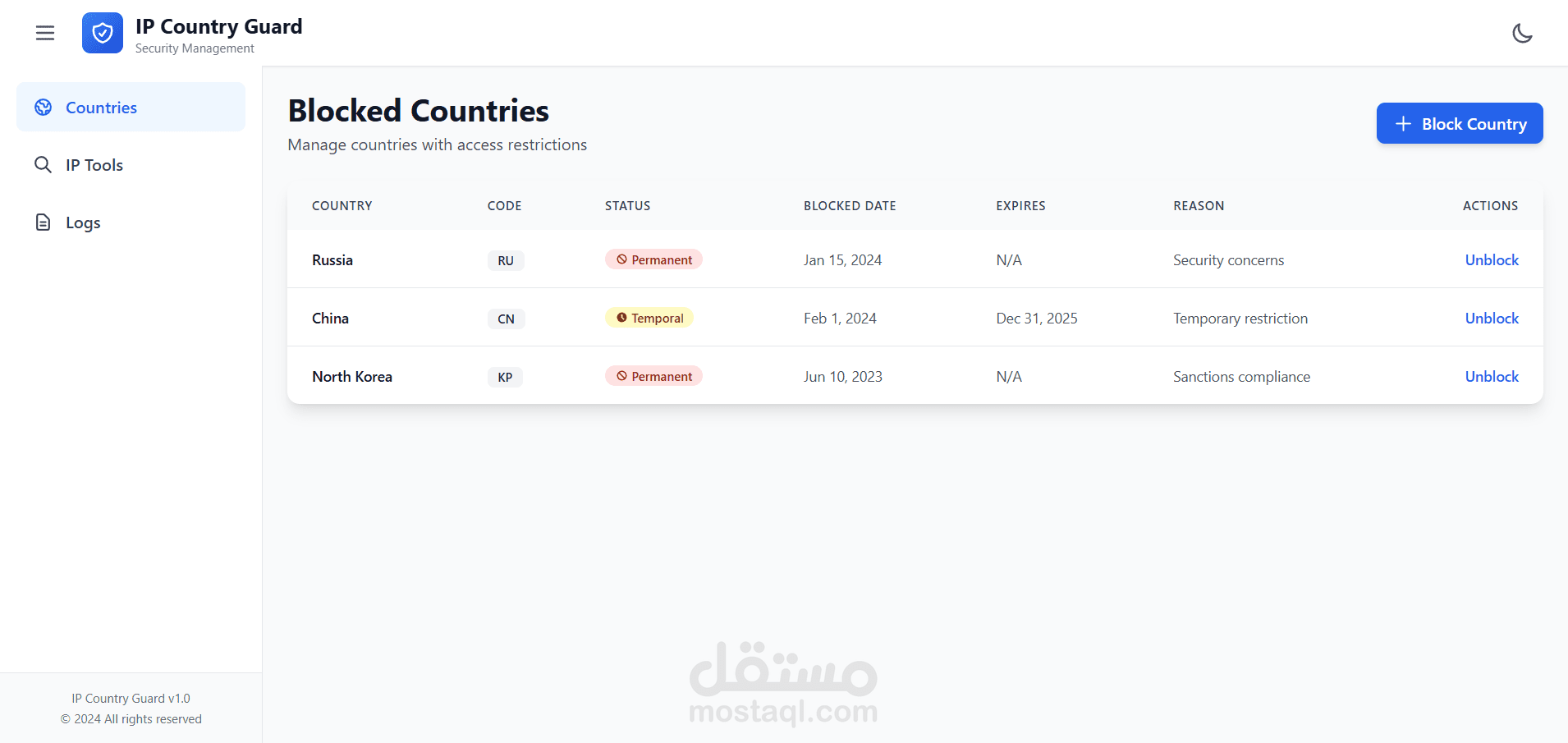 قمت بتطوير نظام متكامل **Full-Stack** باستخدام **.NET 8 Web API** و **Angular** لإدارة التحكم في الوصول بناءً على الدولة. قمت بتنفيذ **تحديد الموقع الجغرافي عبر عنوان الـ IP**، وميزات **حظر وإلغاء حظر الدول**، بالإضافة إلى **الحظر المؤقت مع انتهاء تلقائي للمدة المحددة**، مع توفير **سجل تدقيق شامل (Audit Logging)** لجميع العمليات. كما قمت بتصميم النظام وفق **Three-Tier Architecture** مع طبقات **Service** و **Repository** نظيفة ومنظمة، وتطبيق **التحقق من صحة الـ DTOs**، وتوثيق الـ APIs باستخدام **Swagger** لضمان سهولة التكامل وقابلية التوسع.