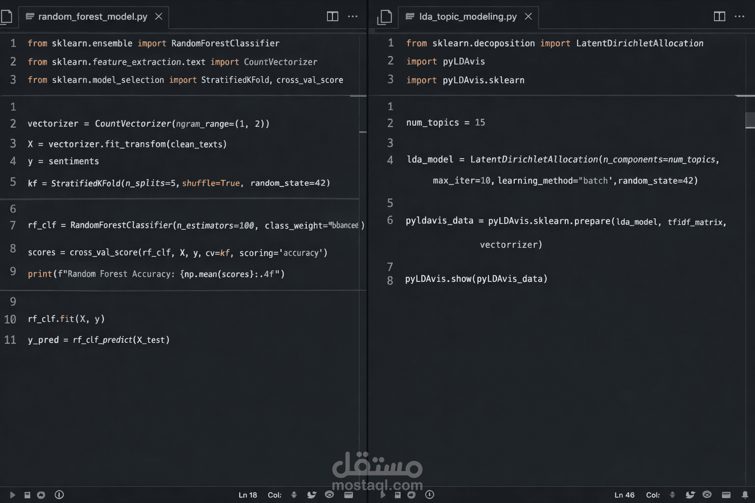تنظيف البيانات ومعالجتها: إزالة الروابط، والهاشتاجات، والـ mentions، وتحويل النصوص إلى تمثيل رقمي باستخدام TF-IDF.