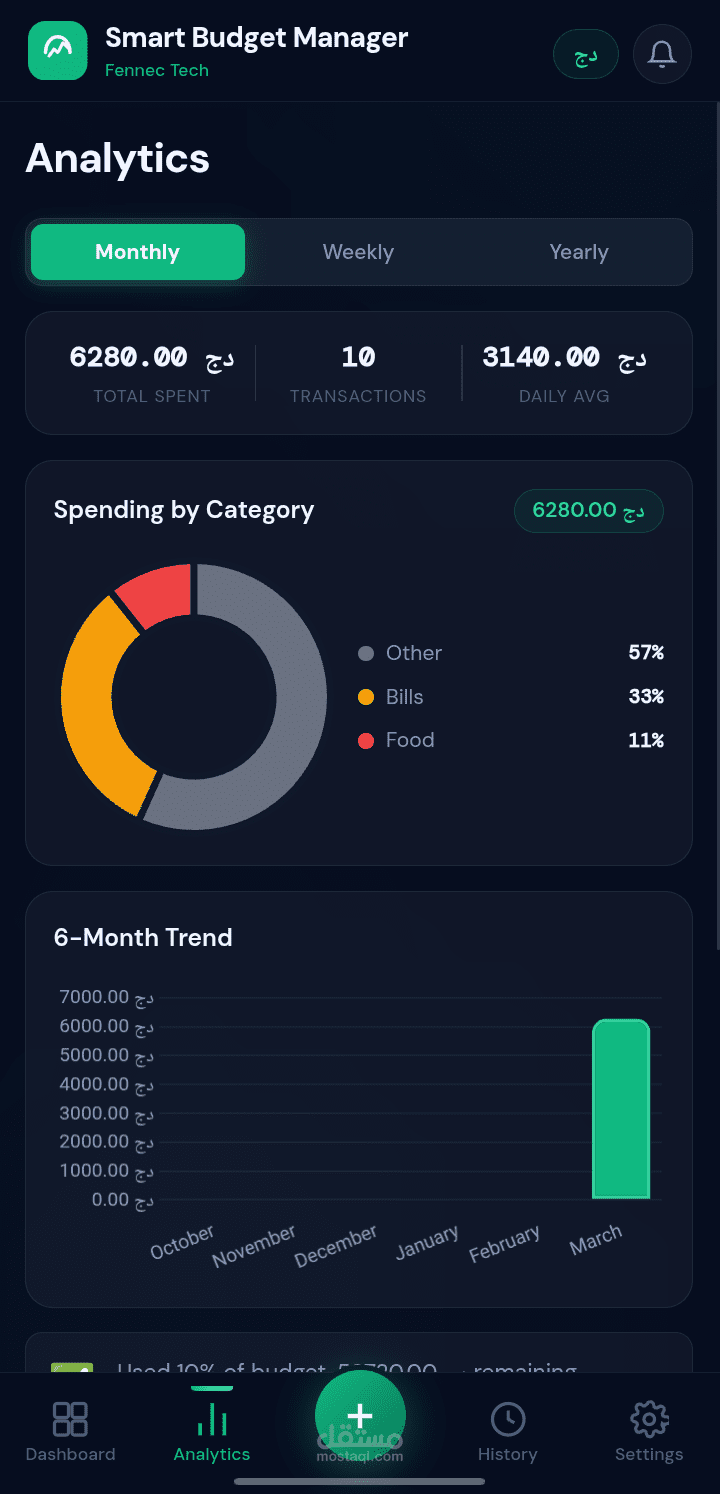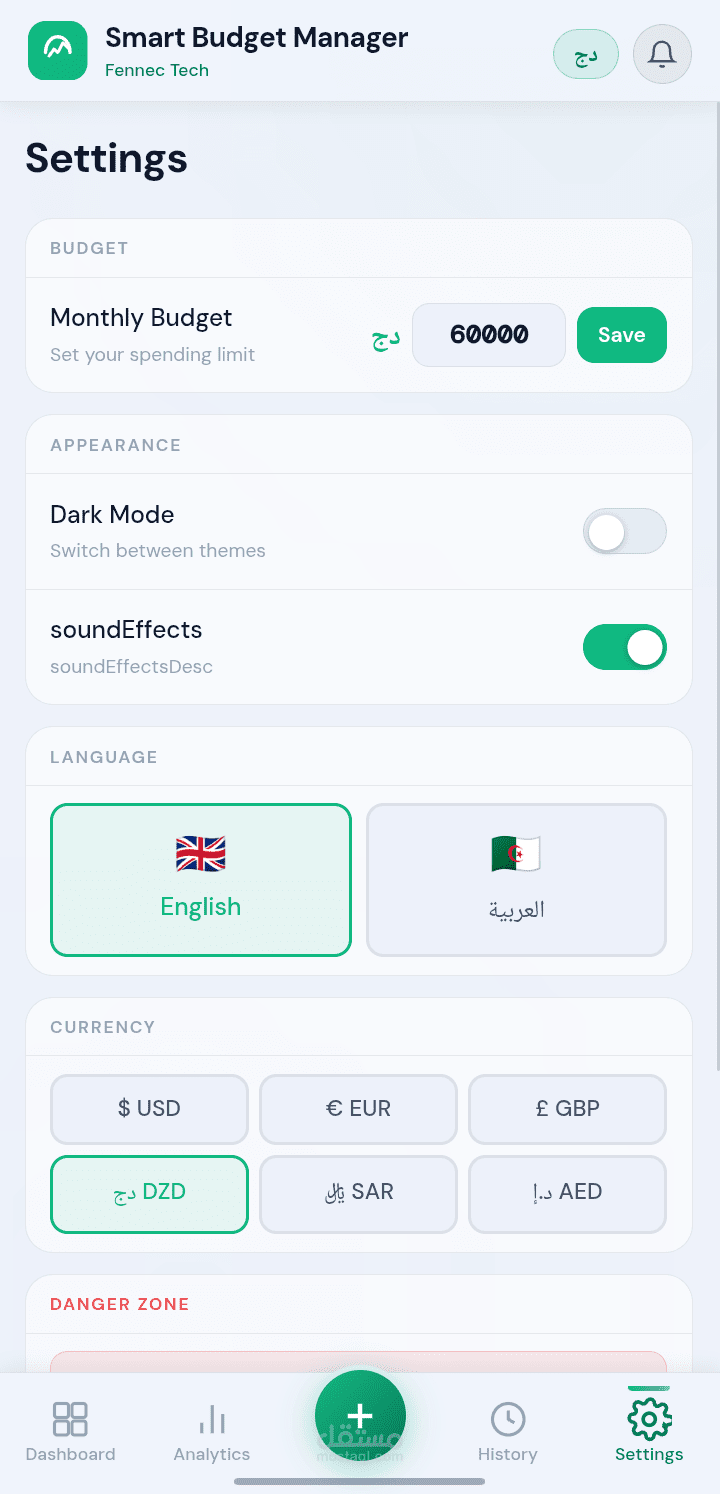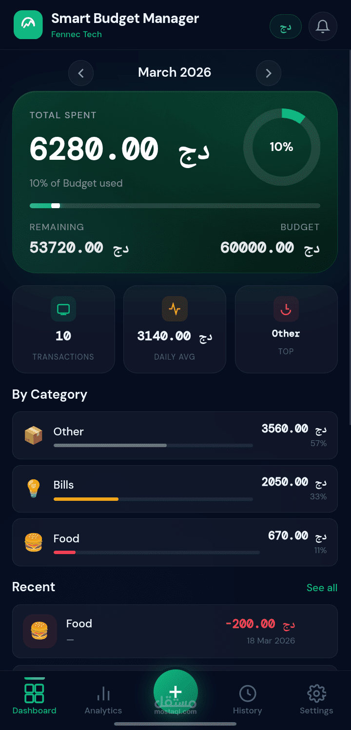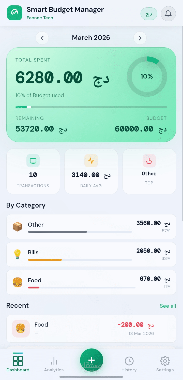 يتيح التطبيق للمستخدم تسجيل نفقاته وإيراداته بسهولة، مع عرض البيانات بشكل واضح يساعد على اتخاذ قرارات مالية أفضل وتحسين التحكم في المصاريف.