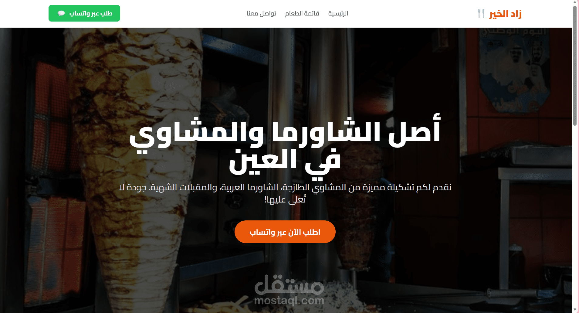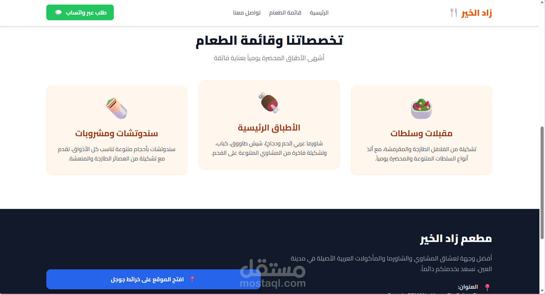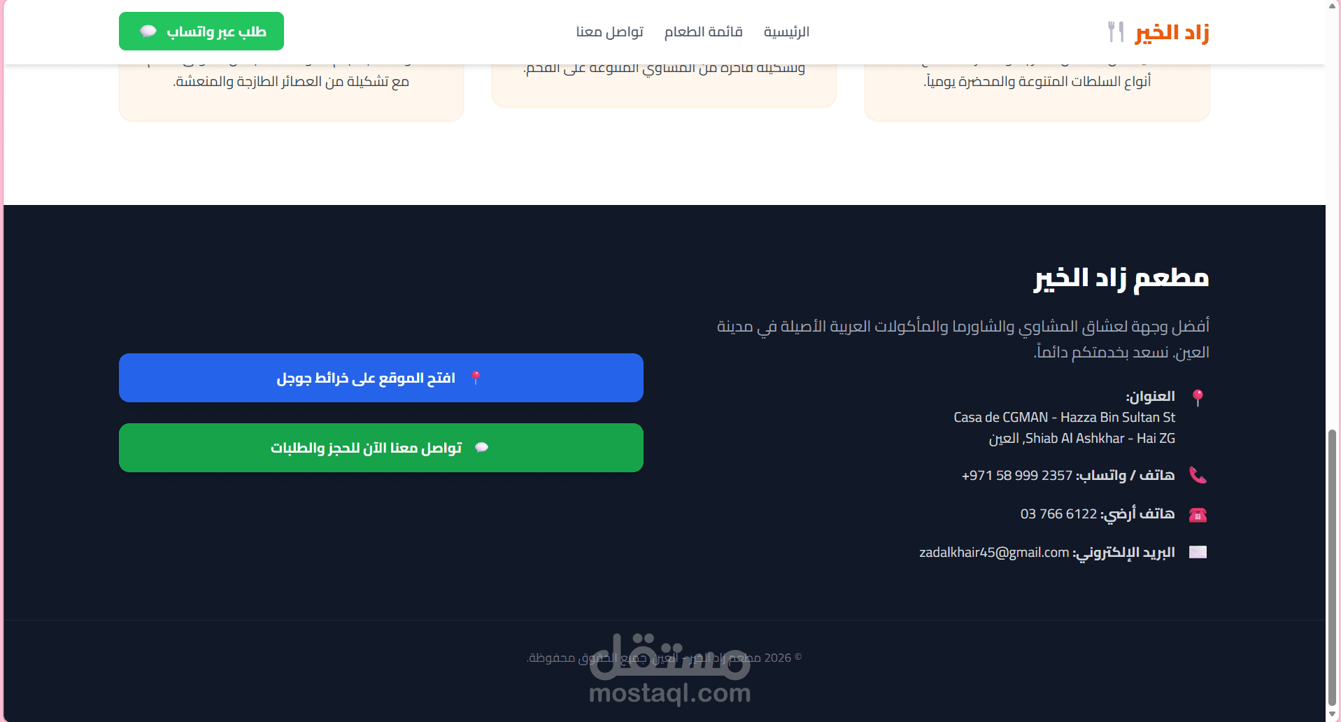 عبارة عن Landing page لمطعم زاد الخير الاماراتي فيها header, footer, tabs وتواصل عبر الواتساب وlocation المطعم والايميل الرسمي بتاعهم للتواصل ورقم الهاتف الارضي ورقم الواتساب وجزء من اللي بيقدمه المطعم من مشاوي ومقبلات