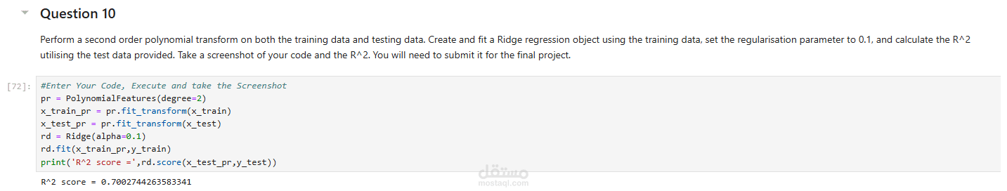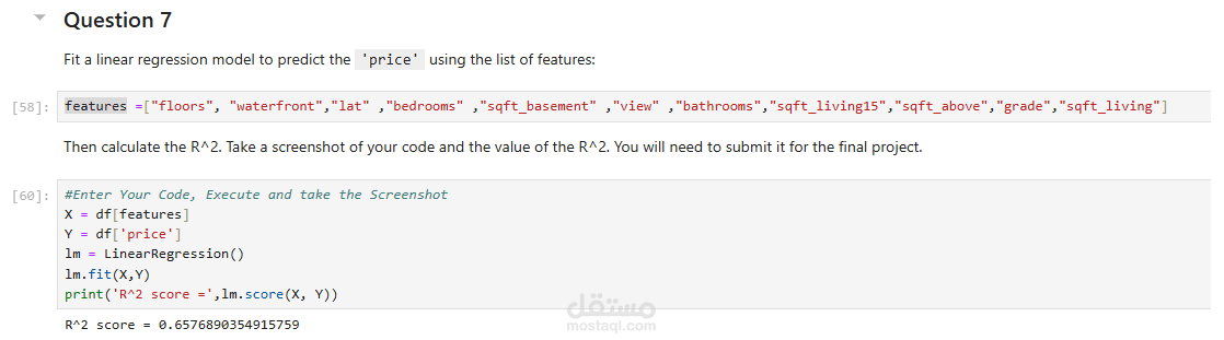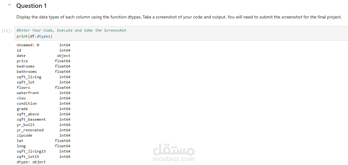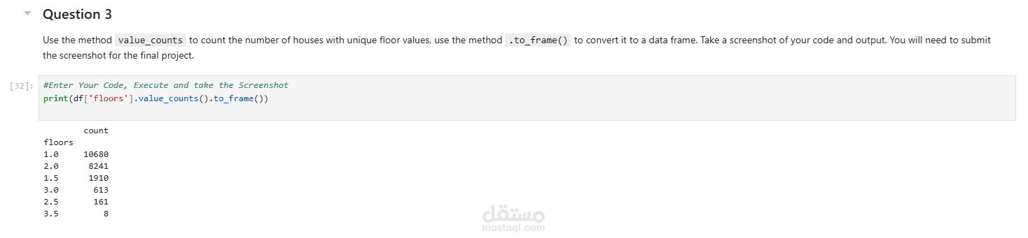 working at a Real Estate Investment Trust. The Trust would like to start investing in Residential real estate. You are tasked with determining the market price of a house given a set of features. You will analyze and predict housing prices using attributes or features such as square footage, number of bedrooms, number of floors, and so on. This is a template notebook; your job is to complete the ten questions.