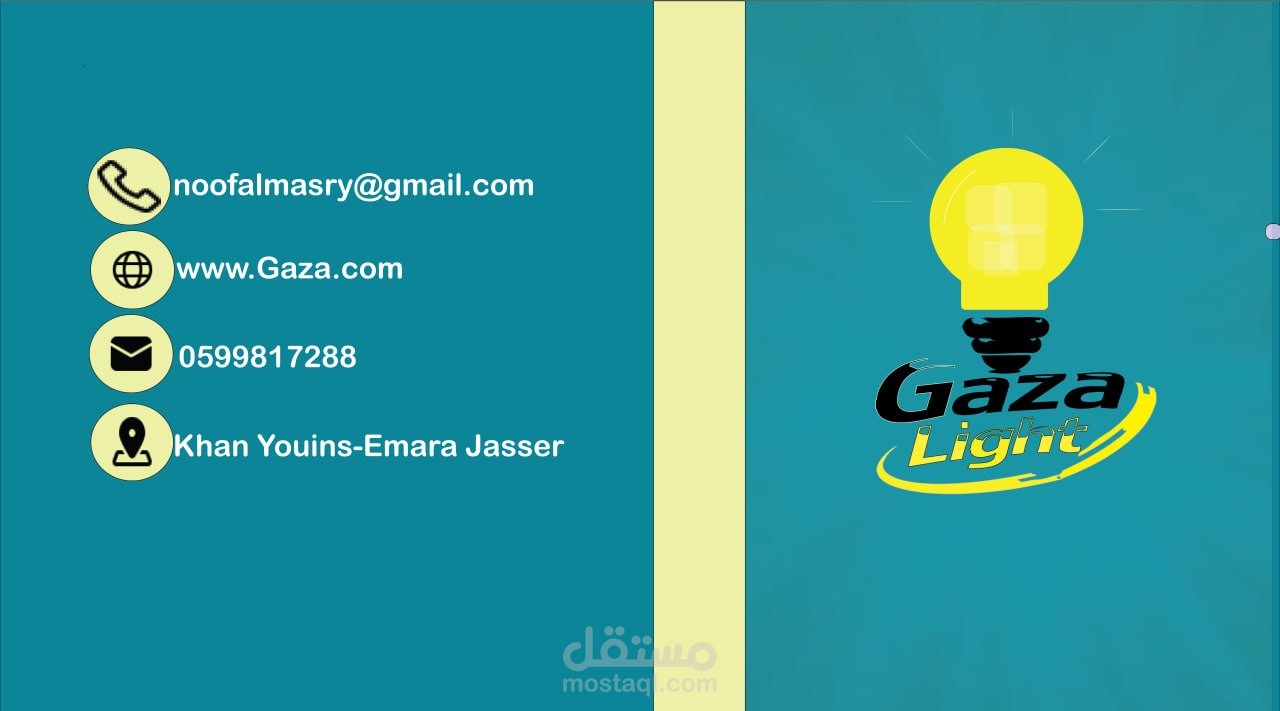 قمت بتصميم هوية بصرية متكاملة لمشروع Gaza Light، بهدف تقديم صورة احترافية تعكس طبيعة النشاط بشكل واضح وجذاب.