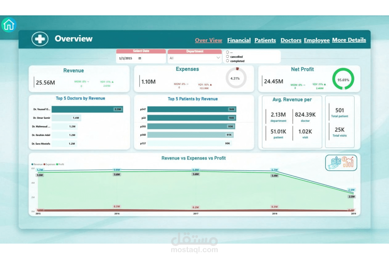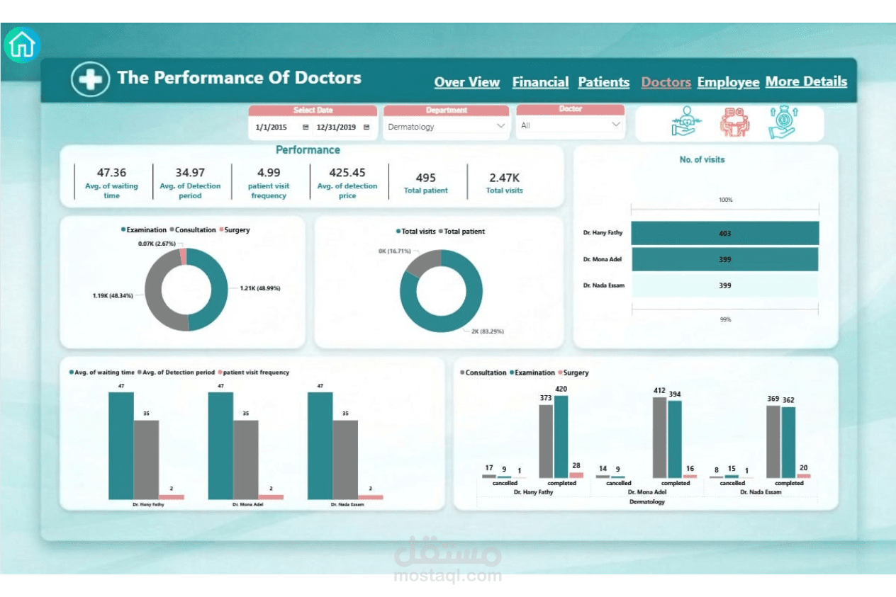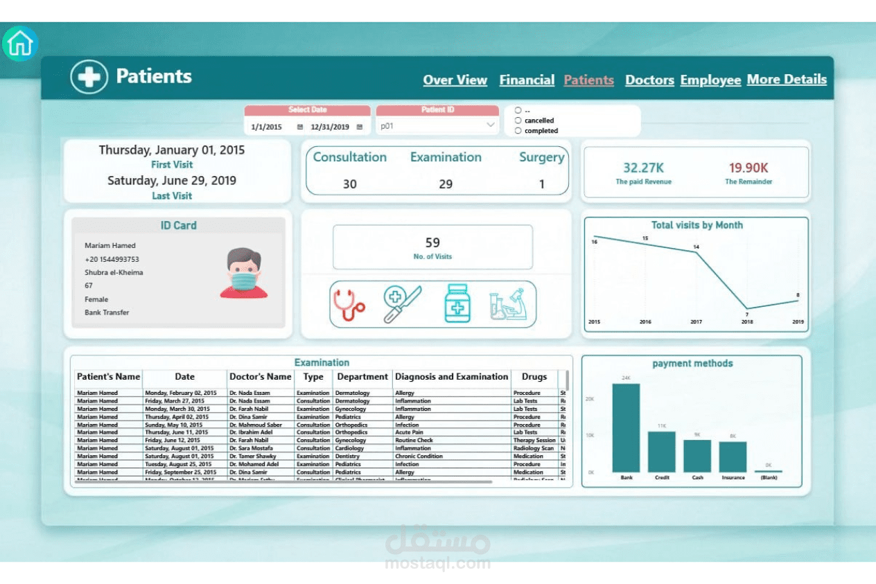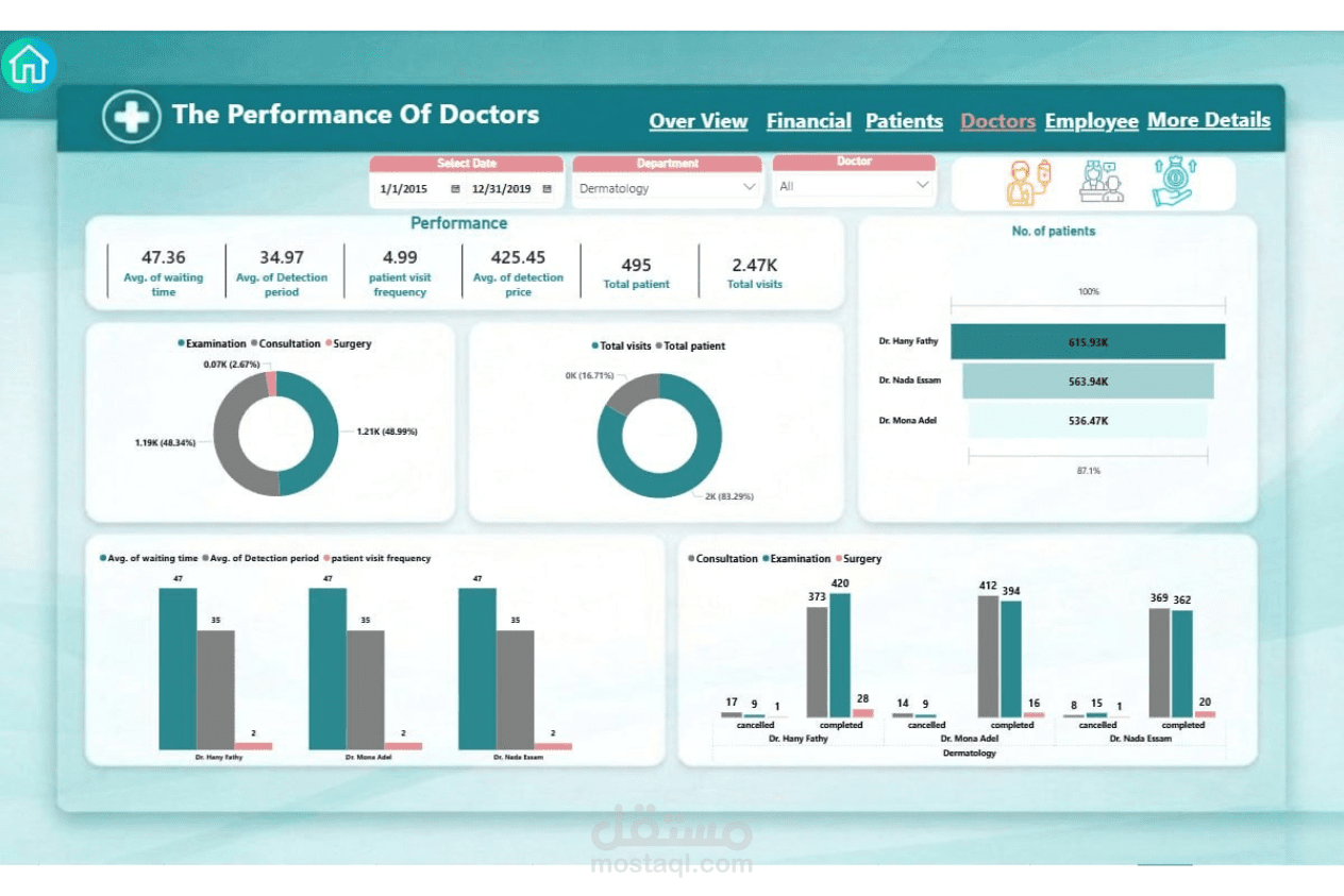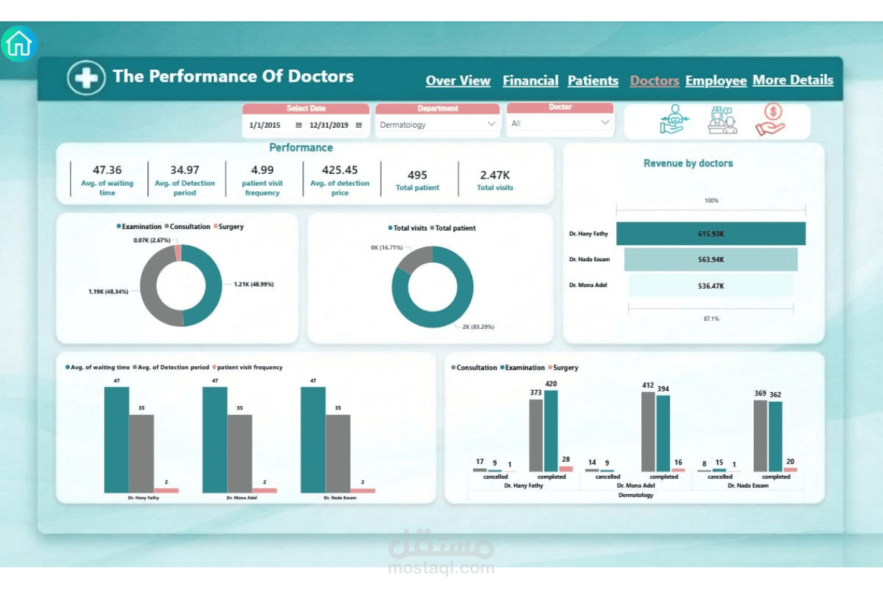 تصميم وتنفيذ نظام متكامل لإدارة مركز طبي بداية من تحليل البيانات وحتى عرضها في صورة تقارير تفاعلية، وشمل ذلك: