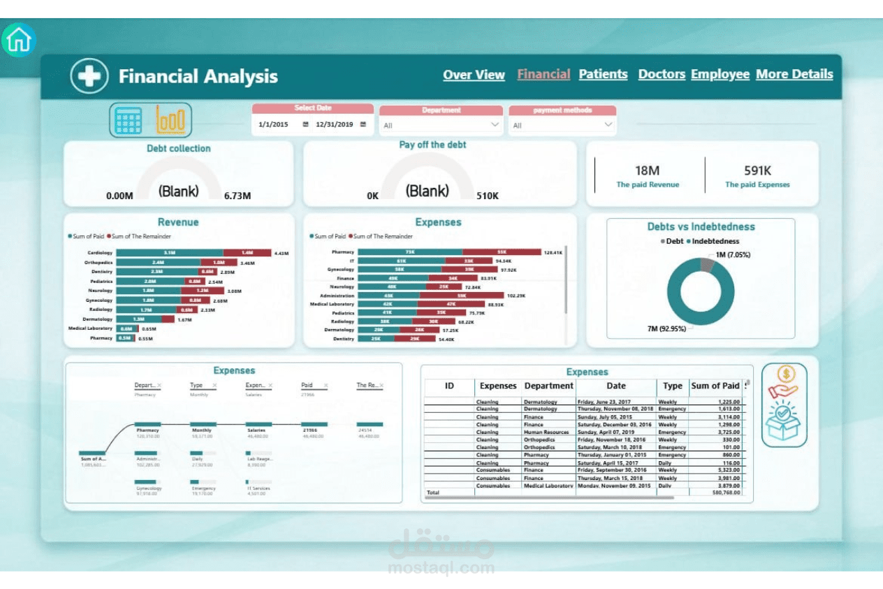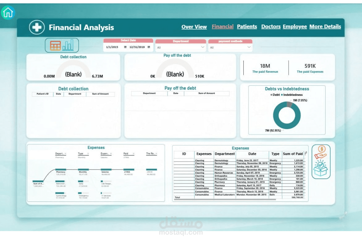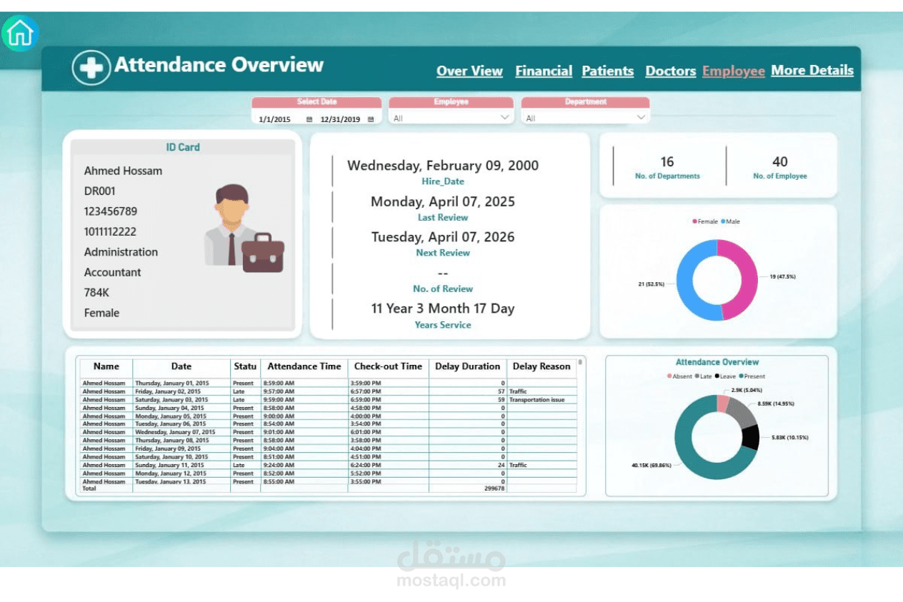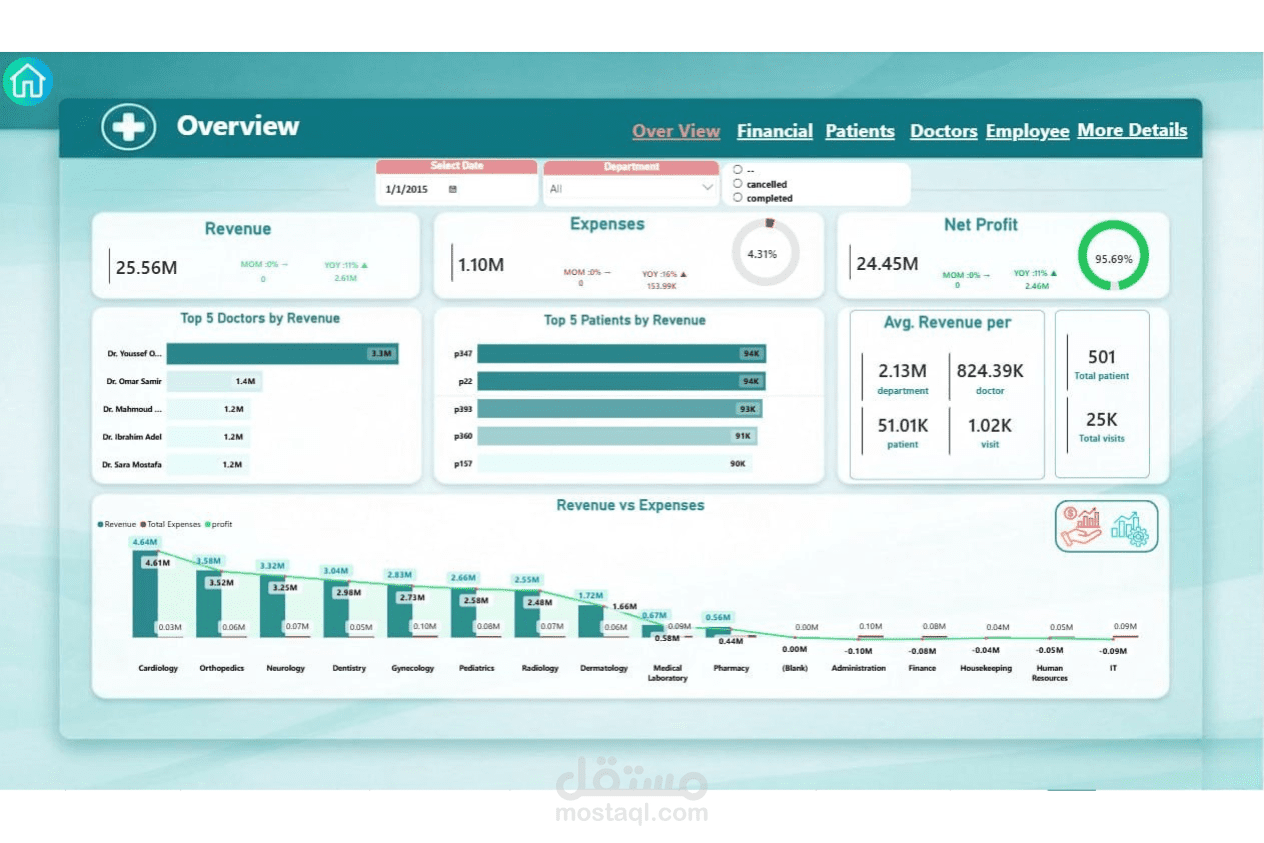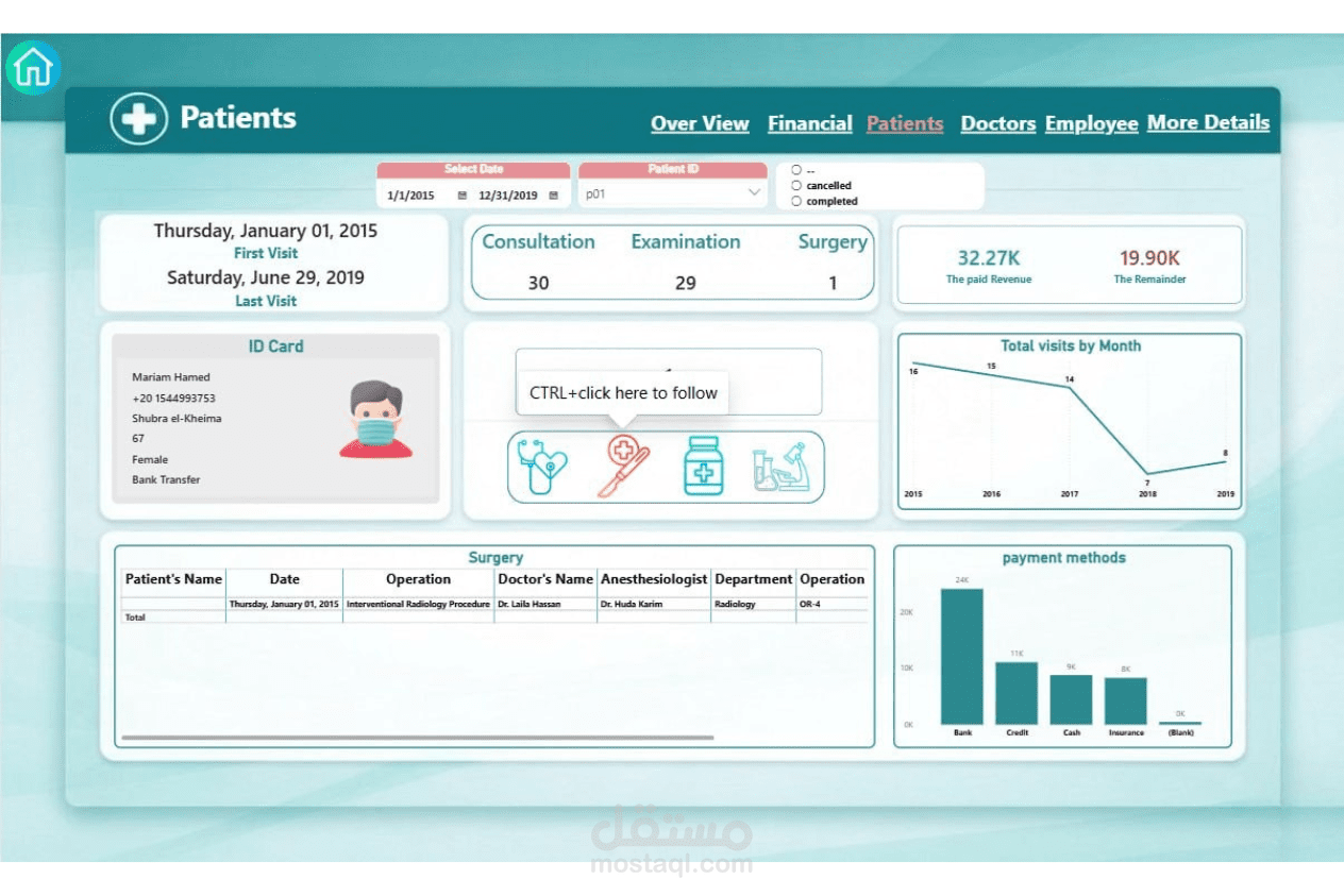 تصميم وتنفيذ نظام متكامل لإدارة مركز طبي بداية من تحليل البيانات وحتى عرضها في صورة تقارير تفاعلية، وشمل ذلك: