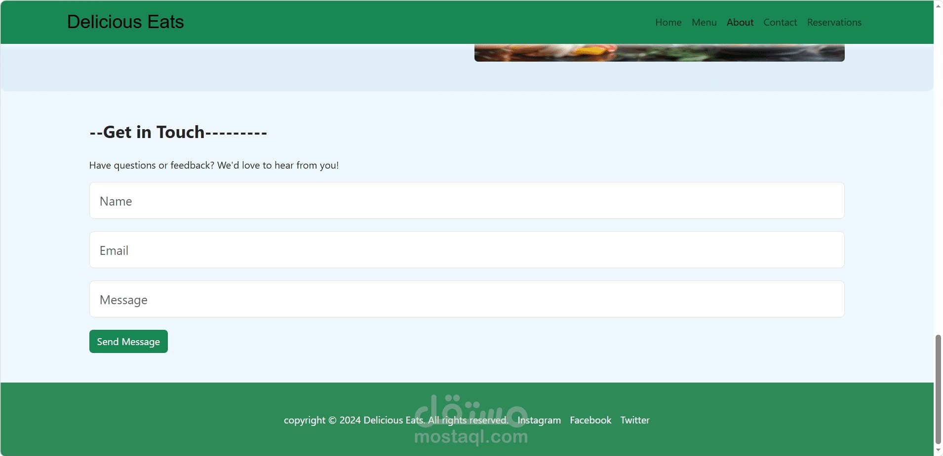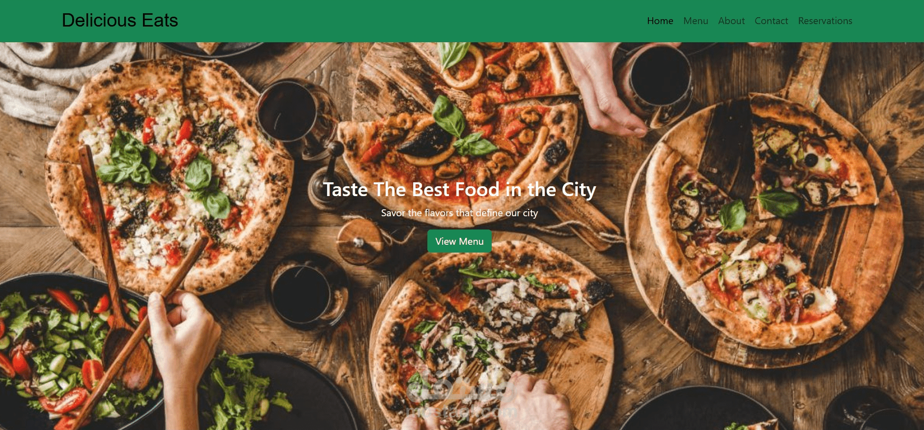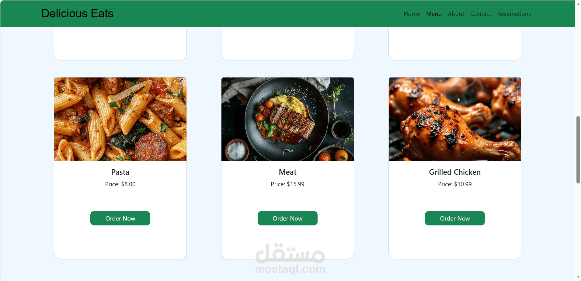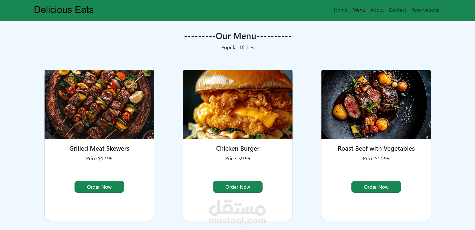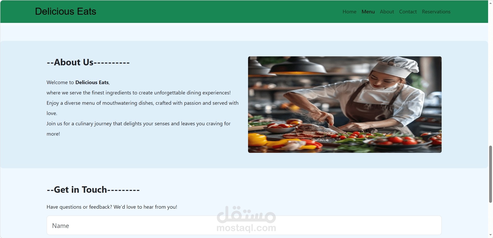 قمت بتصميم وتطوير موقع مطعم باسم Delicious Eats باستخدام تقنيات HTML, CSS, و JavaScript.
