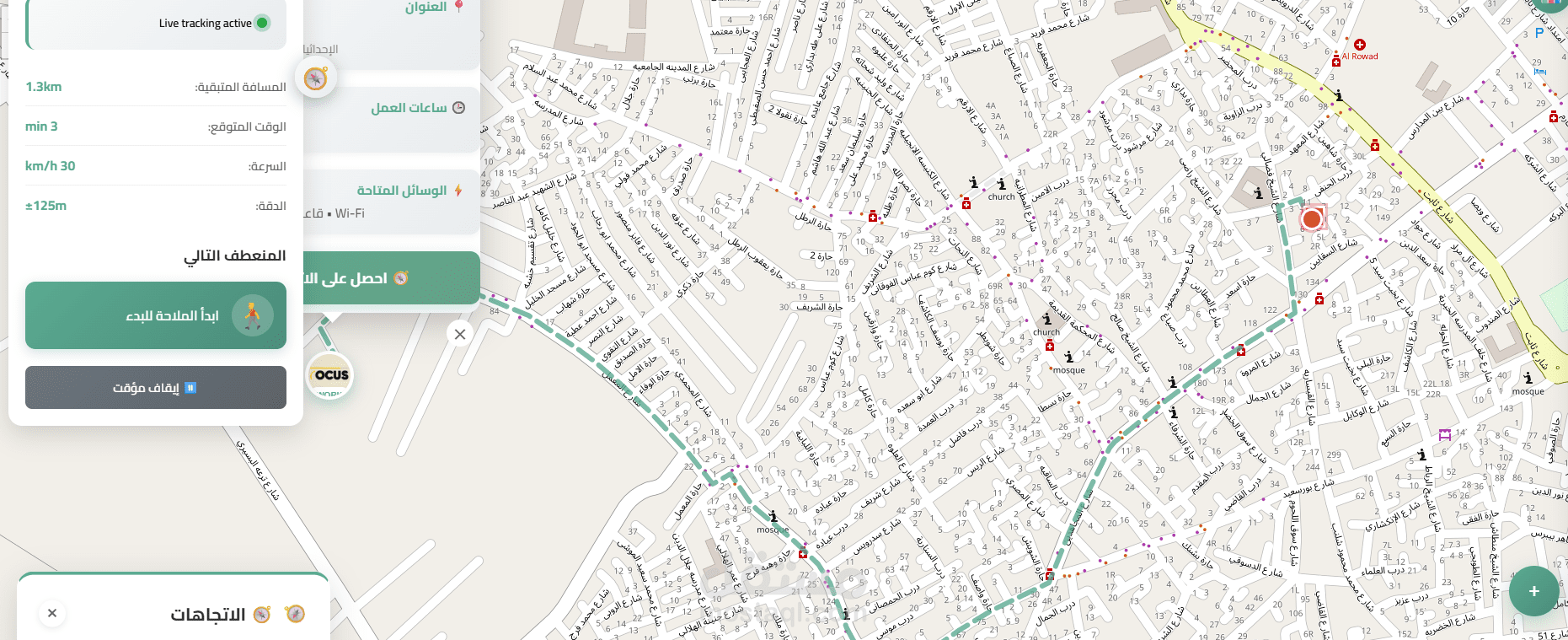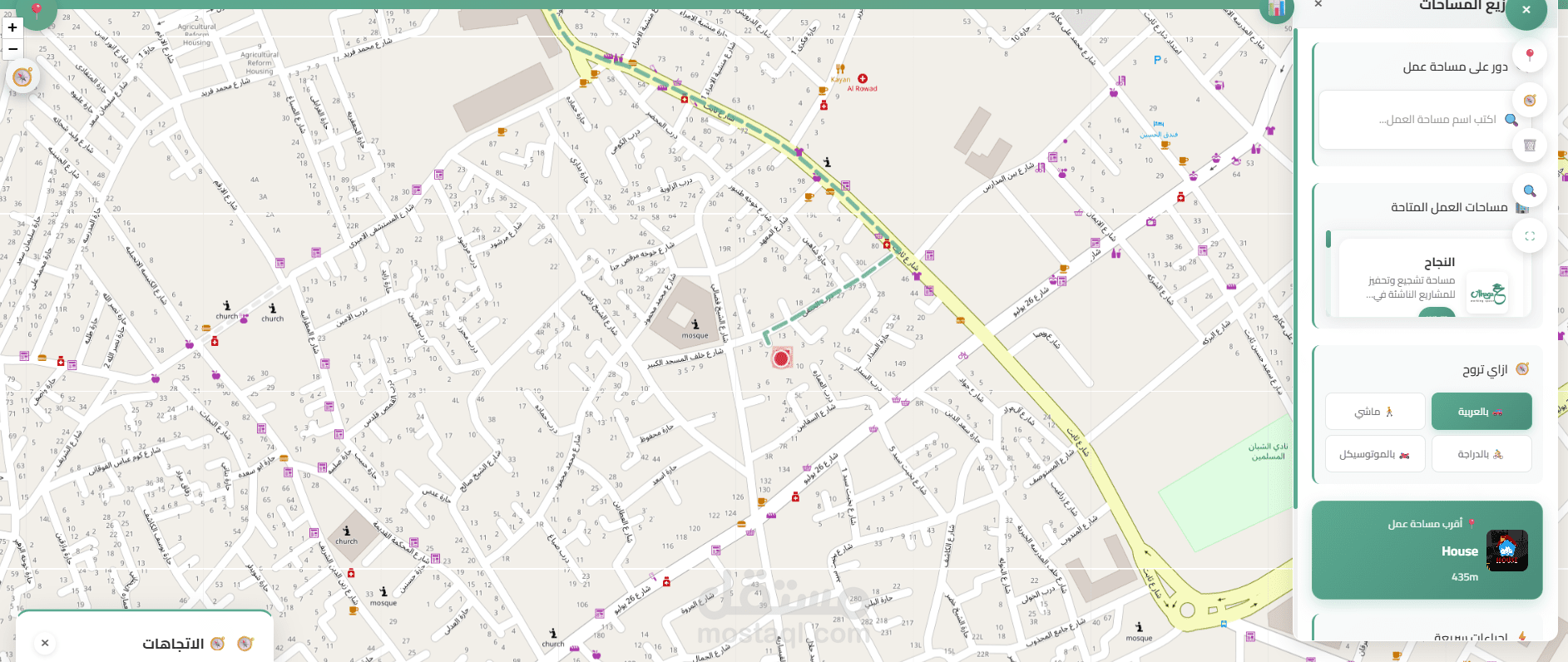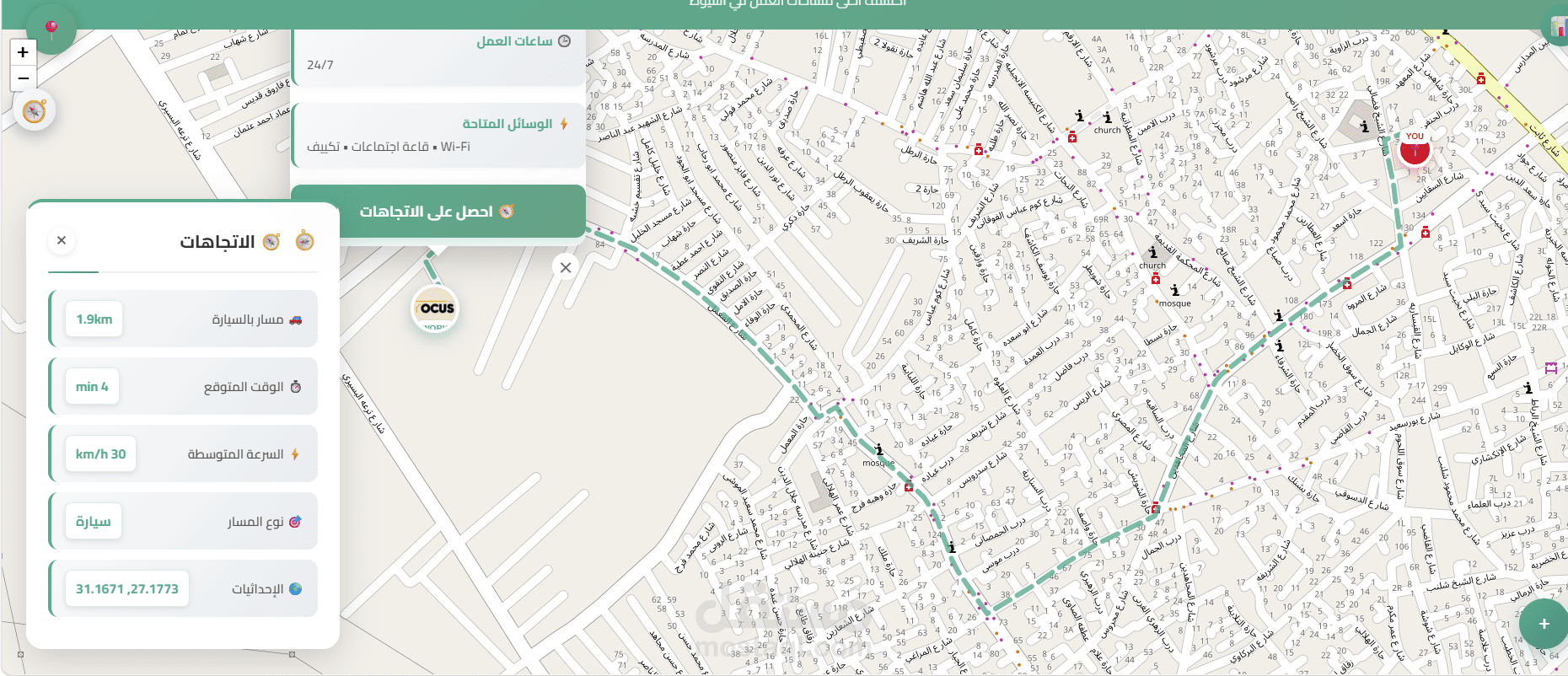 وتتميز الخريطة بالتفاعل اللحظي، حيث يتم تحديث المسار والوقت تلقائيًا عند تغيير موقع المستخدم، مما يمنحه تجربة تنقل ديناميكية تساعده على الوصول بسهولة وسرعة. بالإضافة إلى ذلك، يمكن للمستخدم استعراض تفاصيل المساحات المختلفة واختيار الأنسب له من حيث الموقع والبيئة والخدمات، بما يدعم تجربة حجز سهلة وفعالة لمساحات العمل.