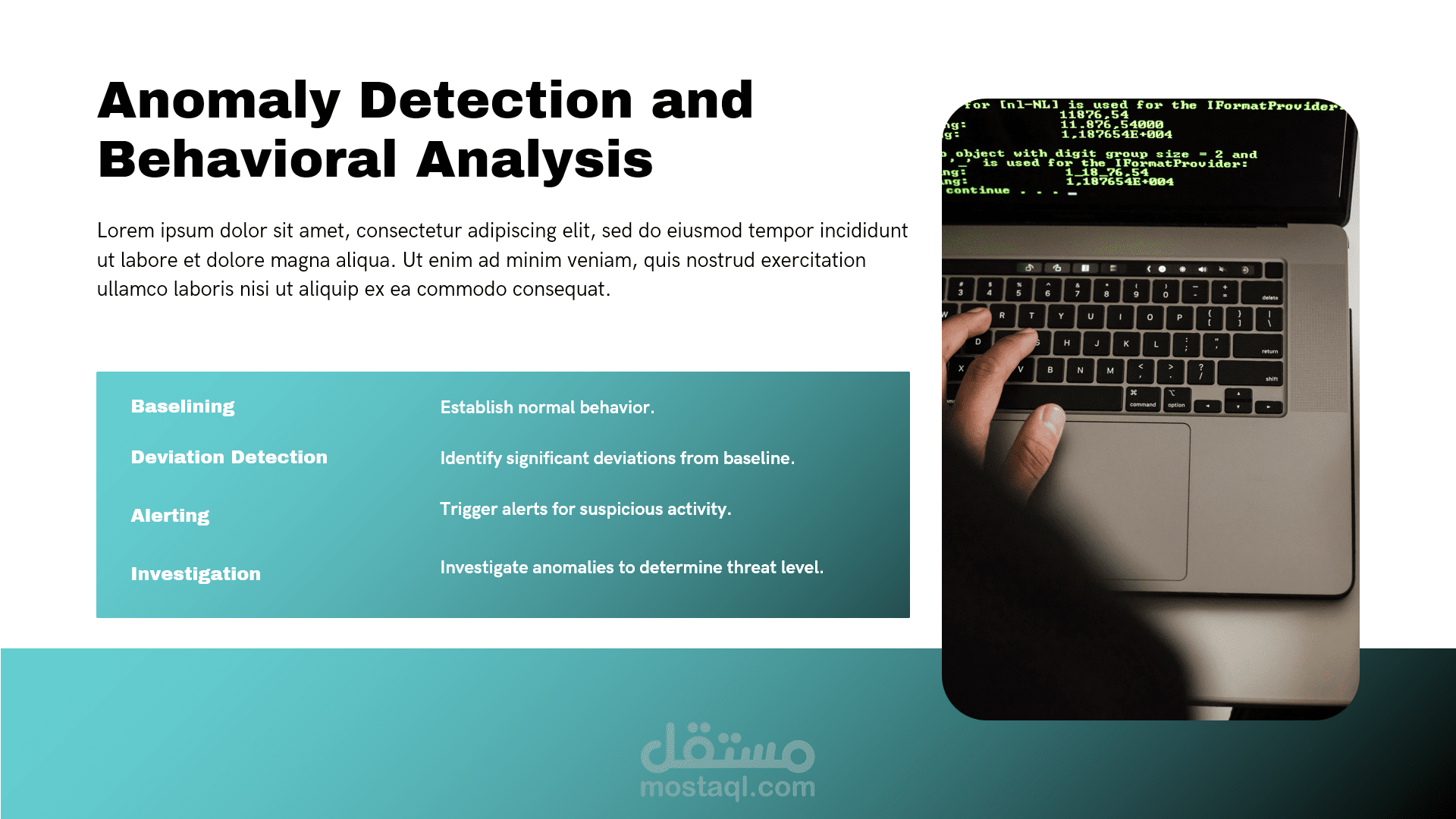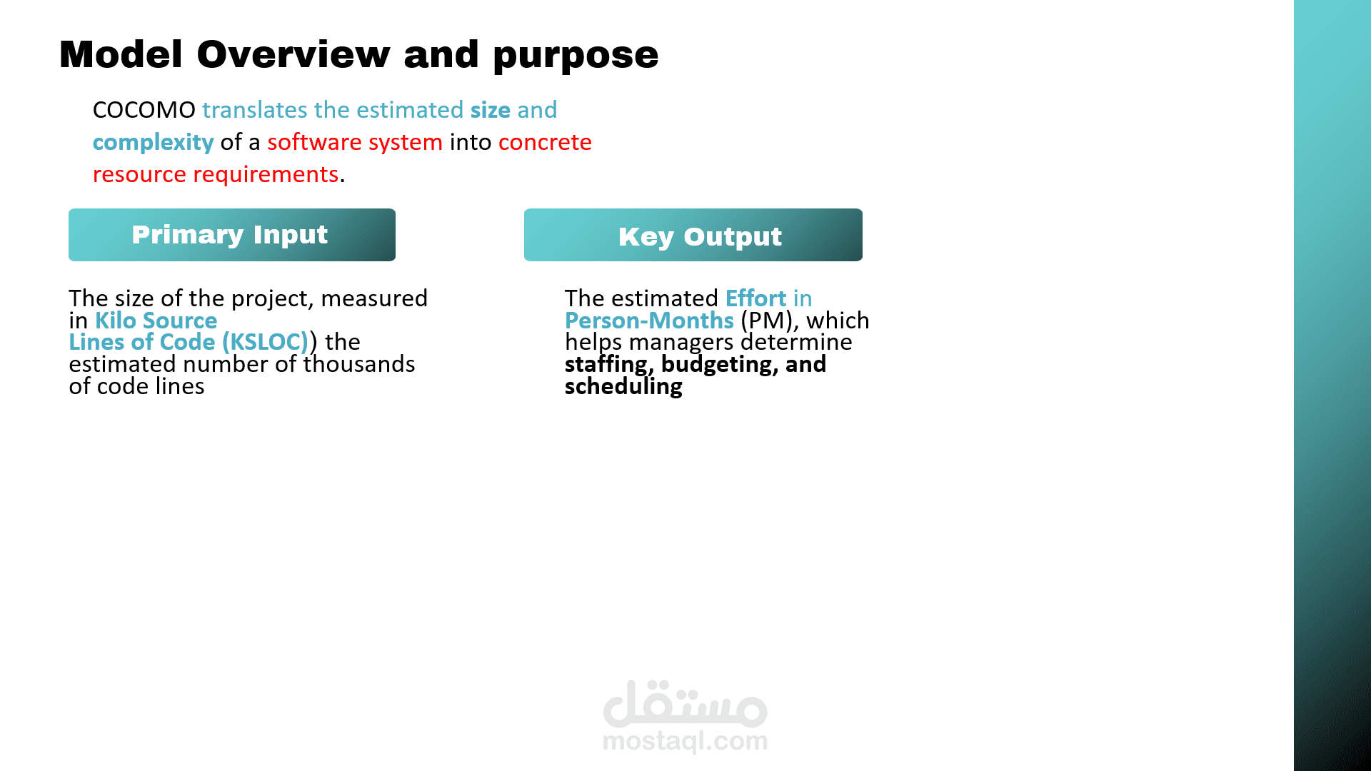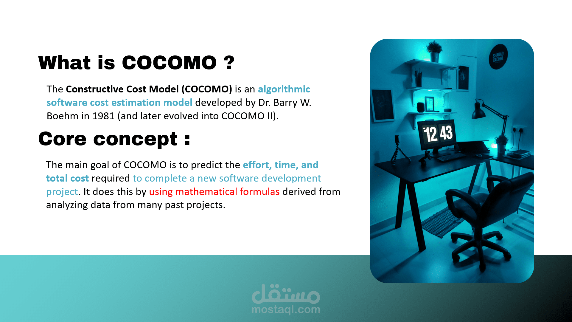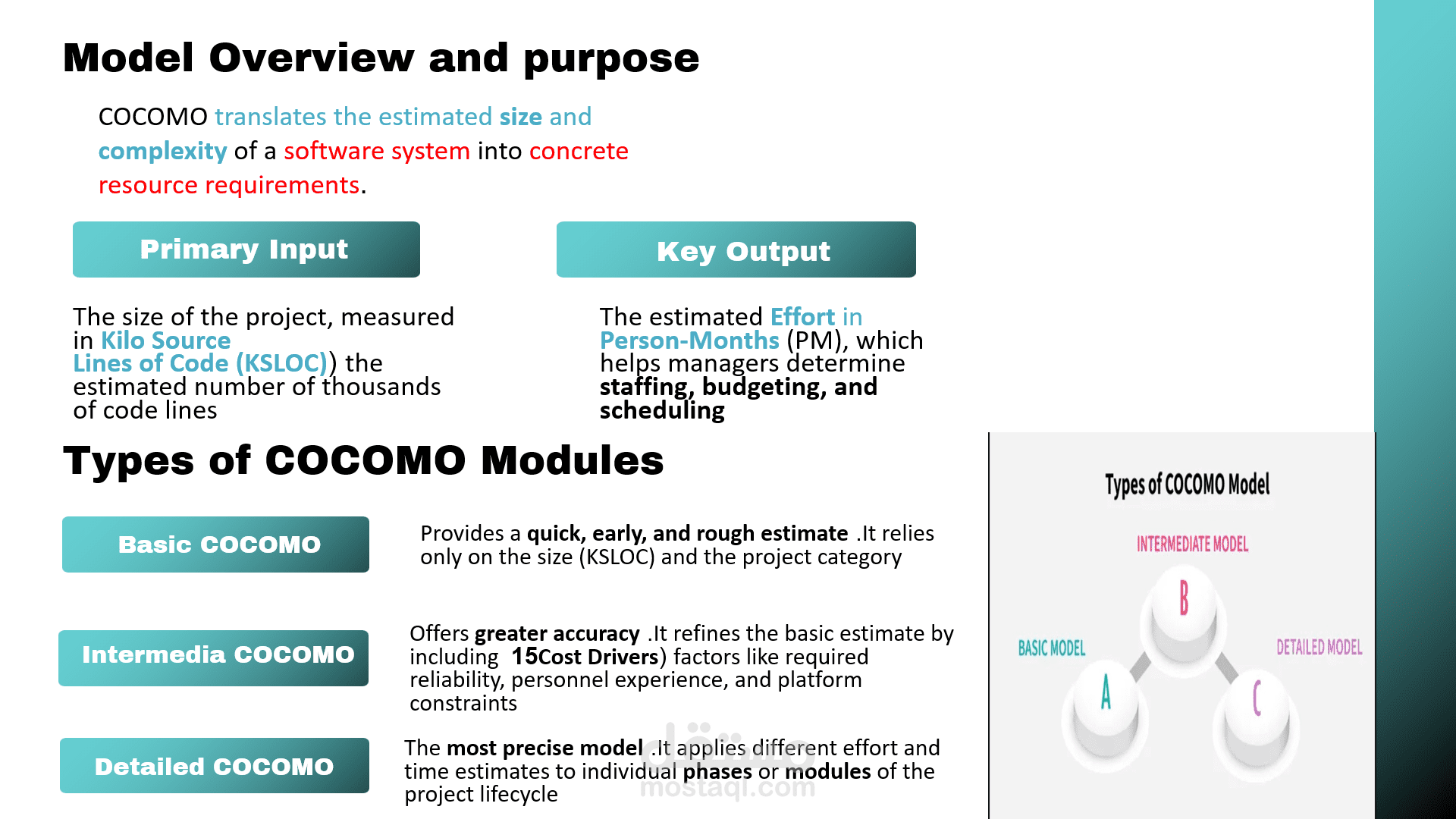يتناول هذا العرض التقديمي محورين أساسيين في هندسة البرمجيات والأمن الرقمي، حيث يقدم شرحاً مفصلاً لنموذج تقدير التكاليف (COCOMO) بالإضافة إلى استعراض التقنيات الحديثة للذكاء الاصطناعي في حماية البيانات.أبرز محاور العرض:نموذج COCOMO (The Constructive Cost Model): تعريف النموذج: مقدمة حول النموذج الخوارزمي الذي طوره الدكتور باري بوم لتقدير تكاليف الجهد والوقت للمشاريع البرمجية.أهداف النموذج: كيفية التنبؤ بالموارد المطلوبة بناءً على تحليل بيانات مشاريع سابقة.المدخلات والمخرجات: الاعتماد على حجم المشروع بمقياس (KSLOC) لإنتاج تقديرات دقيقة للجهد البشري بالأشهر (Person-Months).مستويات النموذج: شرح الفروقات بين المستويات الثلاثة: الأساسي (Basic)، الوسيط (Intermediate)، والتفصيلي (Detailed).الذكاء الاصطناعي في الأمن السيبراني: تعزيز الحماية: دور الذكاء الاصطناعي في الكشف التلقائي عن التهديدات والوقاية الاستباقية منها.خوارزميات التعلم الآلي: استعراض تطبيقات التعلم الخاضع للإشراف (Supervised)، غير الخاضع للإشراف (Unsupervised)، والتعلم المعزز (Reinforcement Learning) في رصد الاختراقات.تحليل السلوك (Behavioral Analysis): استخدام النمذجة الإحصائية لتحديد الانحرافات عن السلوك الطبيعي وإطلاق الإنذارات.مستقبل الأمن الرقمي: استشراف مستقبل الشراكة بين الإنسان والذكاء الاصطناعي في الاستجابة السريعة للحوادث الأمنية.
