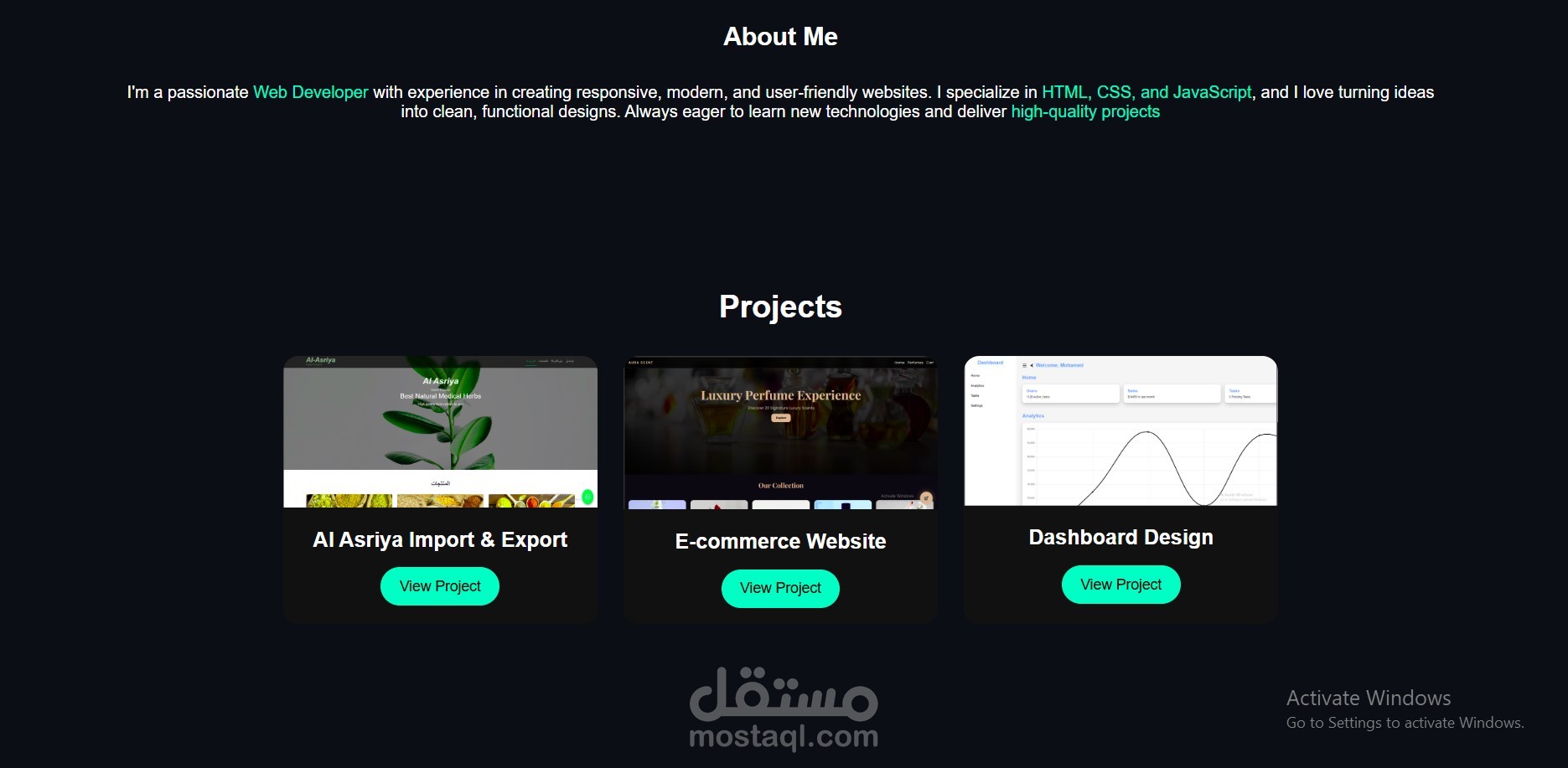 موقع شخصي لعرض الأعمال والمهارات بشكل جميل واحترافي مع تصميم متجاوب وسريع.