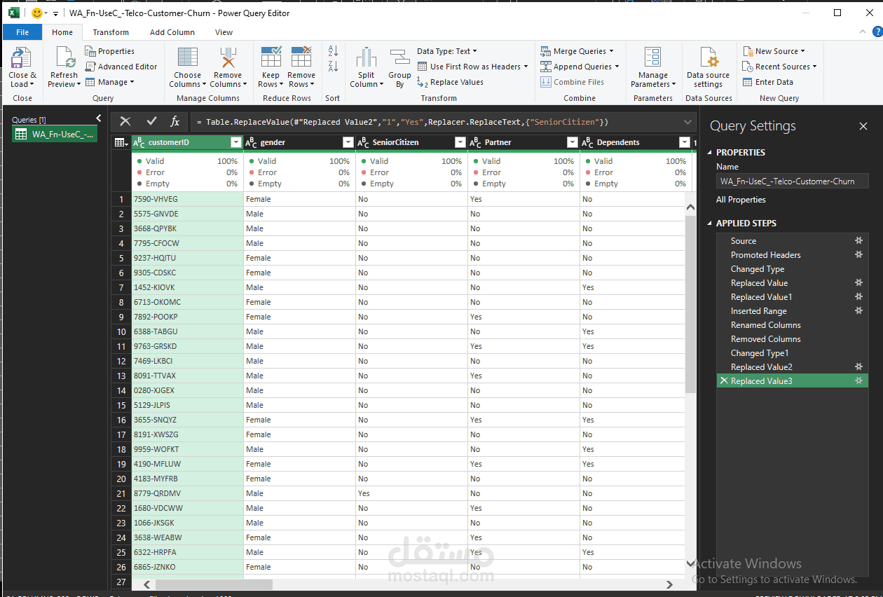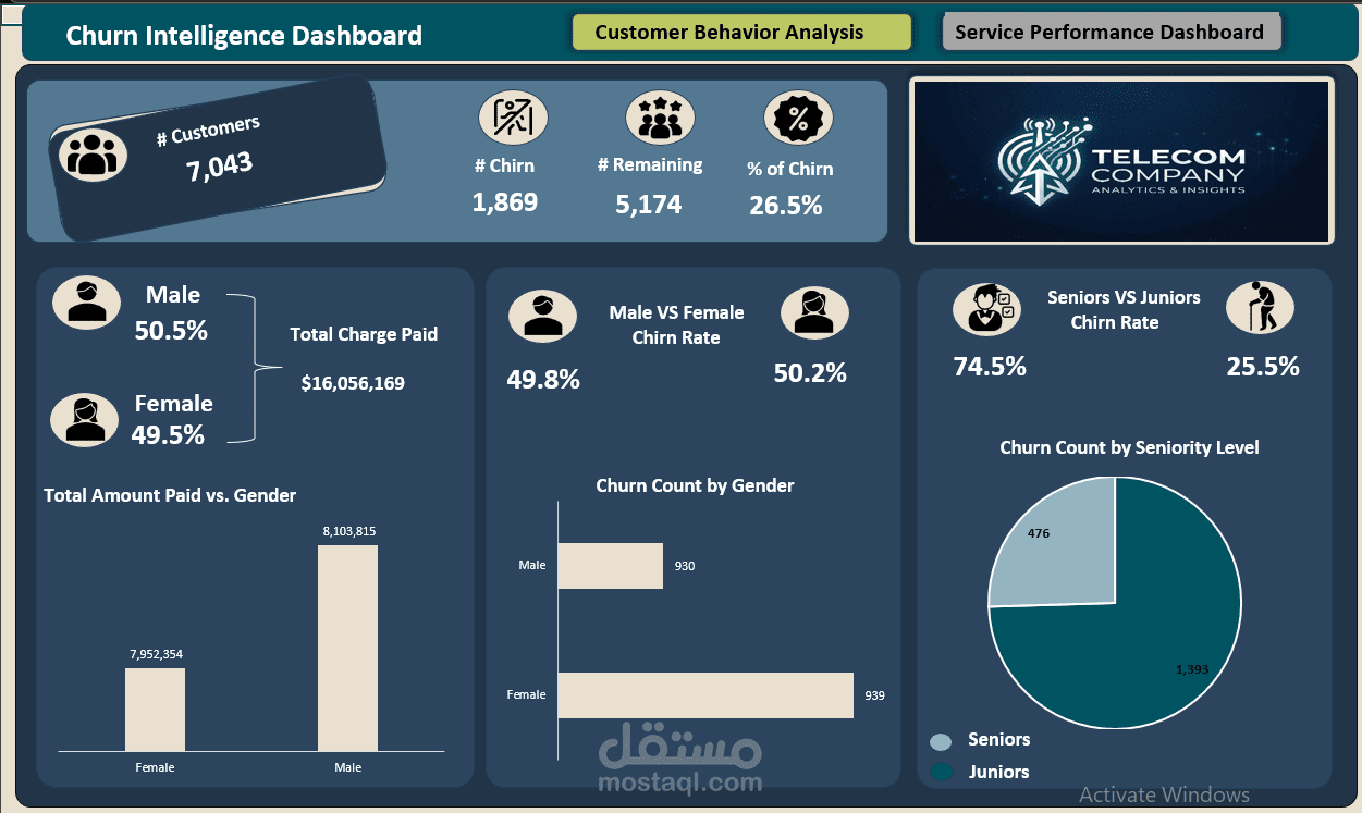 تتبع مؤشرات الفقد (Churn KPIs): رصد إجمالي العملاء (7,043) وحساب نسبة الفقد بدقة (26.5%)، مما يعطي إنذاراً فورياً للإدارة حول جودة الاستبقاء.