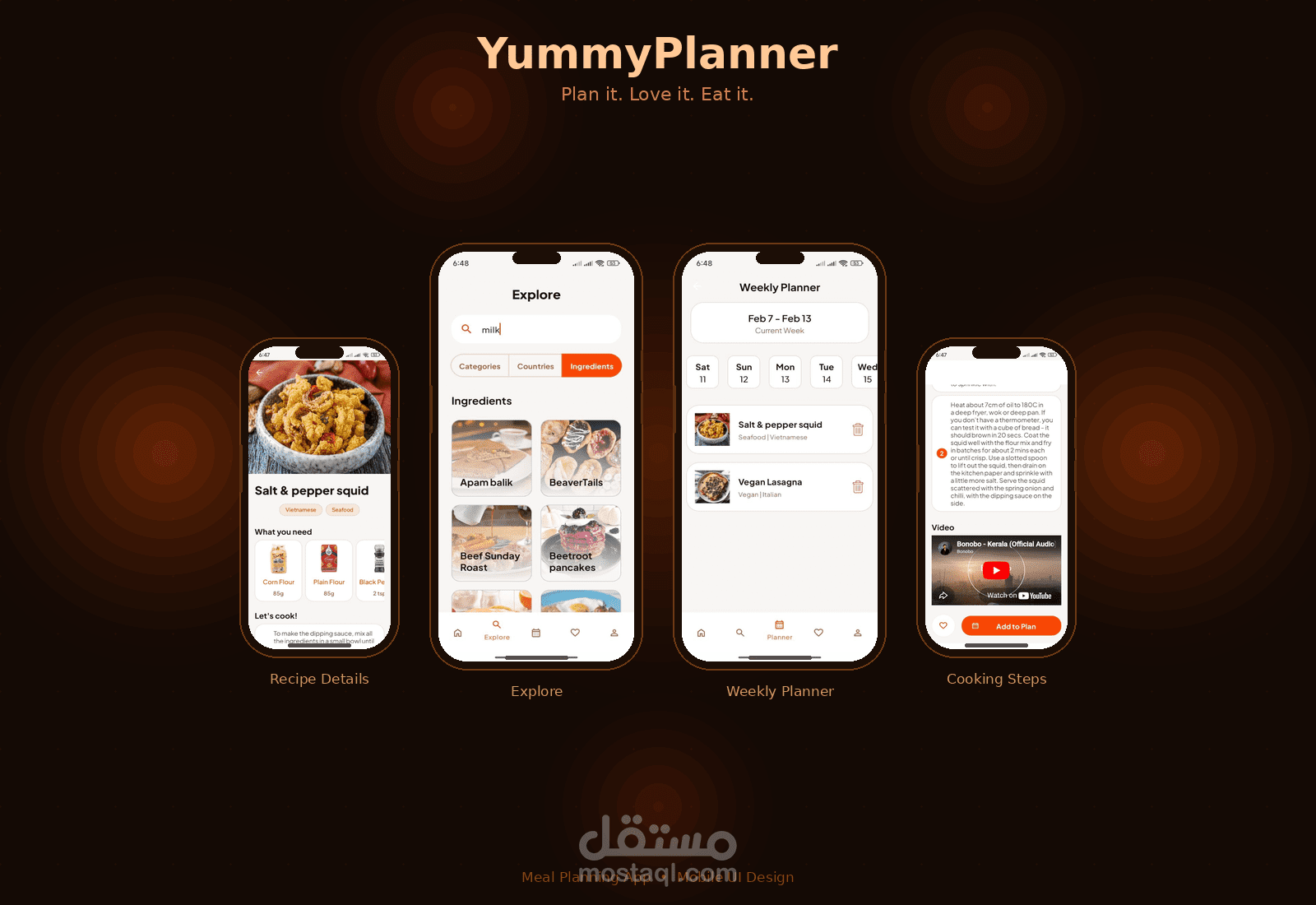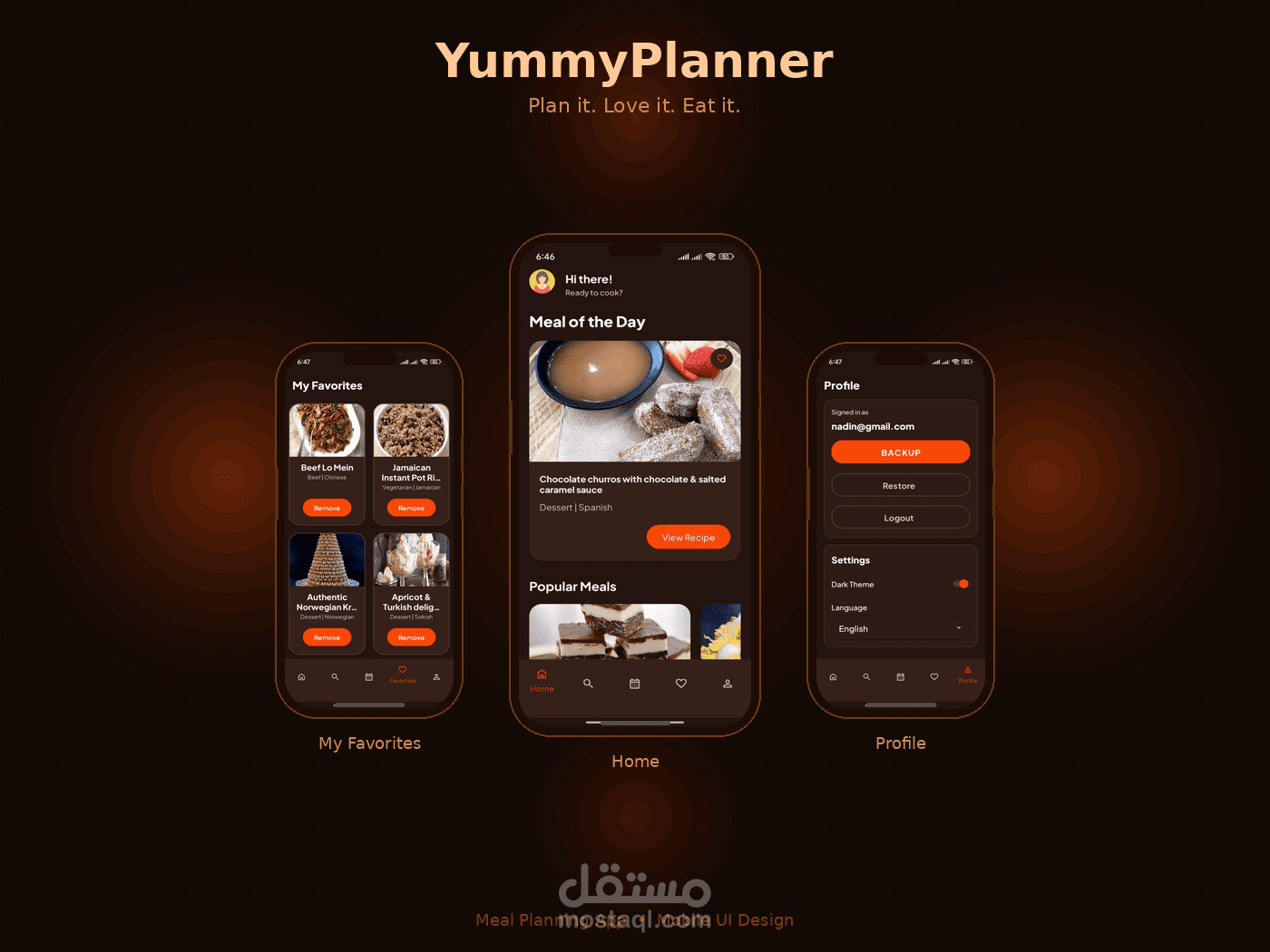 يمكن حفظ الوصفات في Favorites وتنظيم الوجبات عبر Meal Planner. يدعم User Accounts باستخدام Firebase Authentication مع توفر Guest Mode. كما يوفر Dark Theme ويدعم Localization بالعربية والإنجليزية.