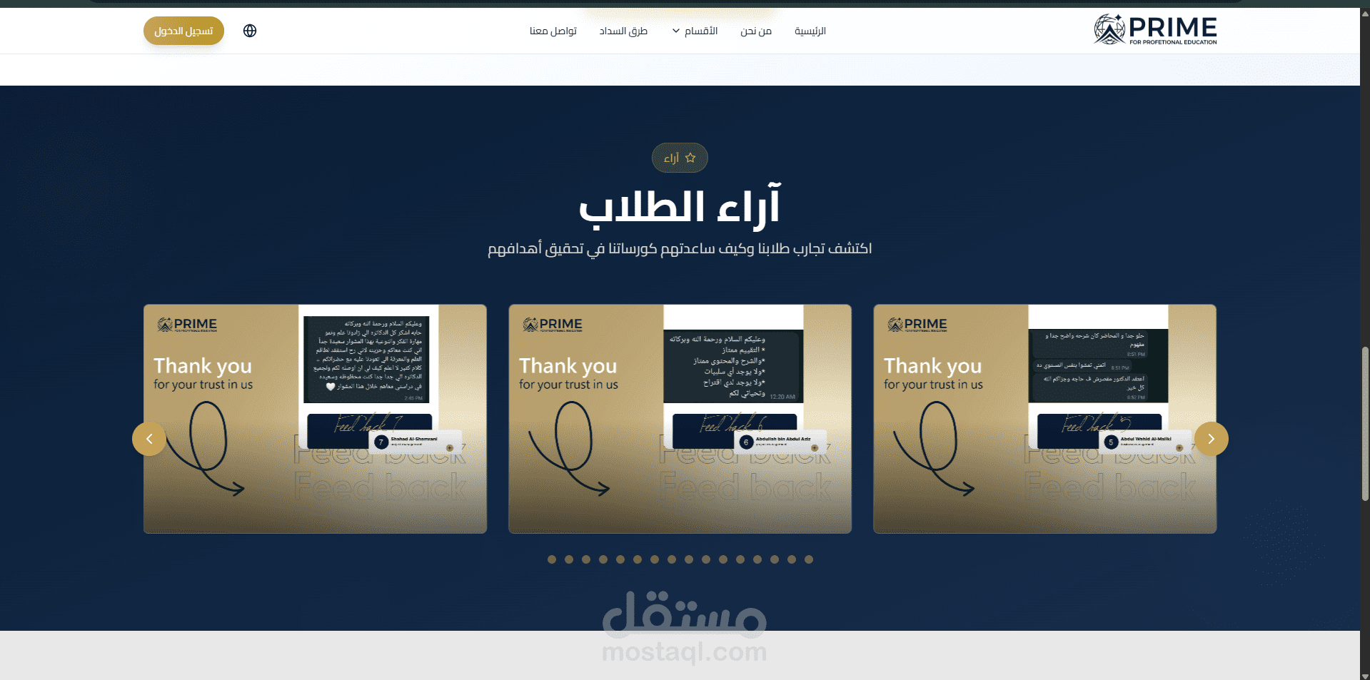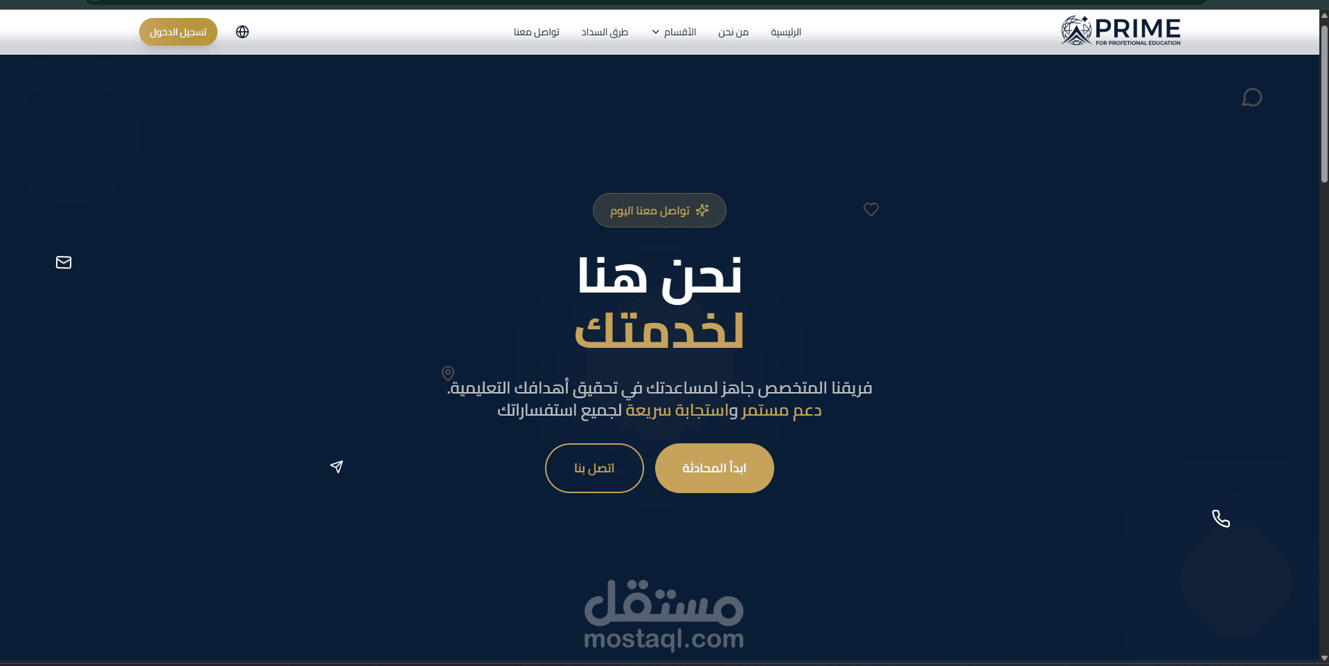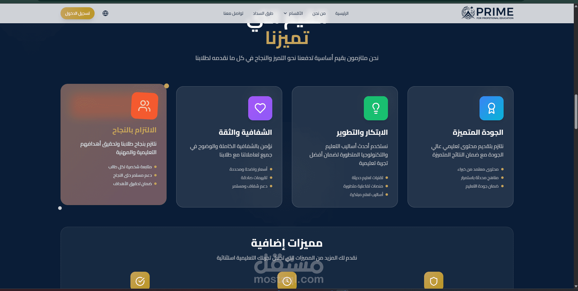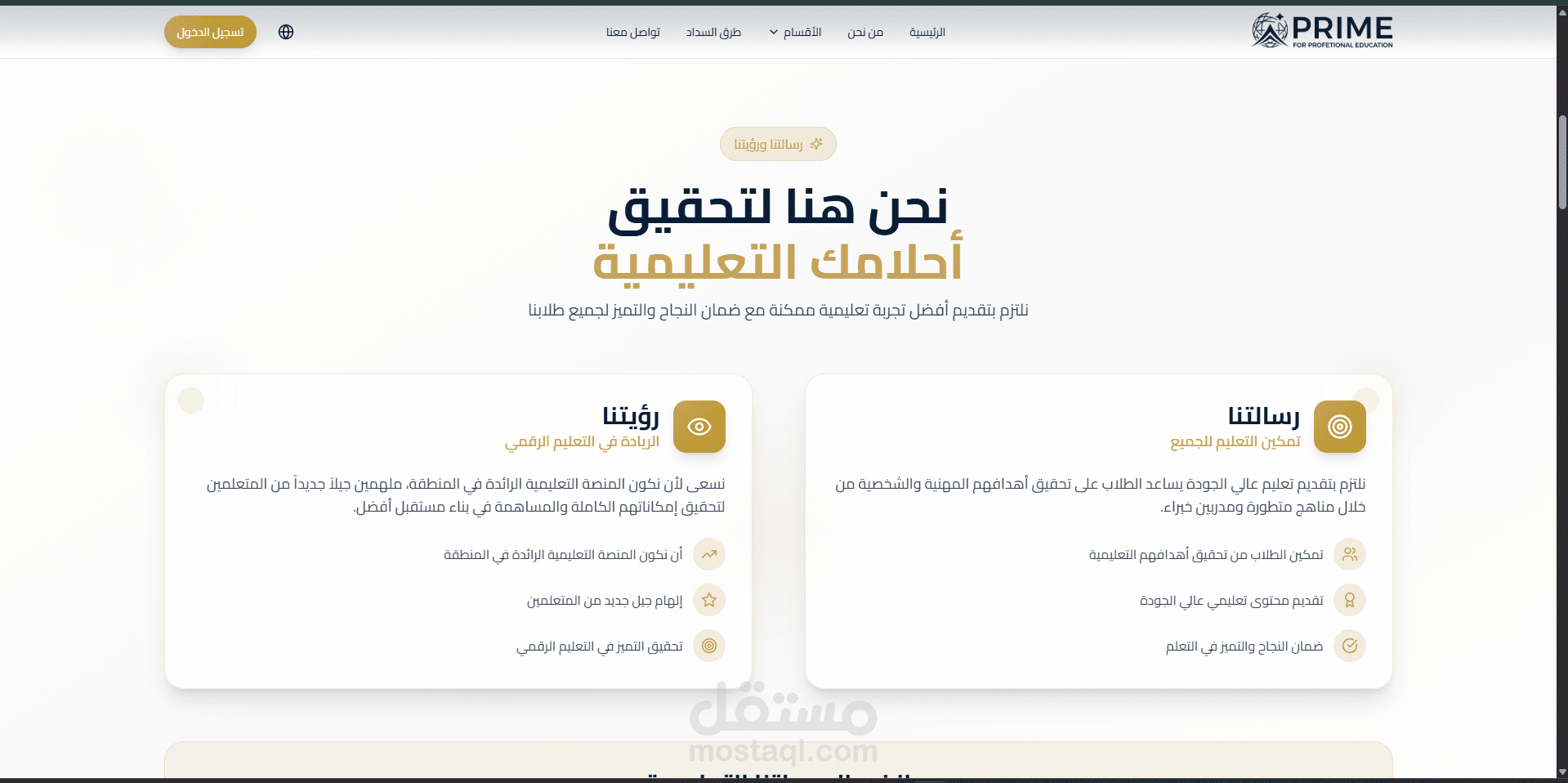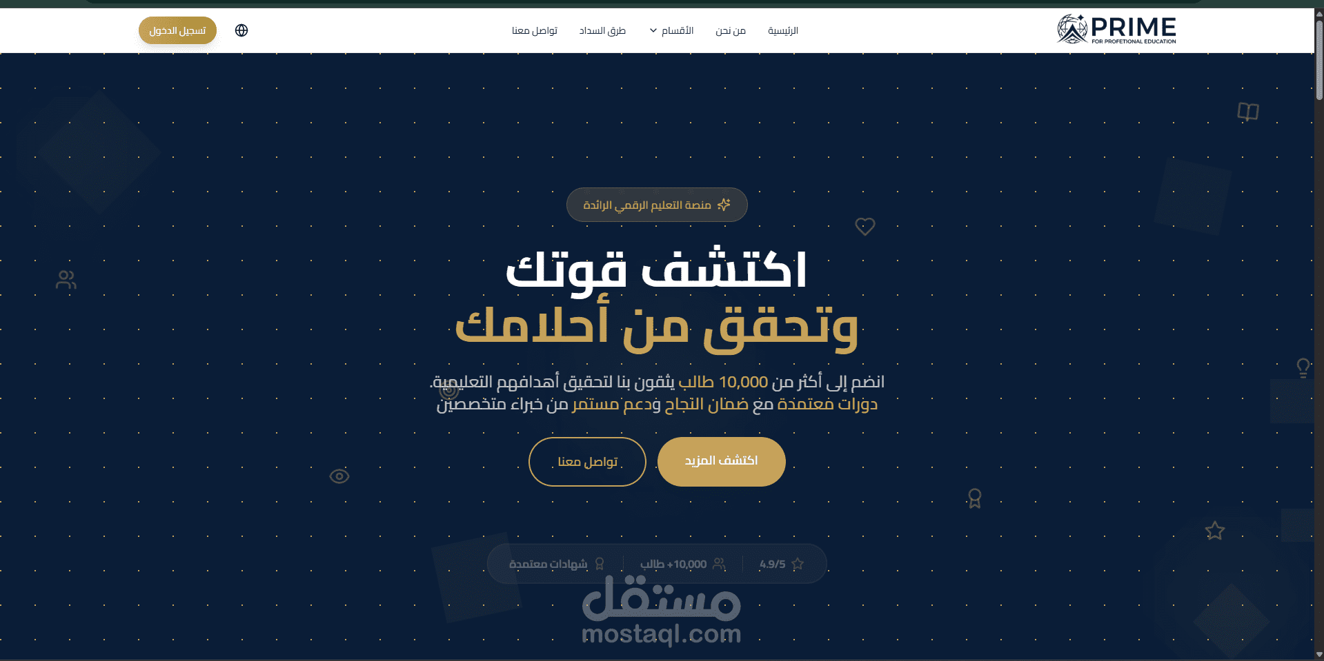 Prime Education Platform هو موقع تعليمي احترافي متكامل يهدف إلى تقديم تجربة تعليمية رقمية مميزة تُمكّن المستخدمين من استكشاف الدورات التدريبية والتخصصات الأكاديمية بسهولة، مع واجهة استخدام حديثة وتصميم جذاب يعكس جودة المحتوى التعليمي. تم تطوير الموقع باستخدام Next.js لإنشاء Frontend سريع ومحسّن لمحركات البحث (SEO) مع الاعتماد على تقنيات Server Side Rendering (SSR) و Static Site Generation (SSG) لتحسين سرعة تحميل الصفحات وتقديم أداء عالي وتجربة مستخدم سلسة.